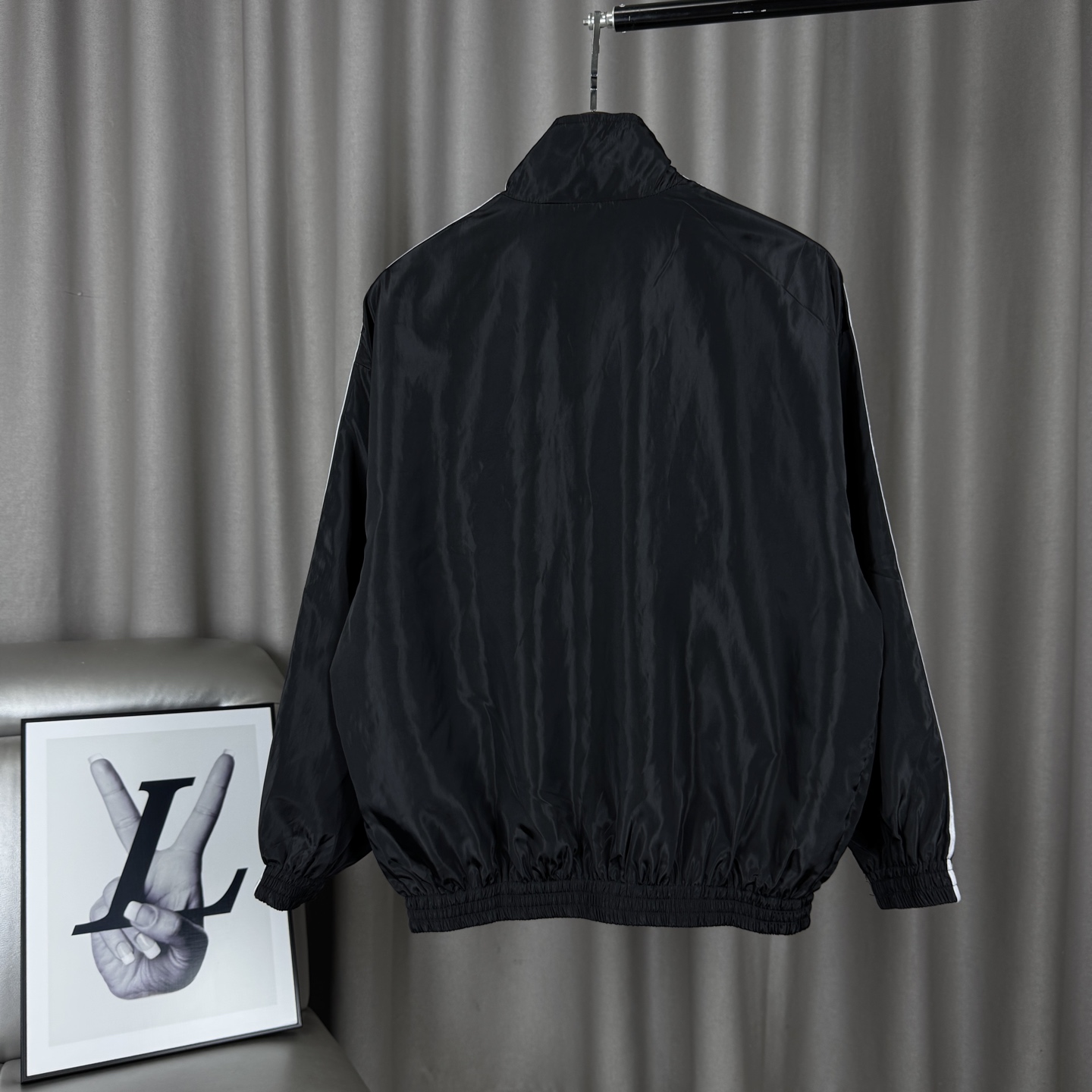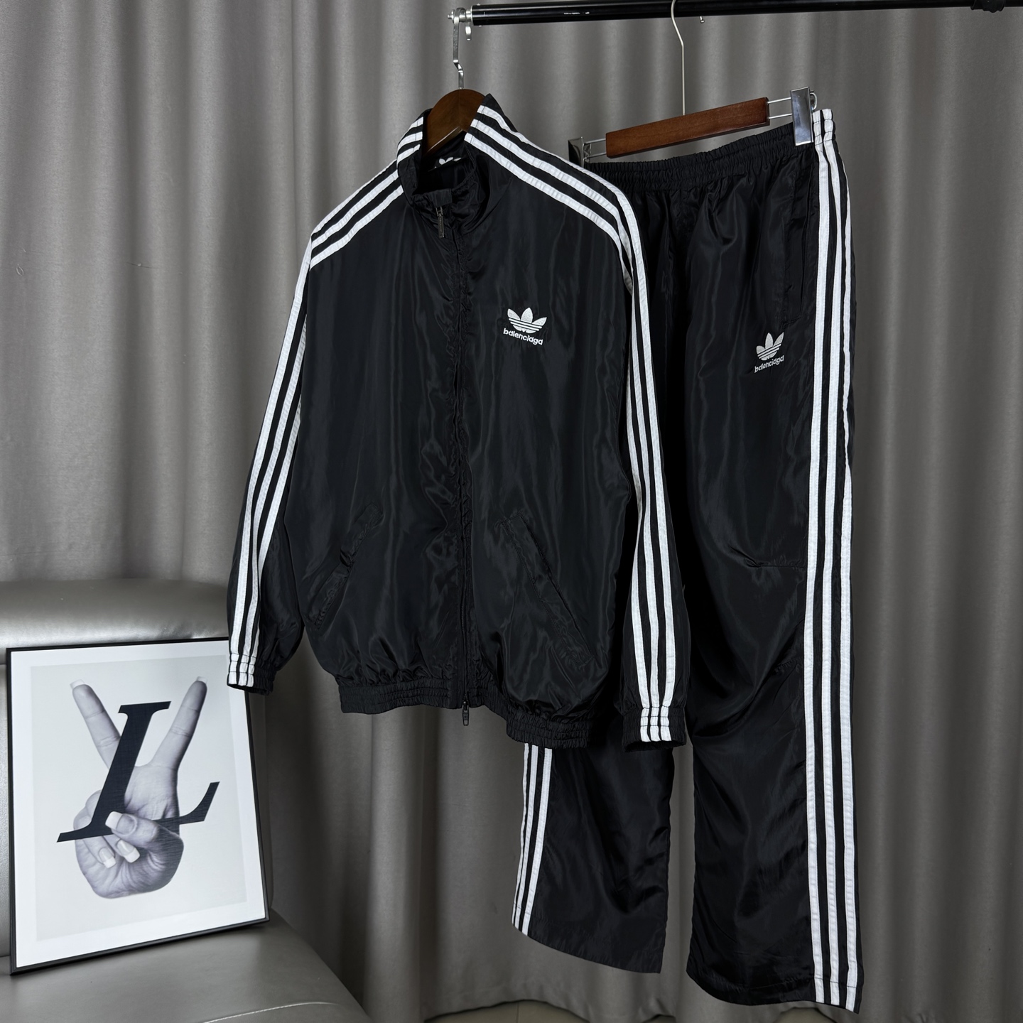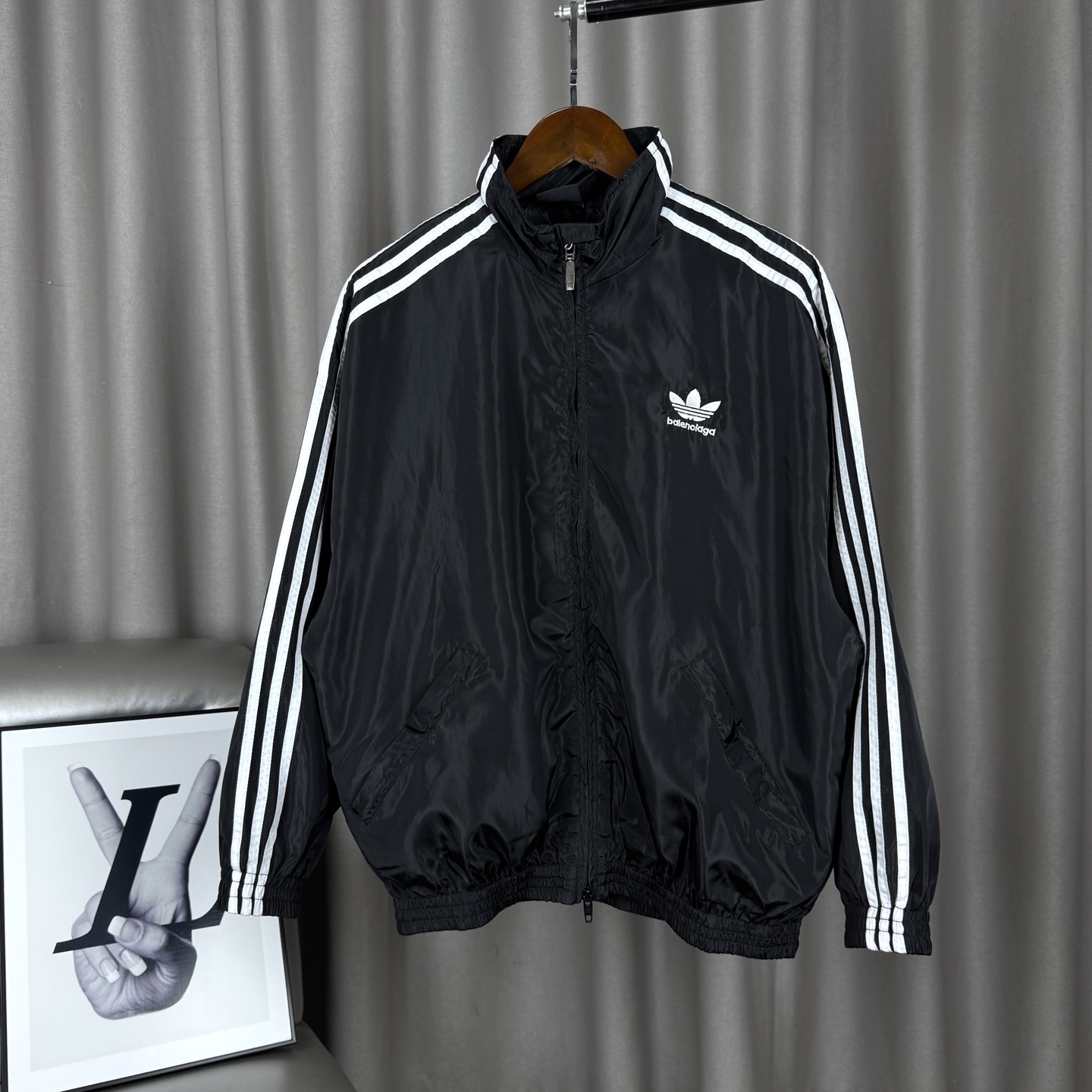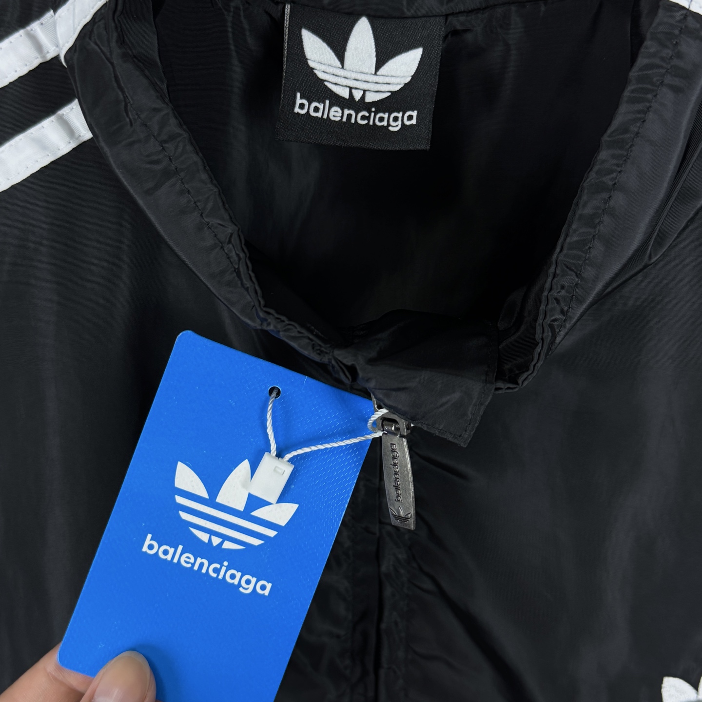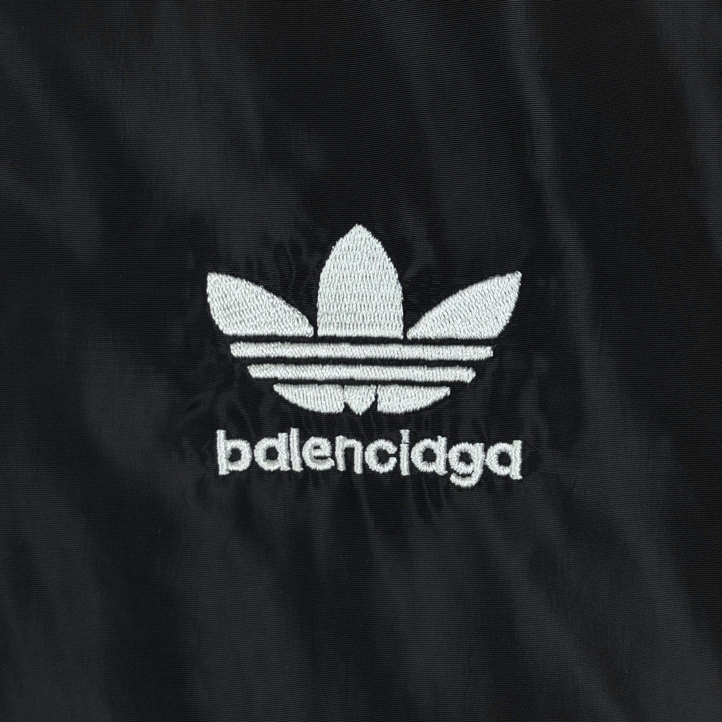 Balenciaga x Adidas collab jacket. Embroidered logo, stand collar, zipper, 4 pockets. Black. Sizes M-XL.