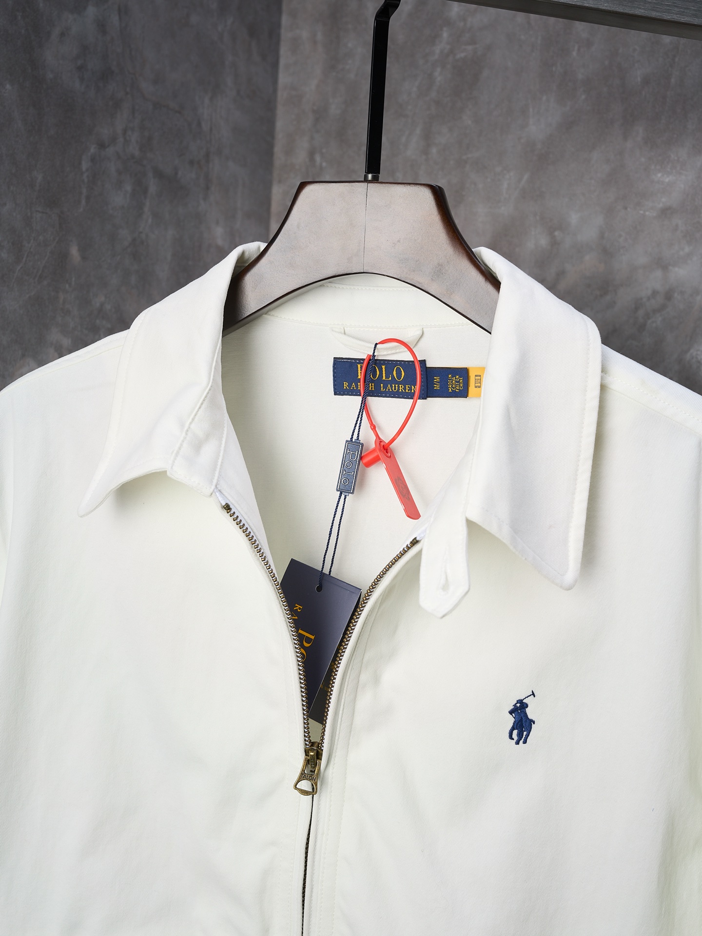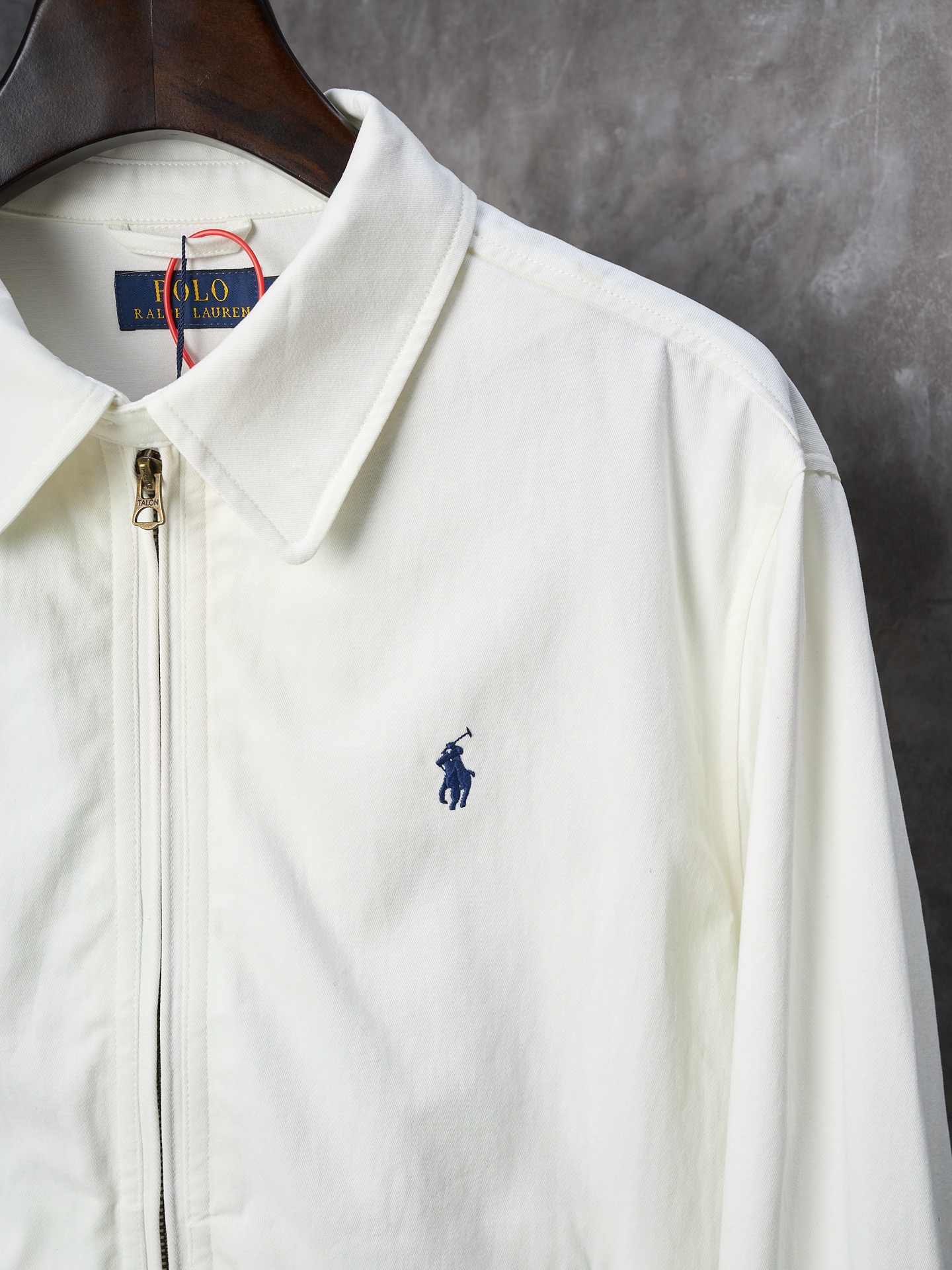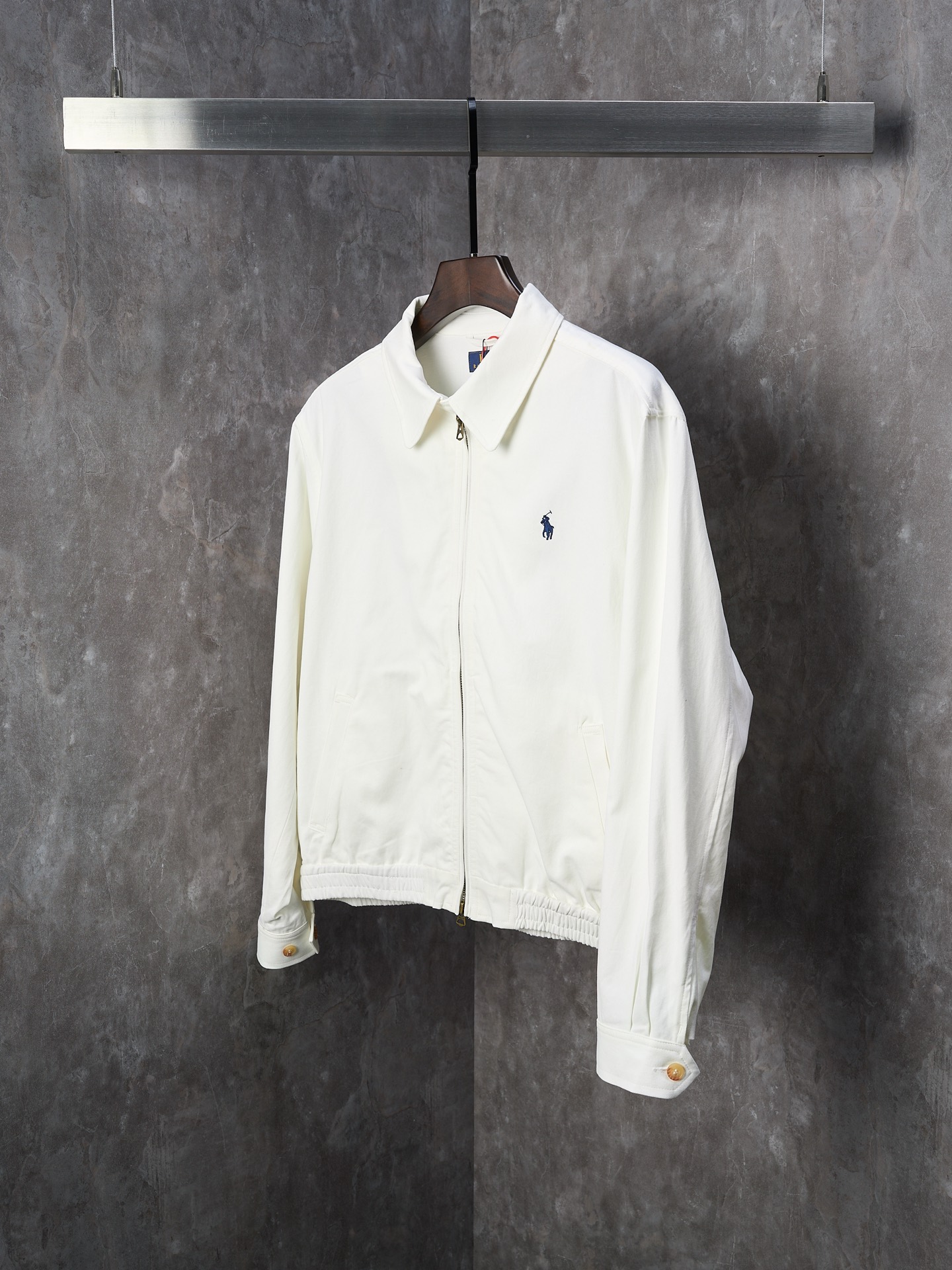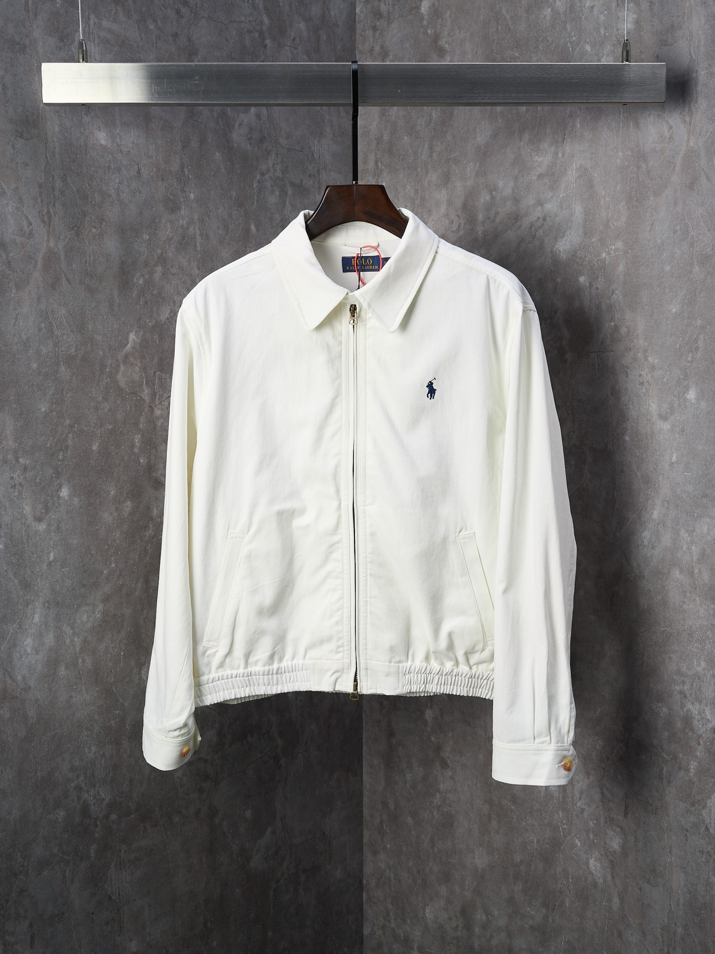 Ralph Lauren blue pony emblem embroidered zip-up jacket. Available in S, M, L, XL. Custom white twill cotton, soft & smooth. Imported embroidery, precise pockets, elastic hem. Pre-washed fabric, retains shape & color.