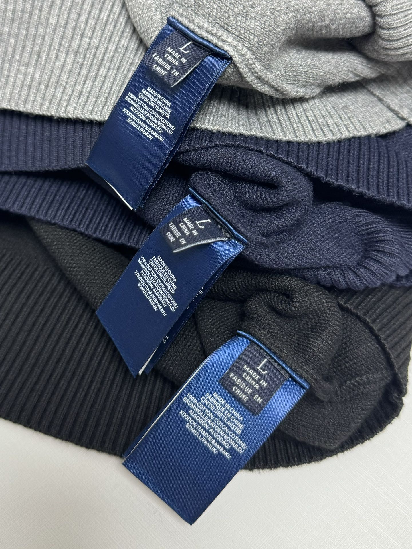 Ralph Lauren men's V-neck knit sweater. Relaxed fit, 100% cotton. Features polo pony embroidery, ribbed cuffs/hem. Colors: black, blue, gray. Sizes: S to XXL.