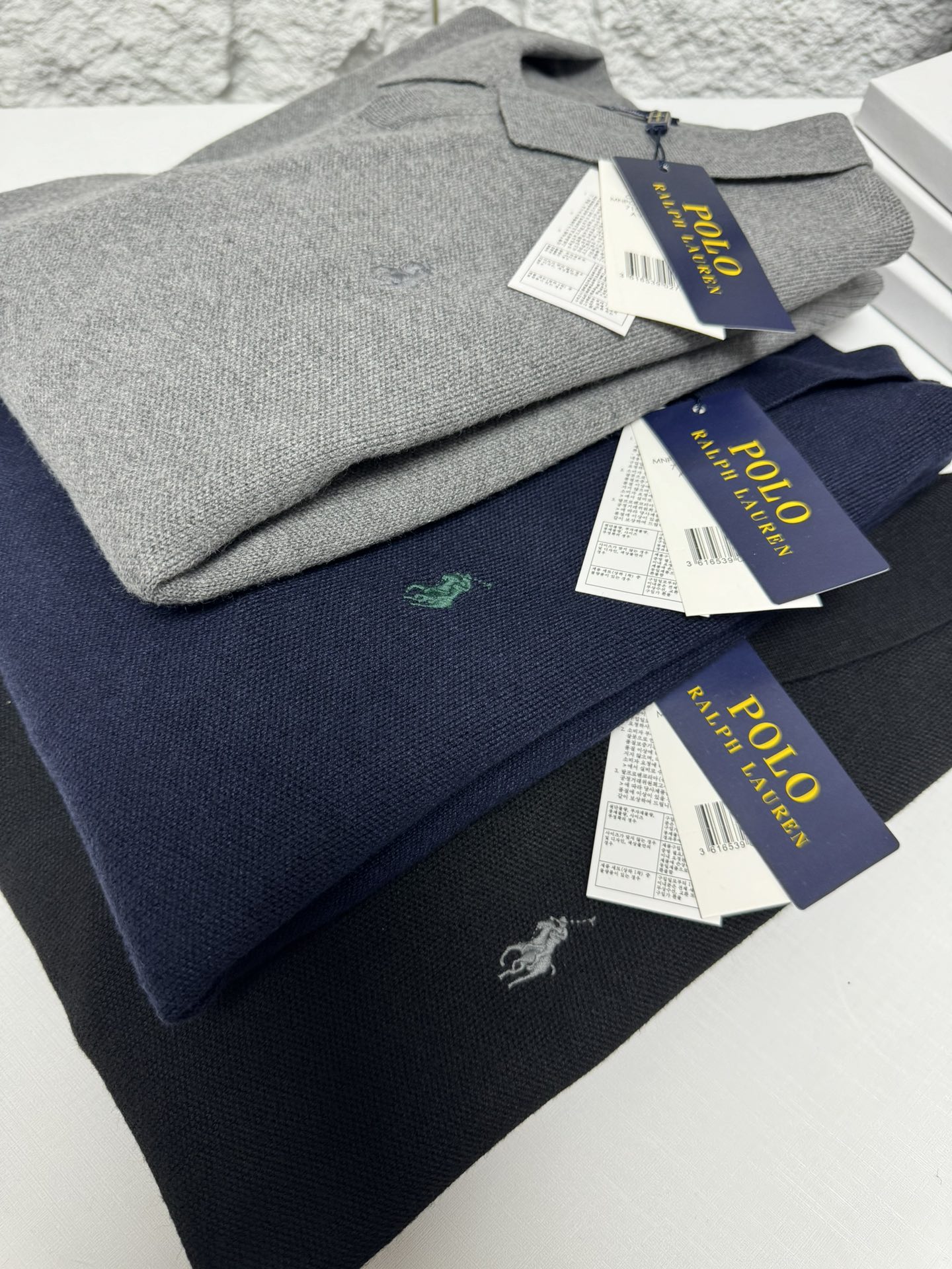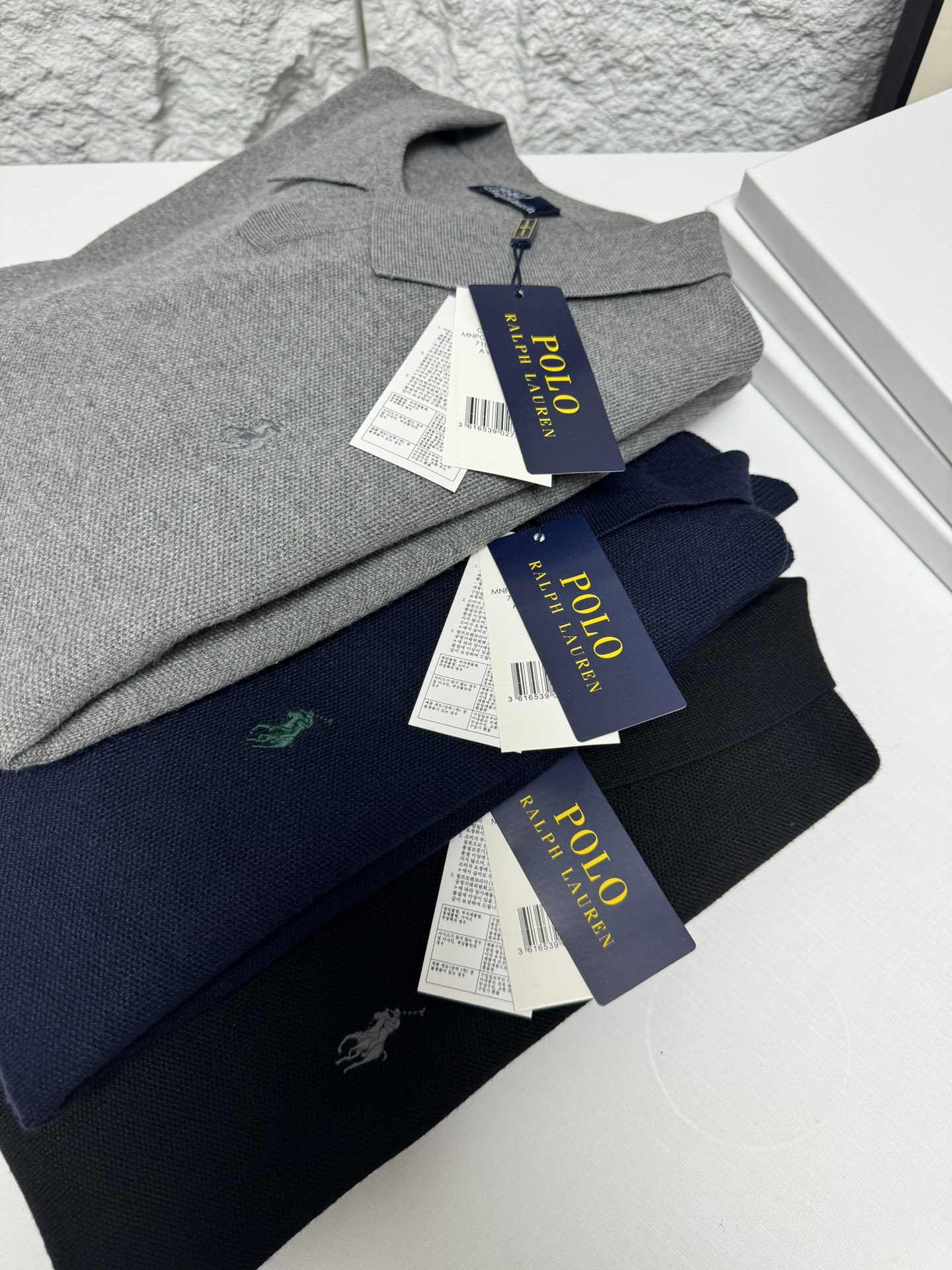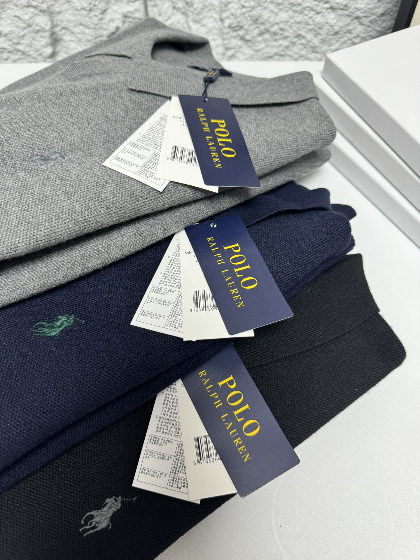 Ralph Lauren men's V-neck knit sweater. Relaxed fit, 100% cotton. Features polo pony embroidery, ribbed cuffs/hem. Colors: black, blue, gray. Sizes: S-XXL.