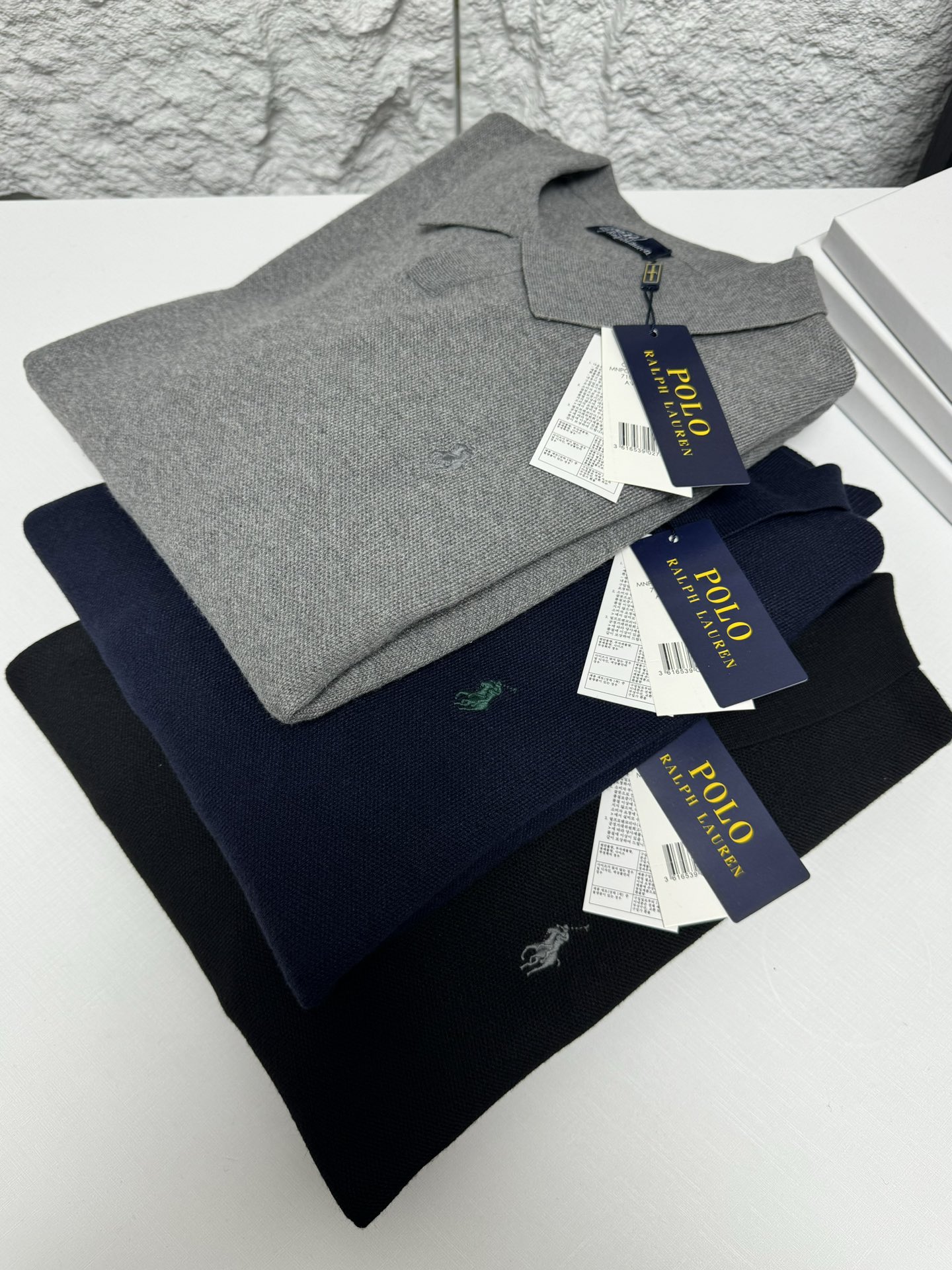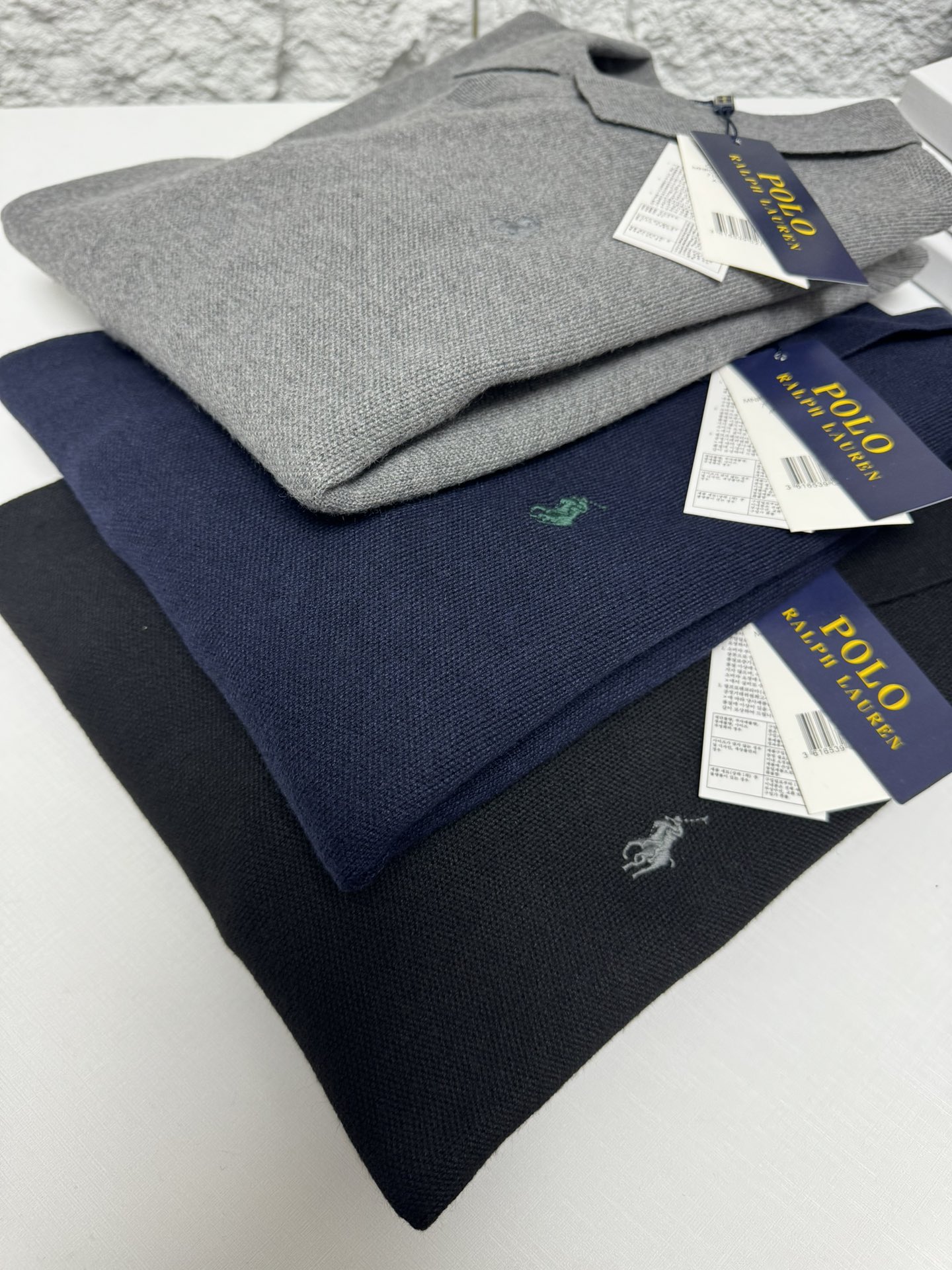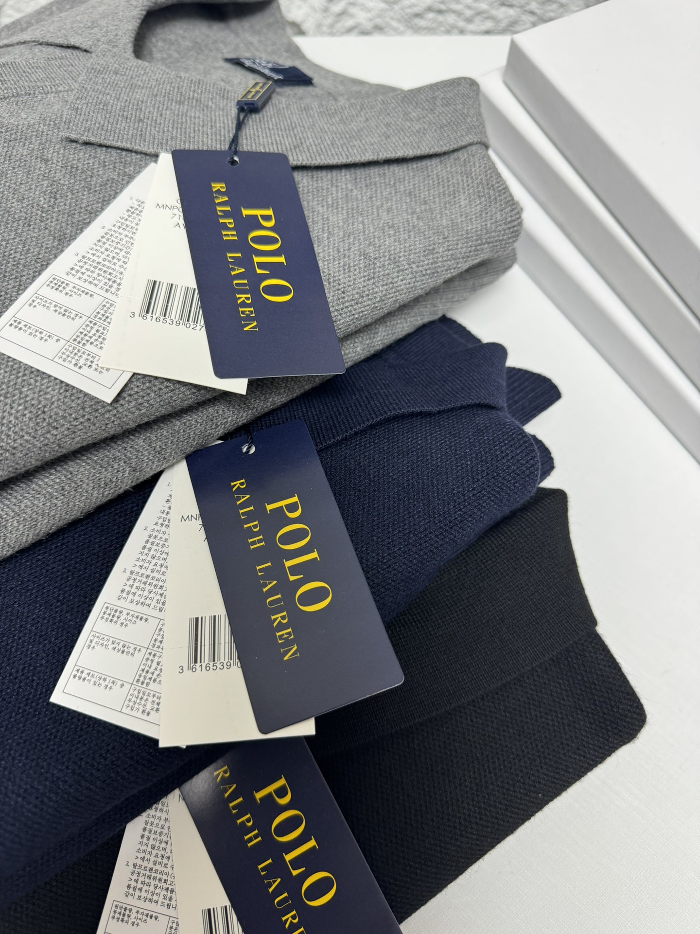 Ralph Lauren men's V-neck knit sweater. Relaxed fit, 100% cotton. Features polo pony embroidery, ribbed cuffs/hem. Colors: black, blue, gray. Sizes: S-XXL.