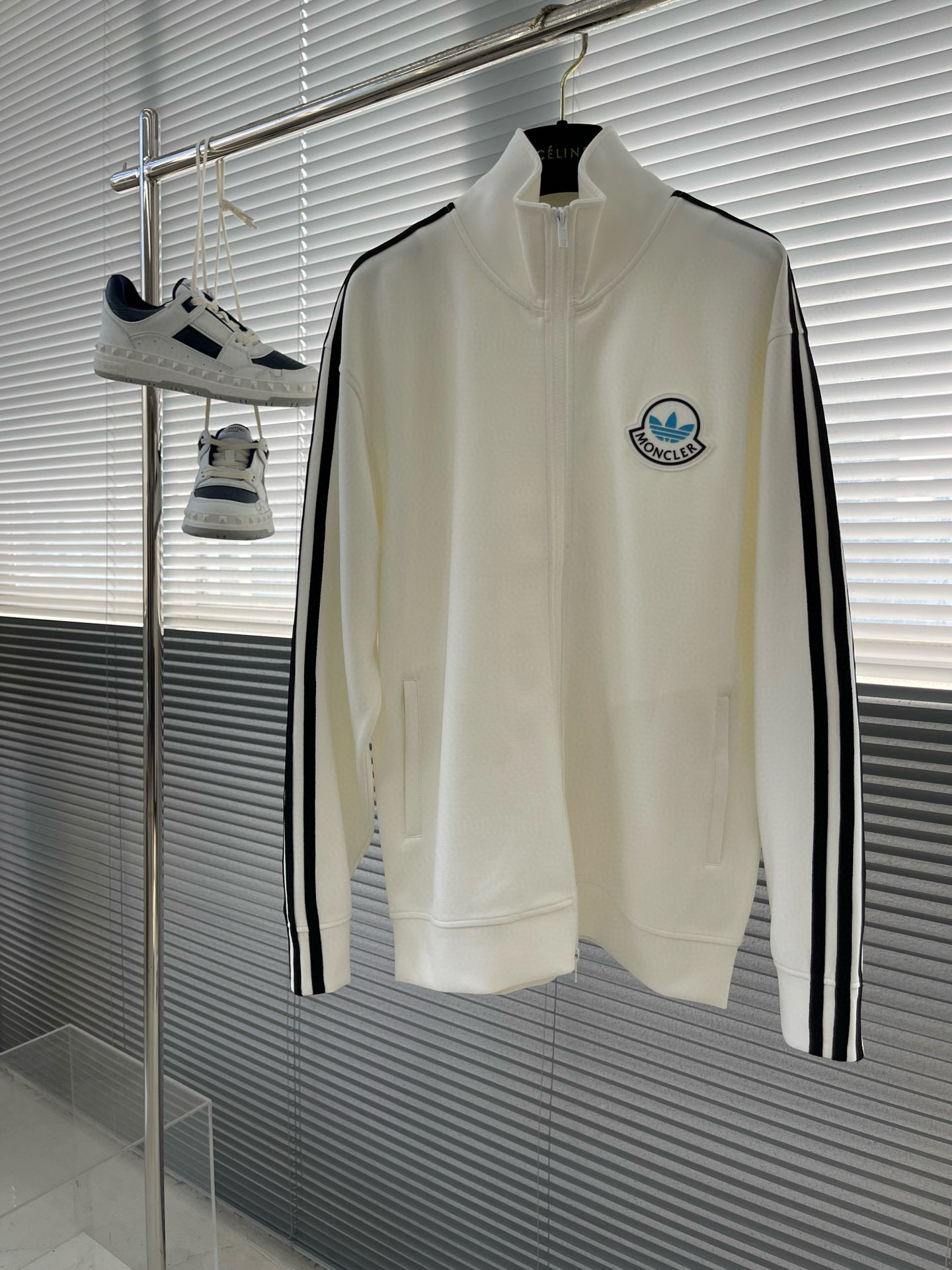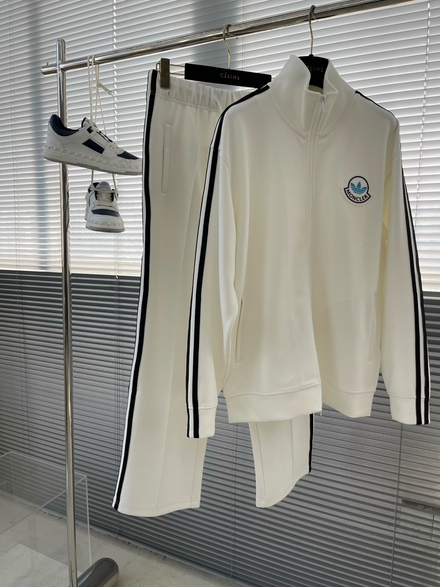 Moncler x Adidas retro sportswear set. Unisex hoodie and straight-leg pants in black/white. M-3XL sizes. Imported heavy cotton.