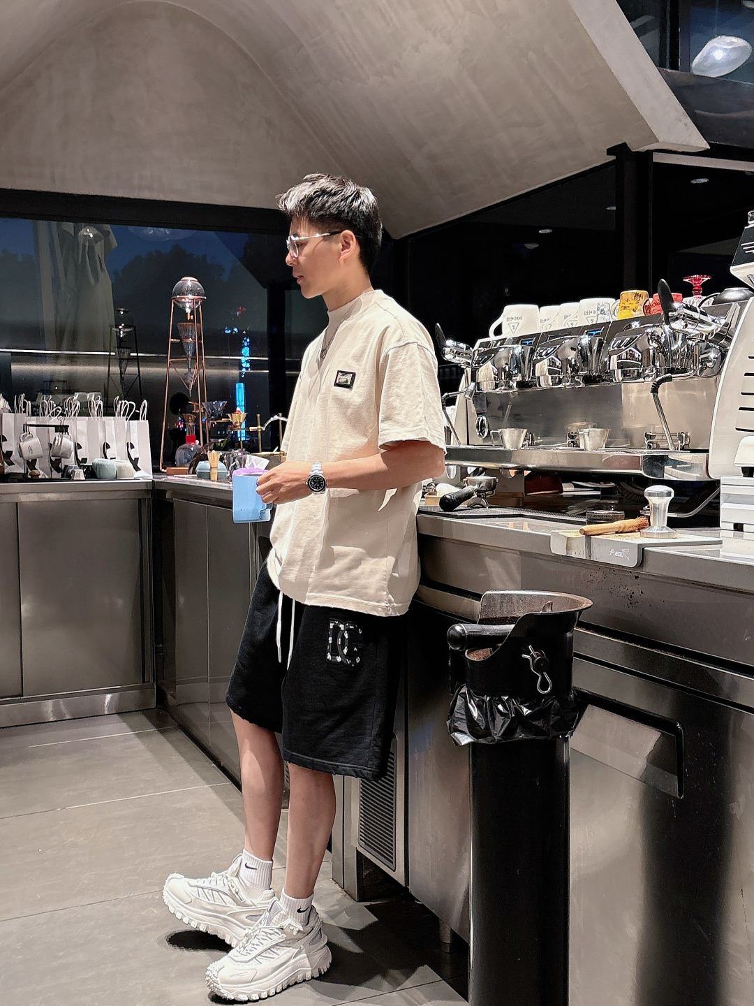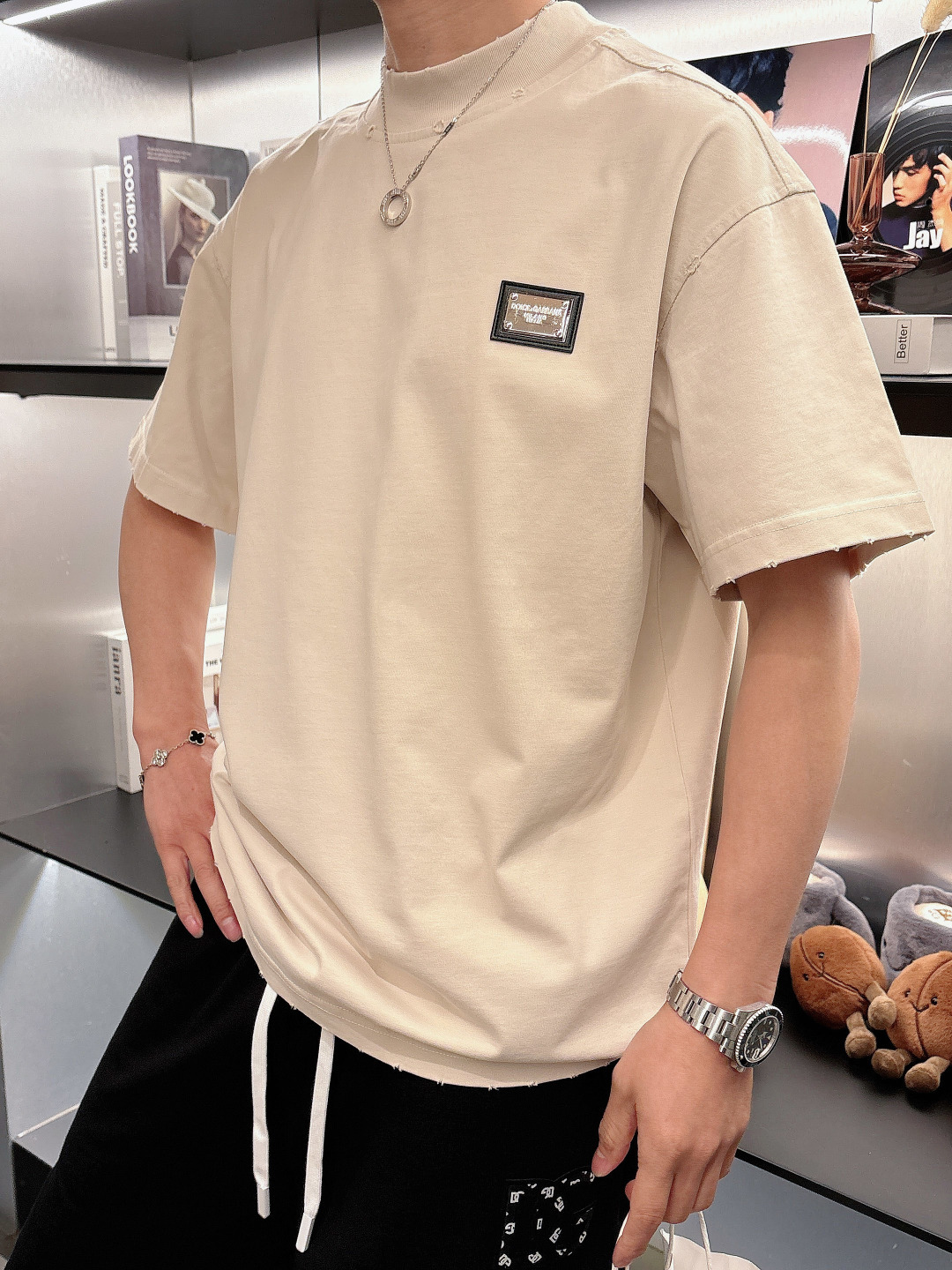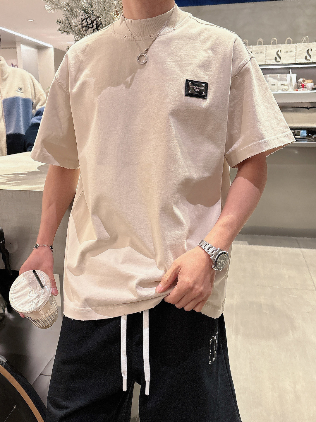 Dolce&Gabbana 2025 set: new wash, ripped details. Short-sleeve tee & shorts. Colors: Paris grey, beige, black, green. Sizes: M-3XL (top), 29-38 (shorts).