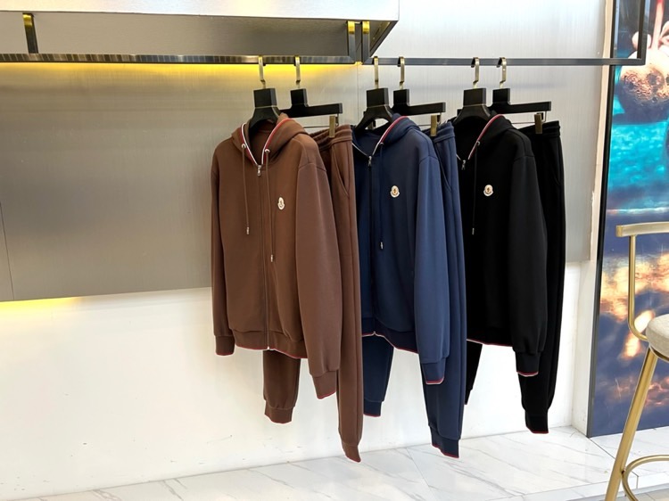 Moncler 2025 autumn-winter hooded tracksuit. Red/white striped hood, chest logo, elastic waist. Soft fabric, versatile wear. Lazy yet stylish aesthetic.