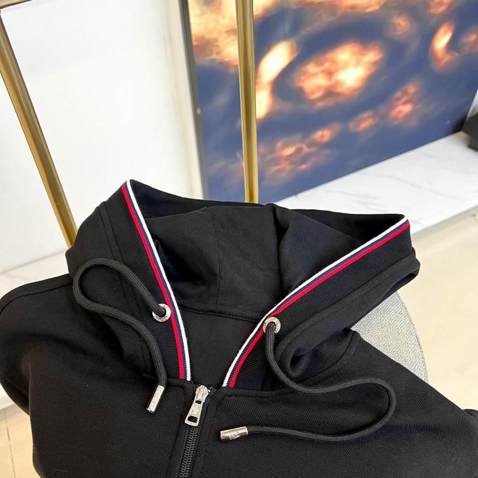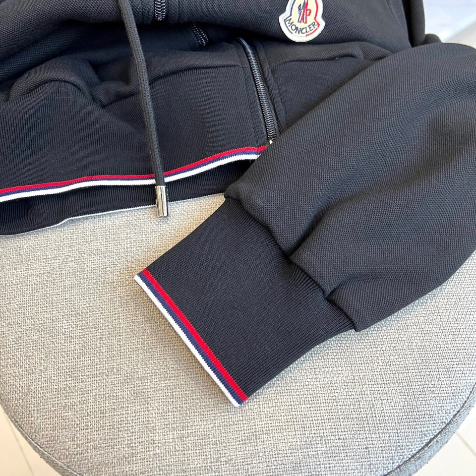 Moncler 2025 autumn-winter hooded tracksuit. Red/white striped hood, chest logo, elastic waist. Soft fabric, versatile wear. Lazy yet stylish aesthetic.