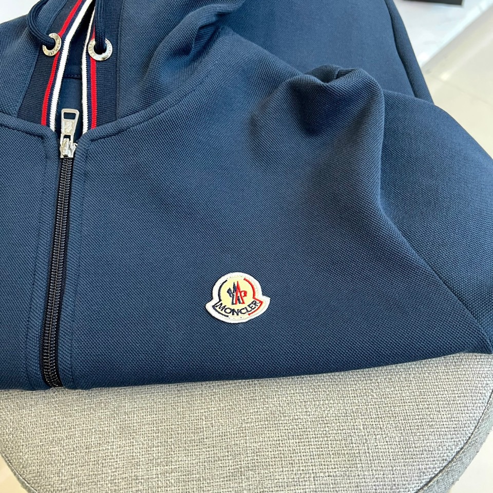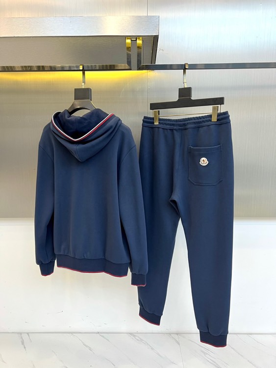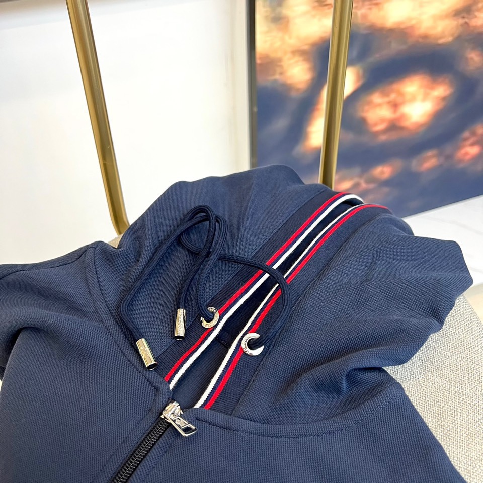 Moncler 2025 autumn-winter hooded tracksuit. Red/white striped hood, chest logo, elastic waist. Soft fabric, versatile wear. Loose yet sharp style.