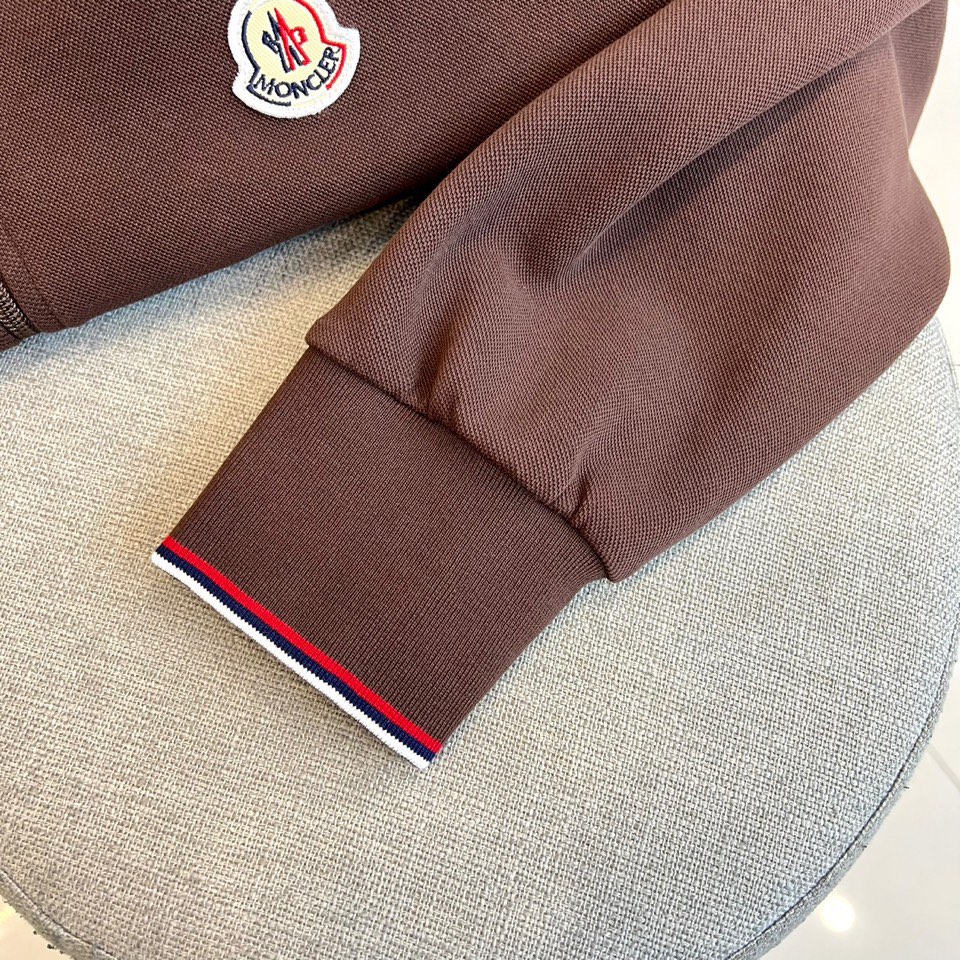 Moncler 2025 autumn-winter hooded tracksuit. Red/white striped hood, chest logo, elastic waist. Soft fabric, versatile for workouts/casual wear. Loose fit, stylish comfort.