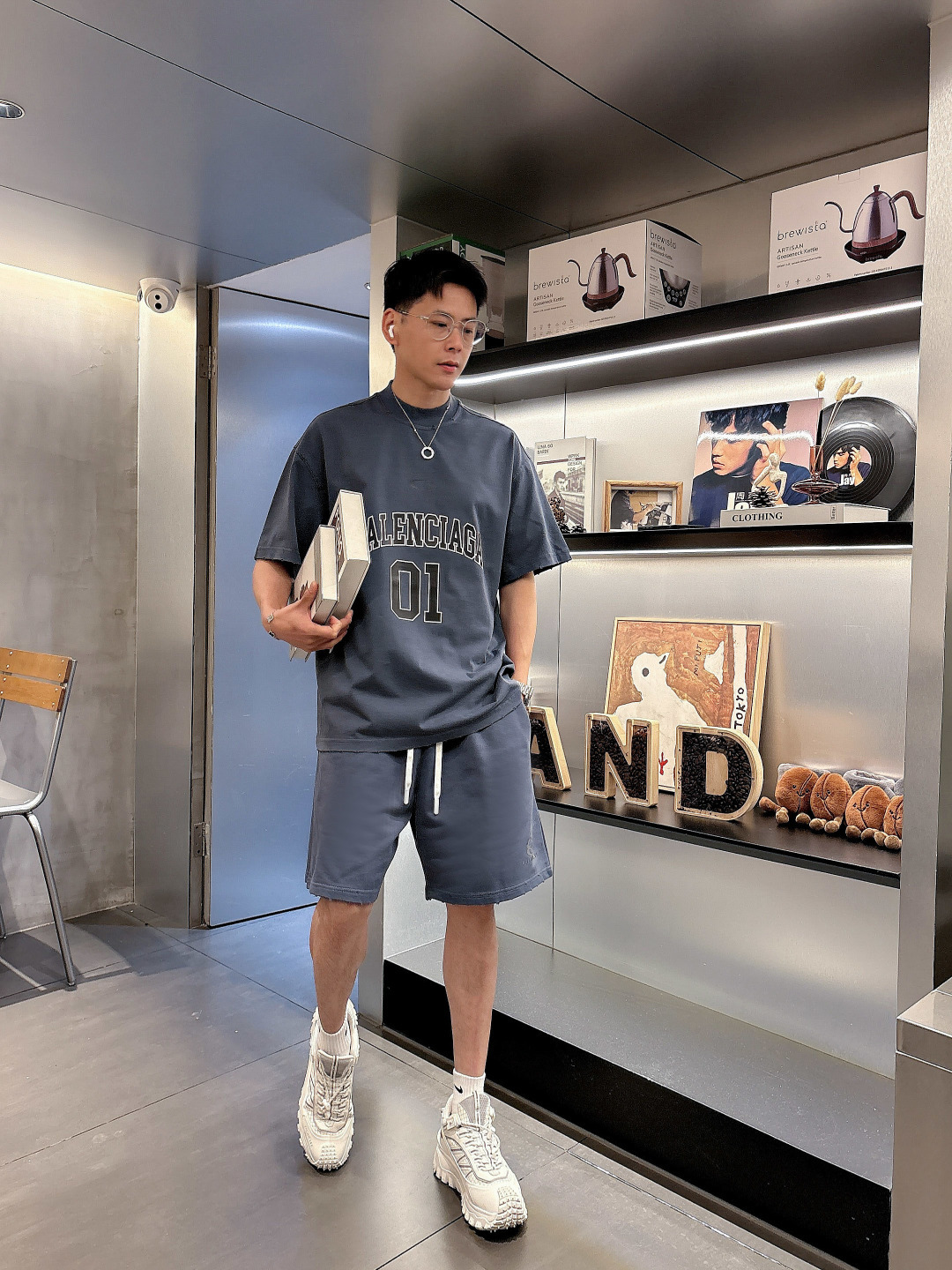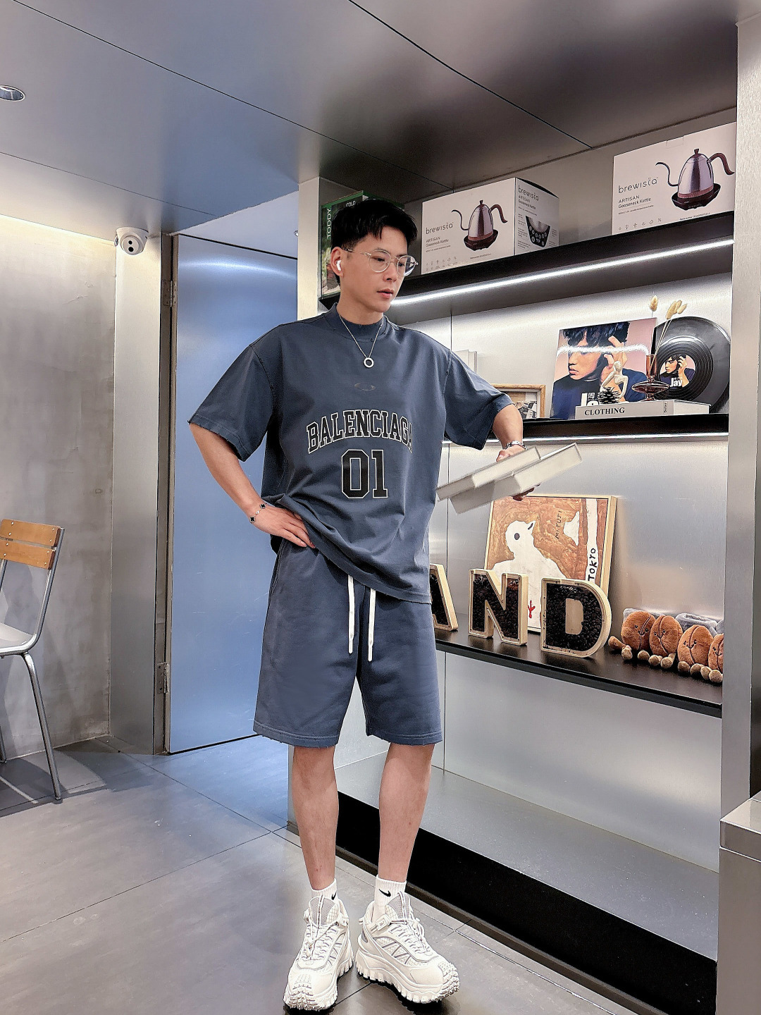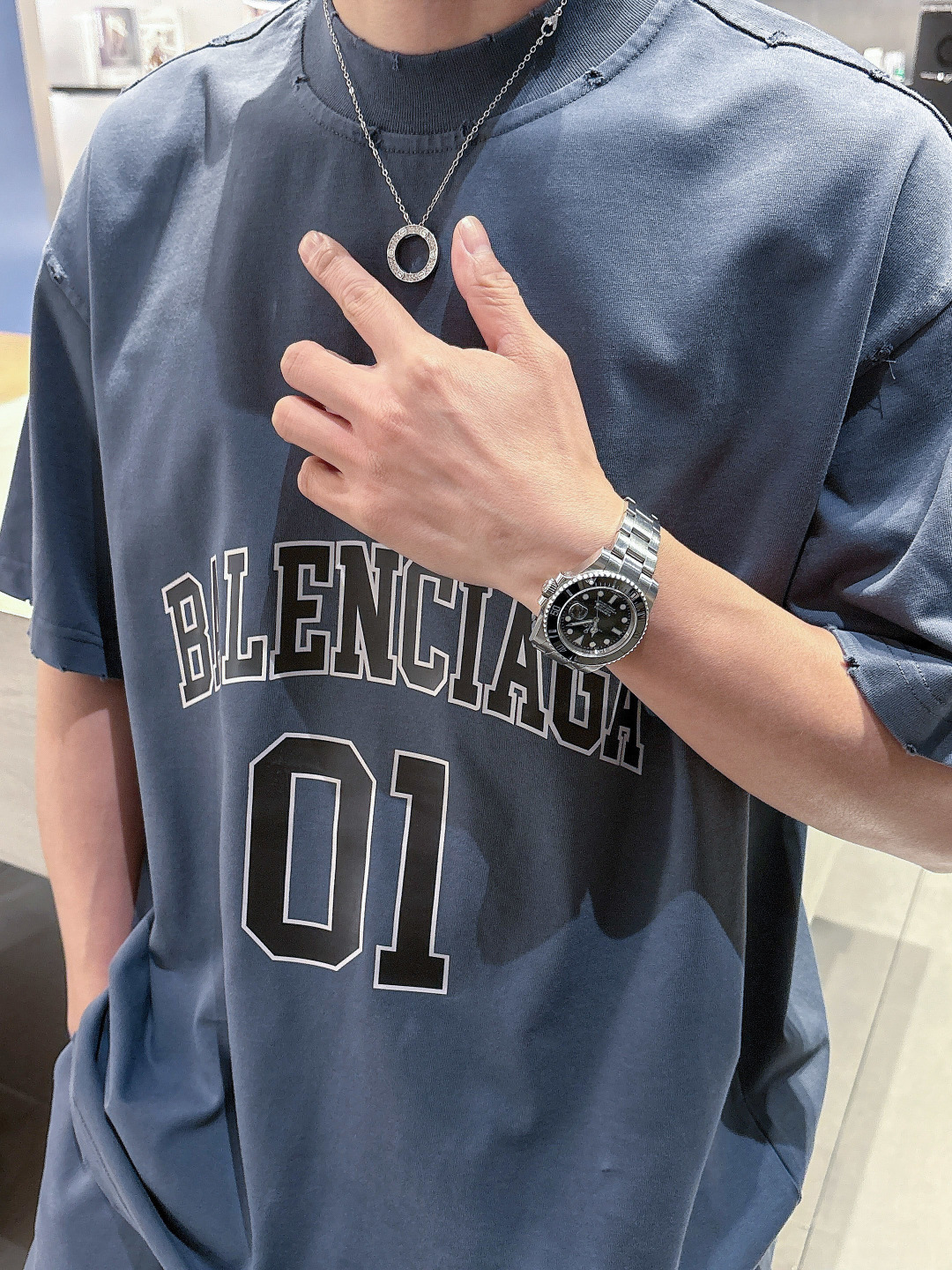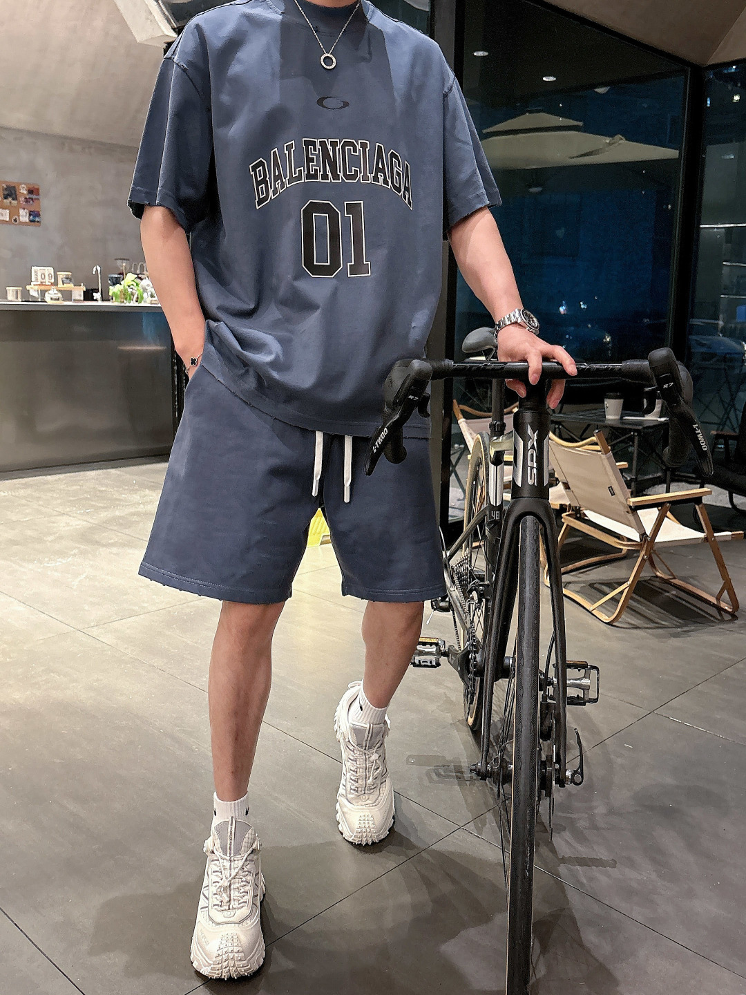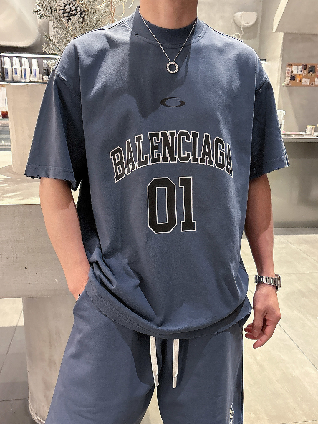 Balenciaga 2025 set: new washed tech, ripped details. Short sleeve tee & shorts. Colors: Grey, Beige, Black, Green. Sizes: M-3XL (top), 29-38 (shorts). Soft, comfortable, stylish.