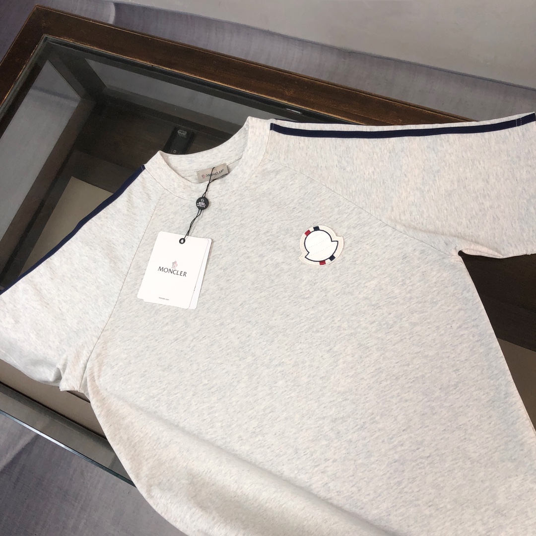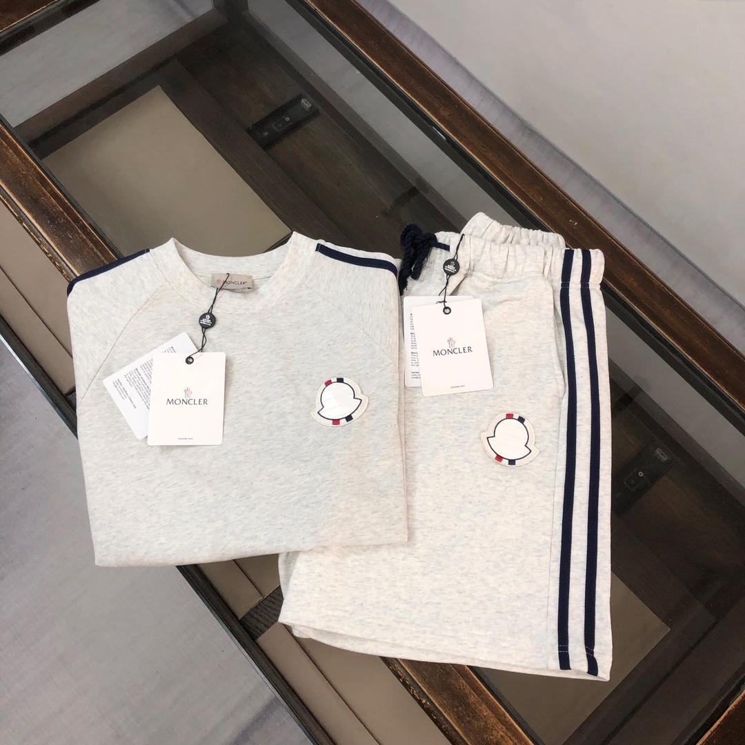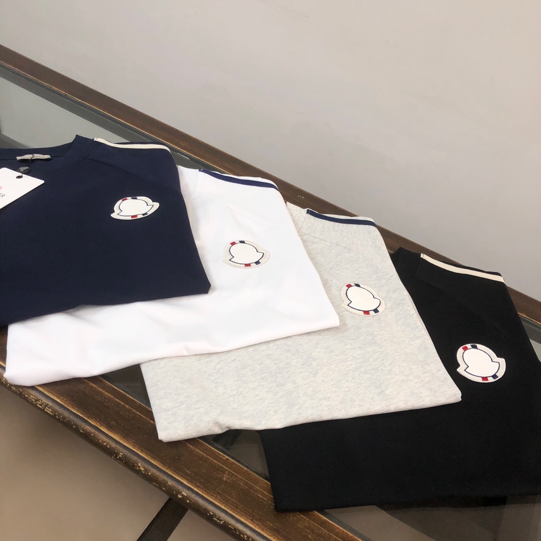 MONCLER 2025 SS unisex casual round-neck set. Latest design, elegant embroidery logo. Comfortable, breathable fabric. Colors: Black, White, Blue, Gray. Sizes: S-XXL (oversized).