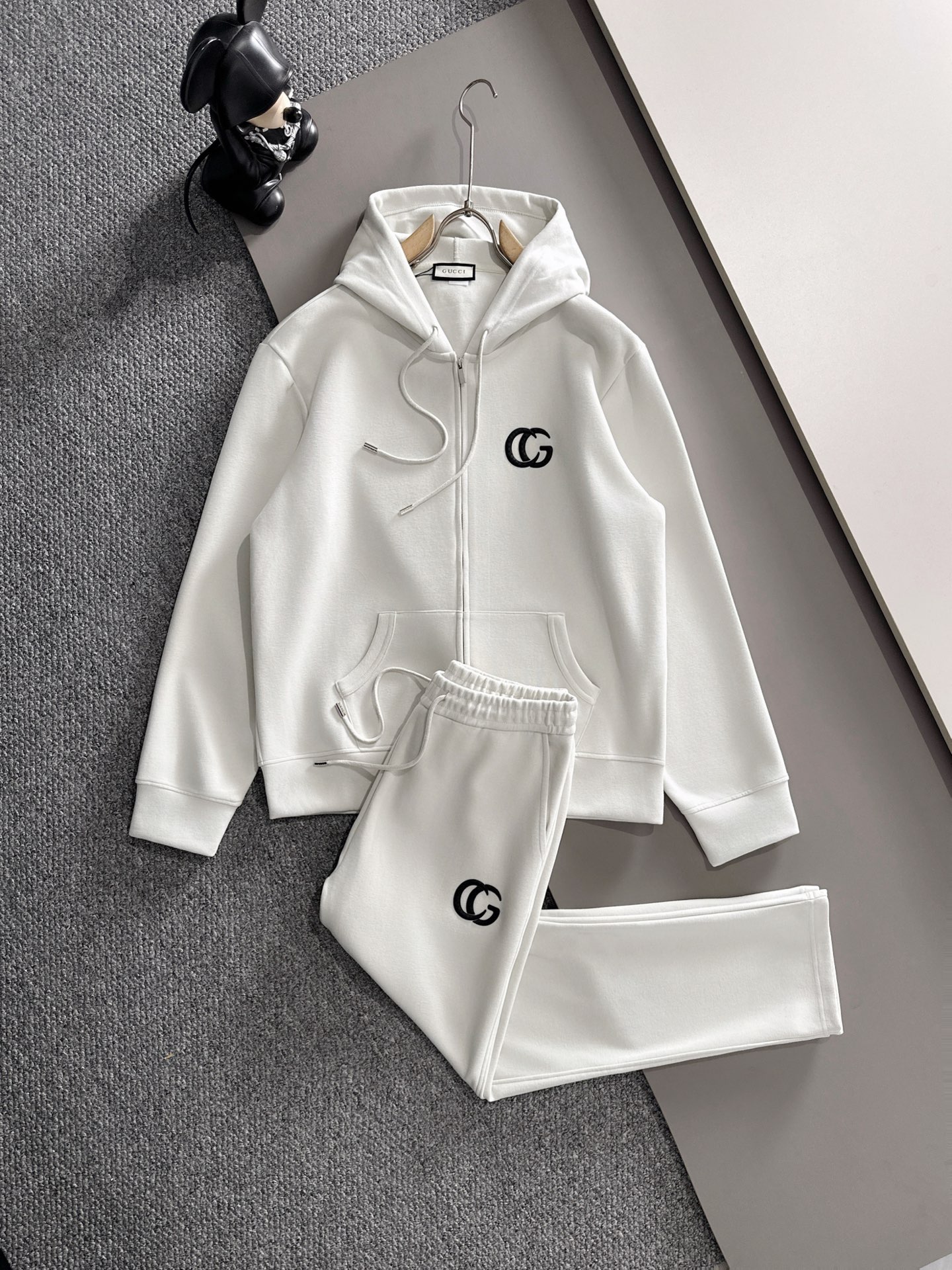 Gucci set: top拼接休闲裤与外套。经典黑白织带,logo刺绣,定制面料。舒适时尚。Sizes M-3XL.
