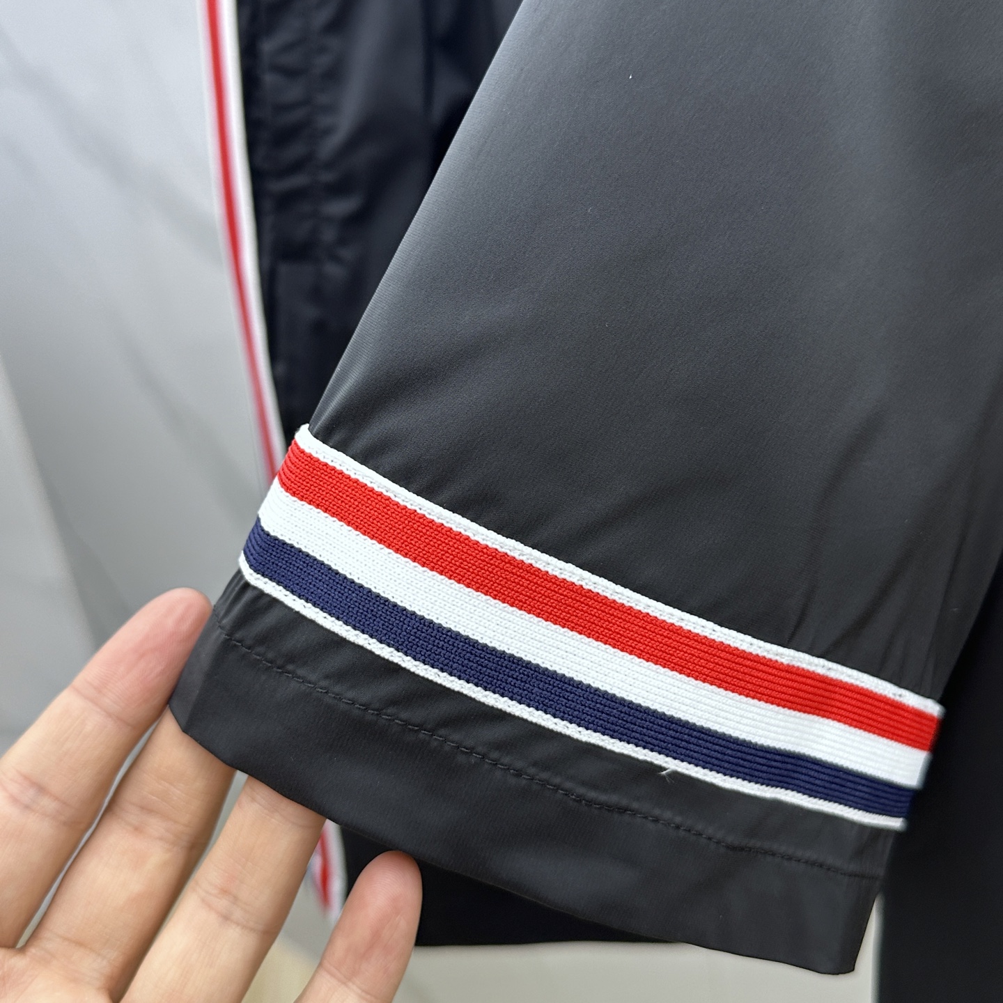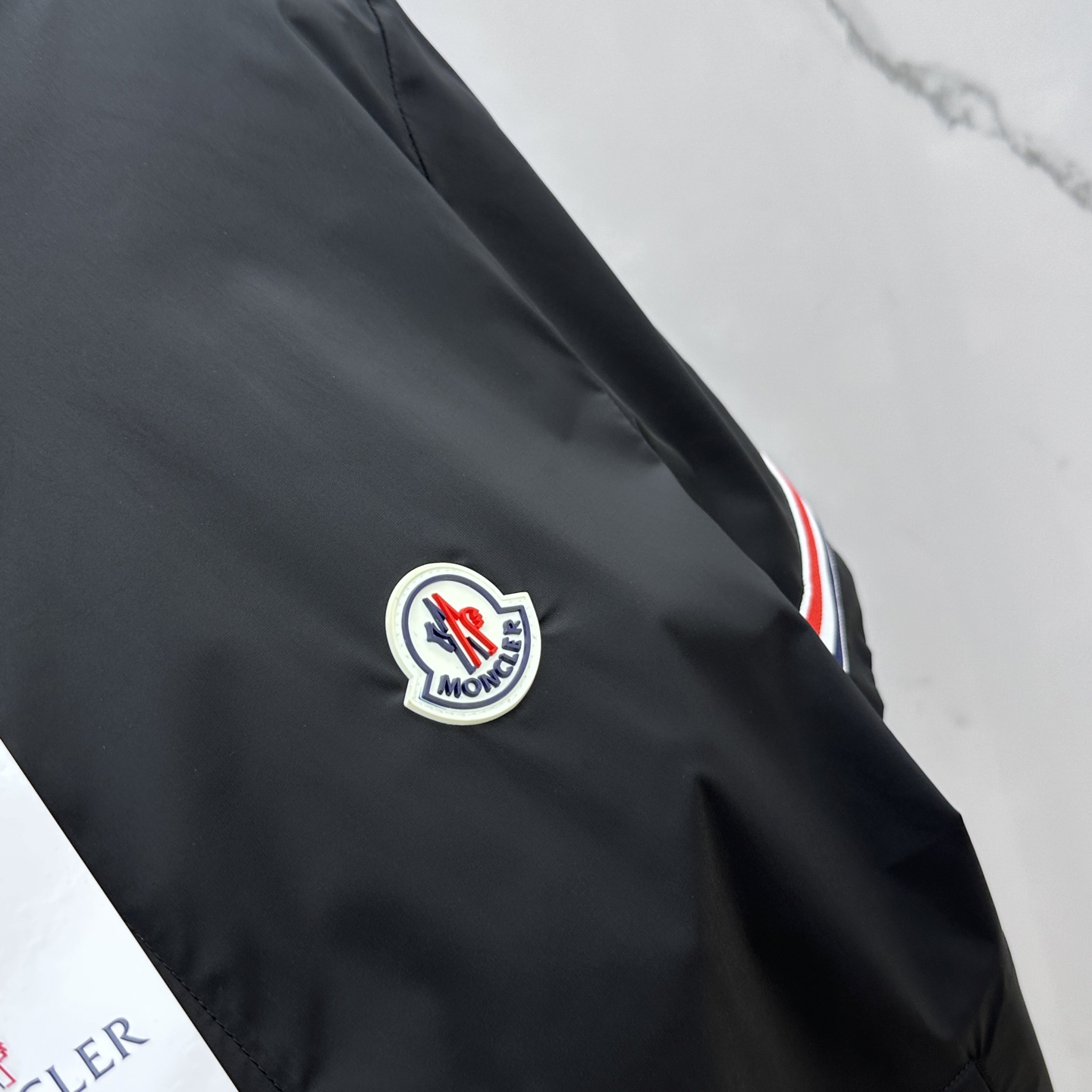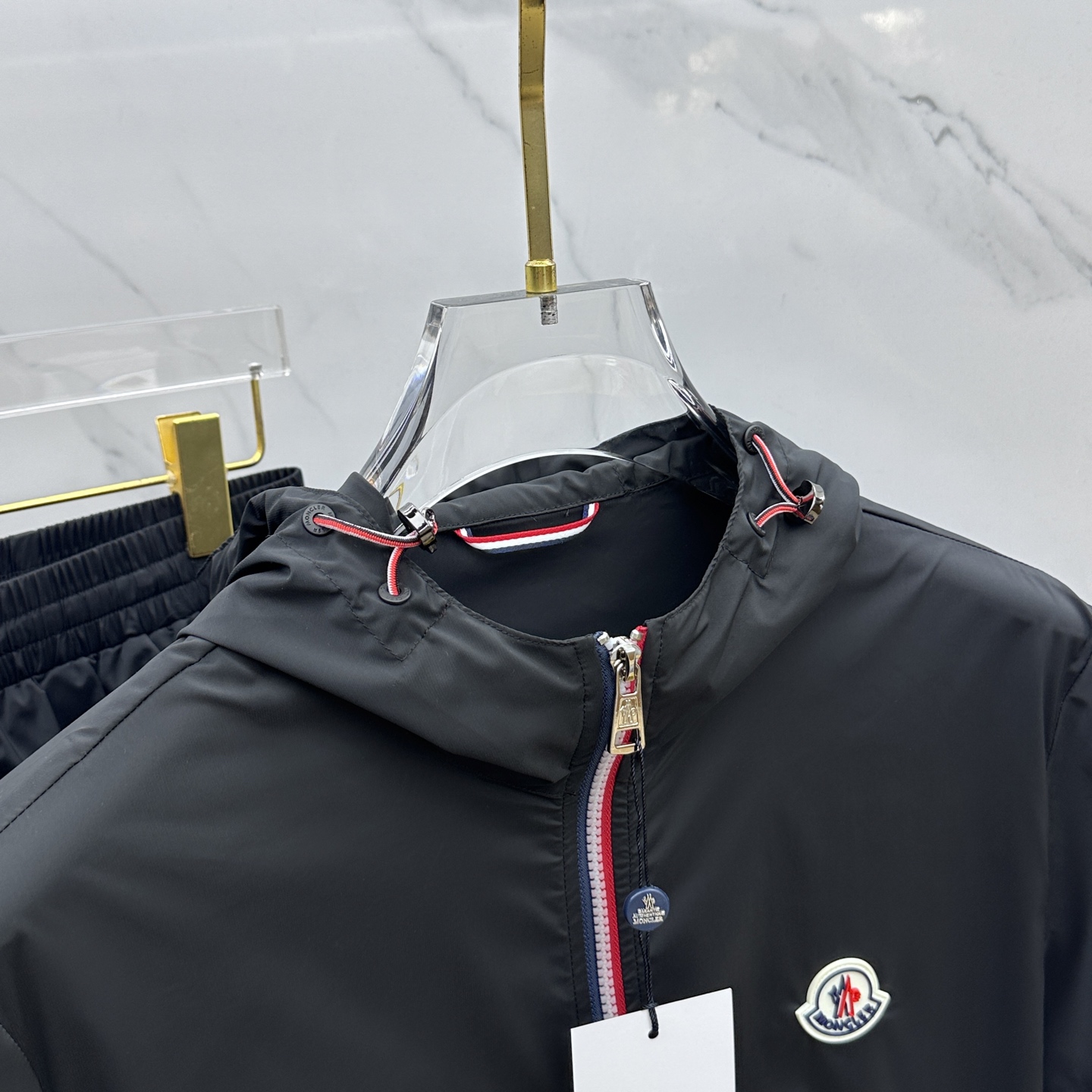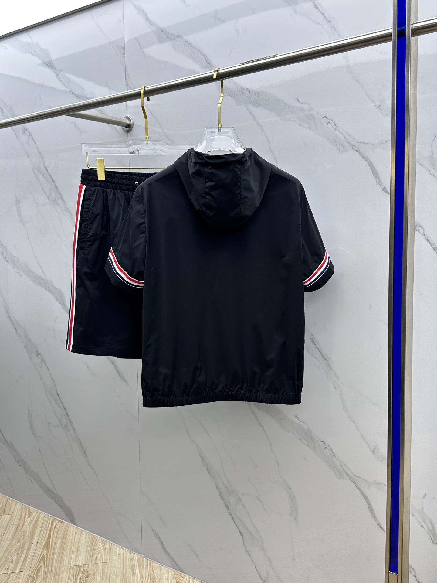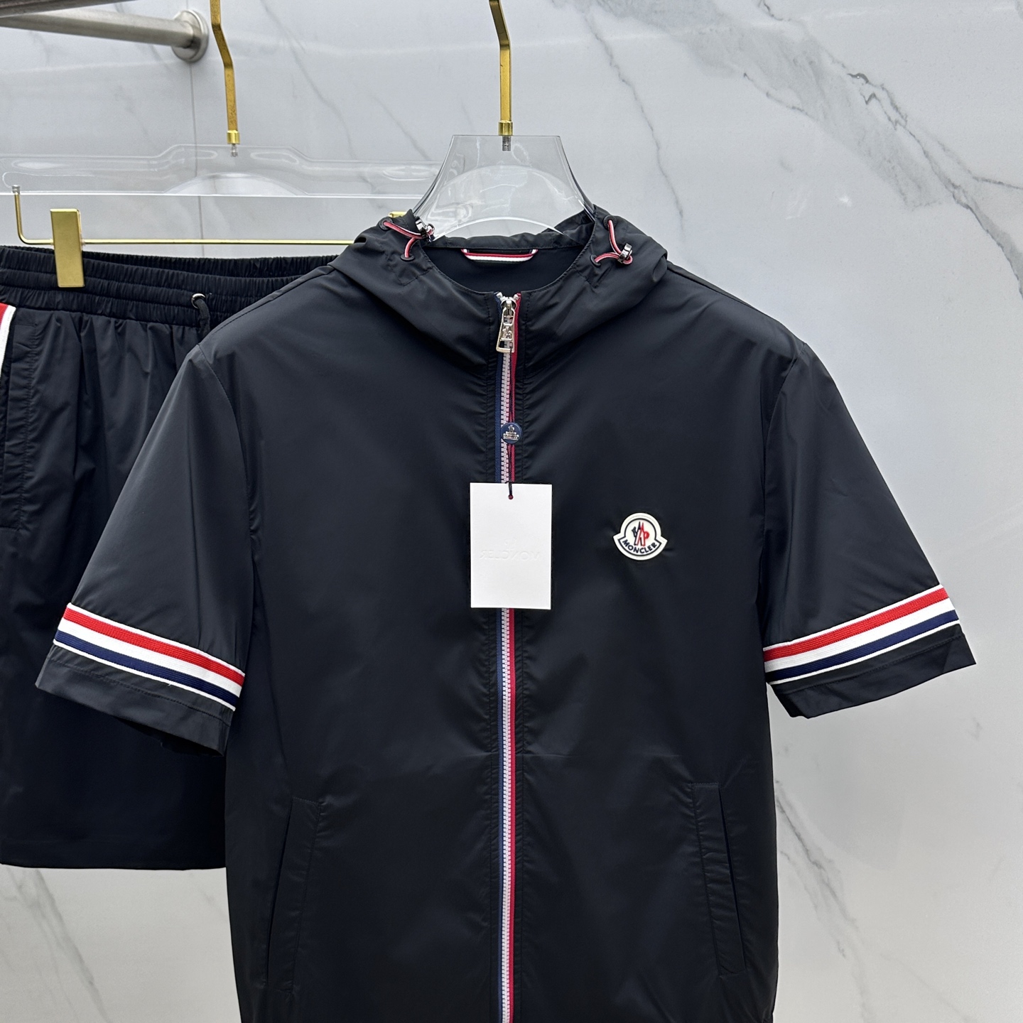 Moncler casual set with hooded short sleeves. Red, white, and blue stripe details. Soft, breathable fabric. Sizes M-3XL. Stylish and versatile for sports or daily wear.