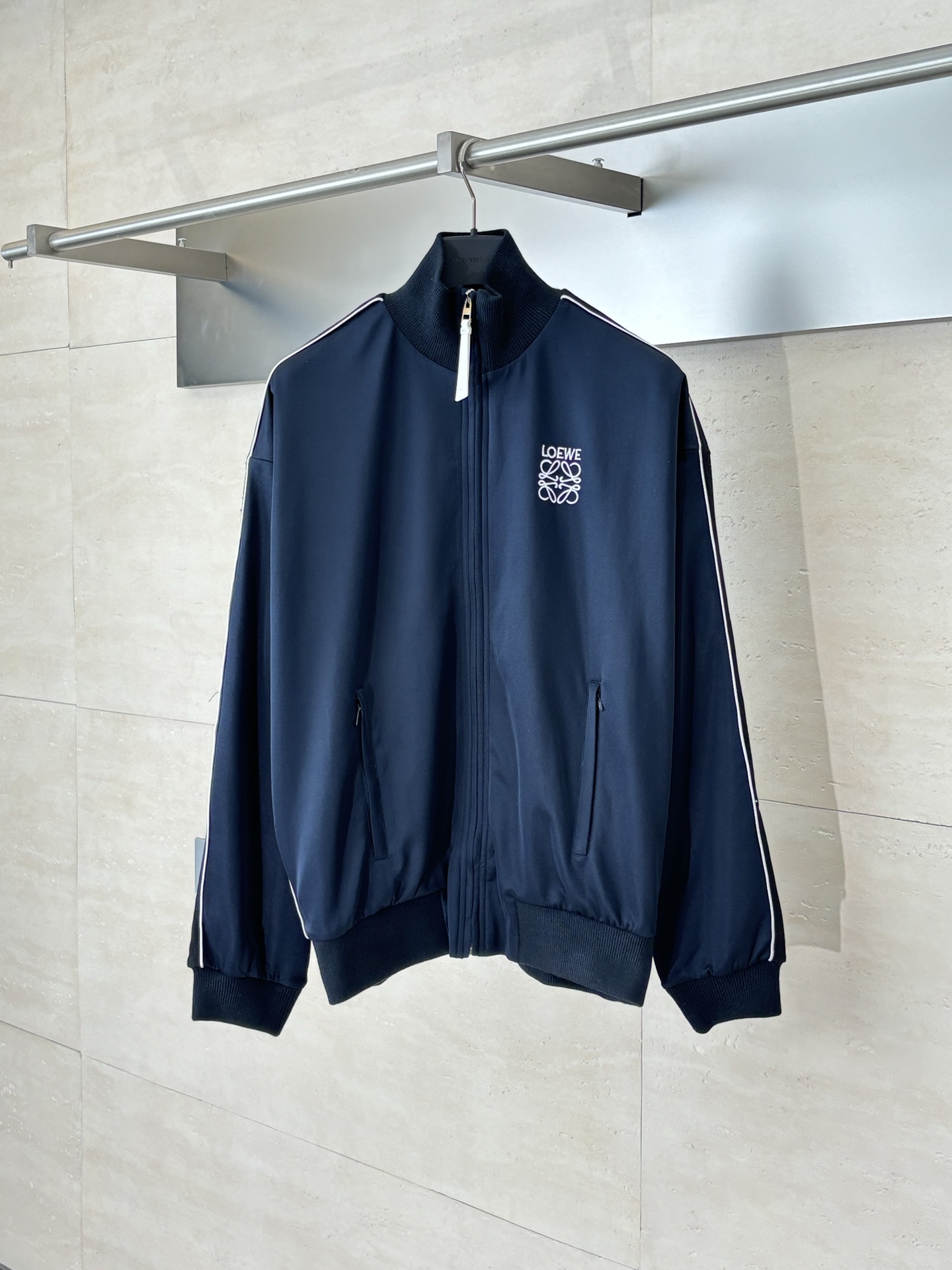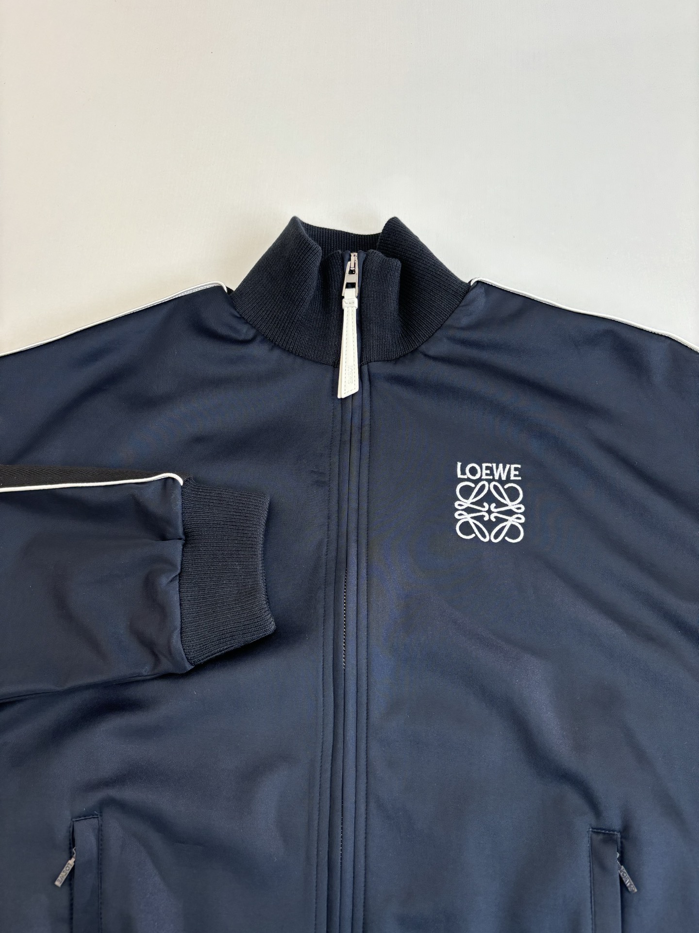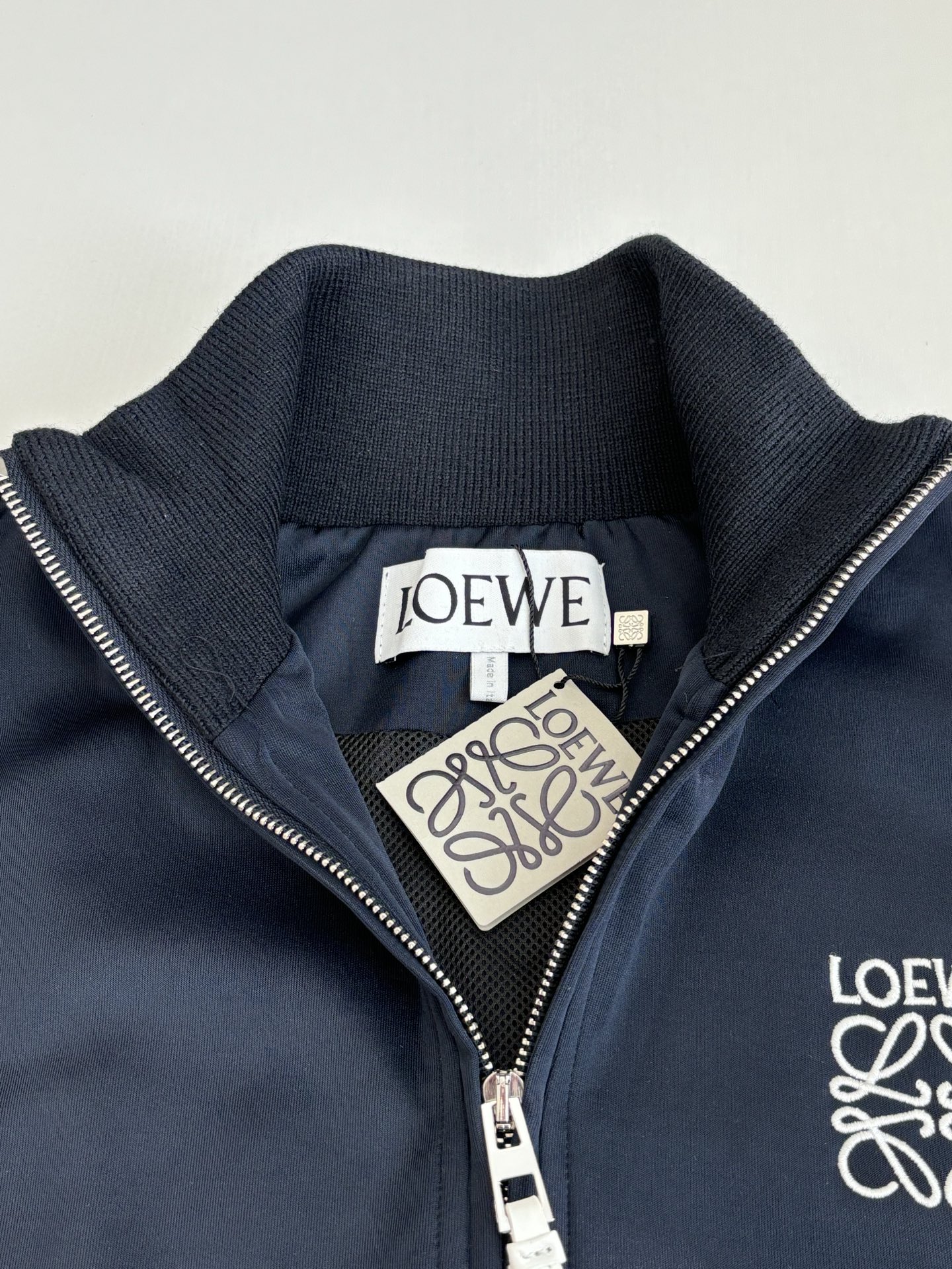 Loewe blue school uniform zip jacket. Lightweight tech knit, Anagram embroidery, herringbone sleeves, mesh lining. Relaxed fit, ribbed collar, zip cuffs/hem/pockets. 100% polyester, wrinkle-resistant, breathable. Sizes XS-L.