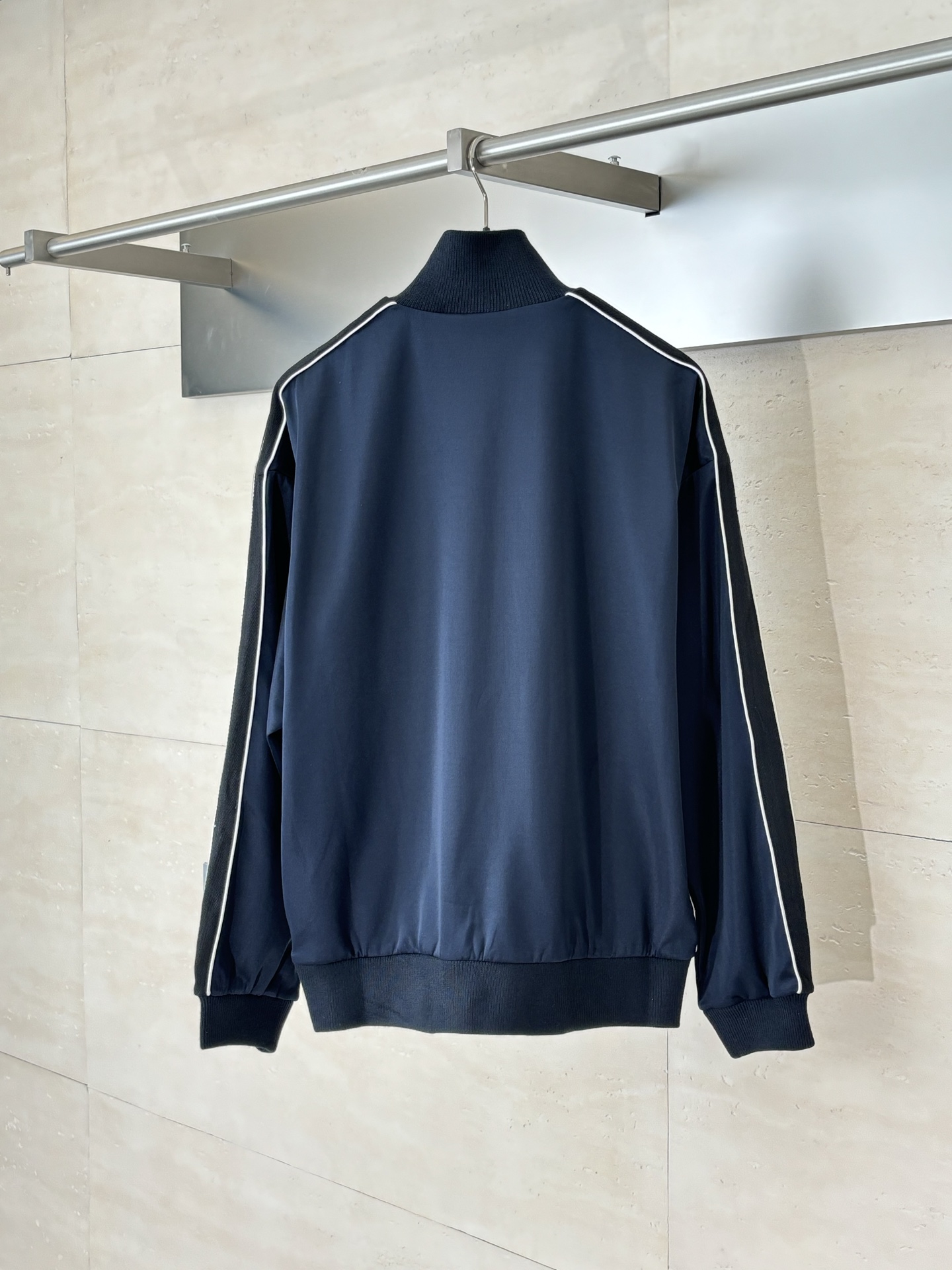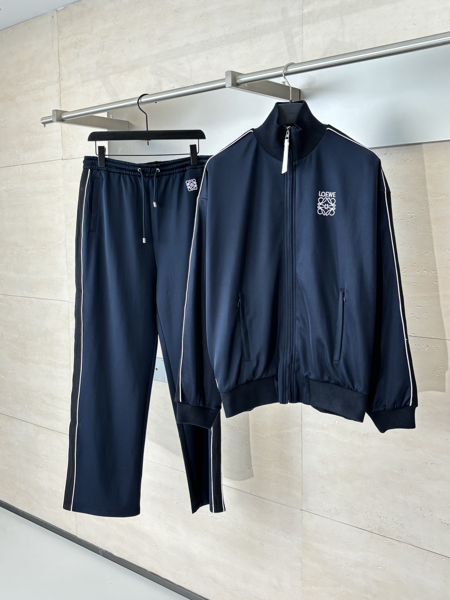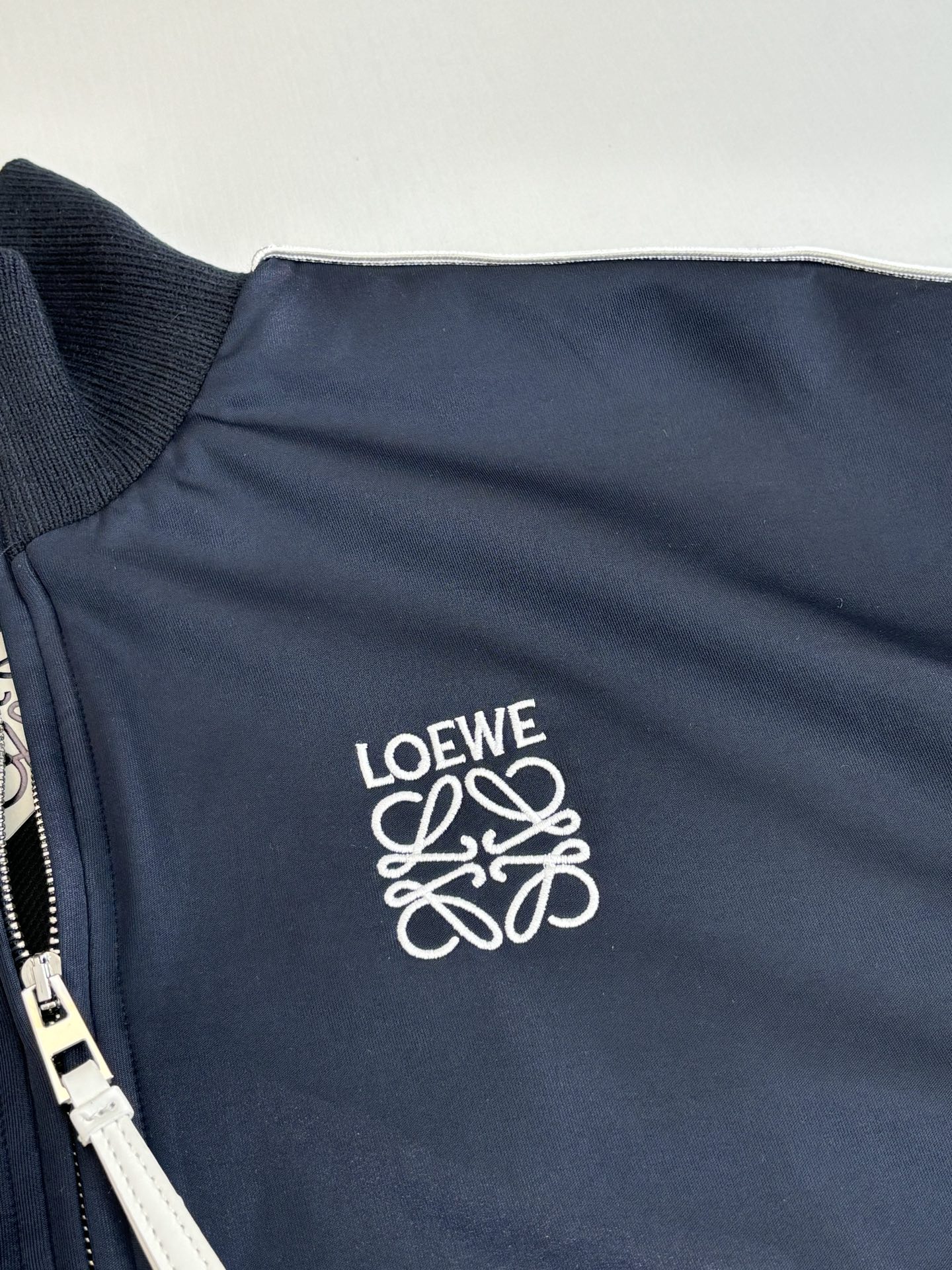 Loewe blue school uniform zip jacket. Lightweight tech knit, Anagram embroidery, herringbone sleeves, mesh lining. Relaxed fit, ribbed collar, zip cuffs/hem/pockets. 100% polyester, wrinkle-resistant, breathable. Sizes XS-L.