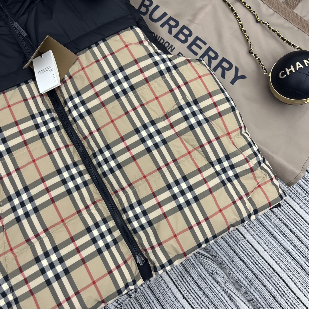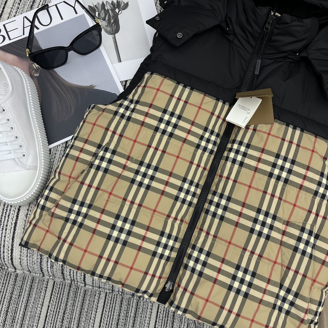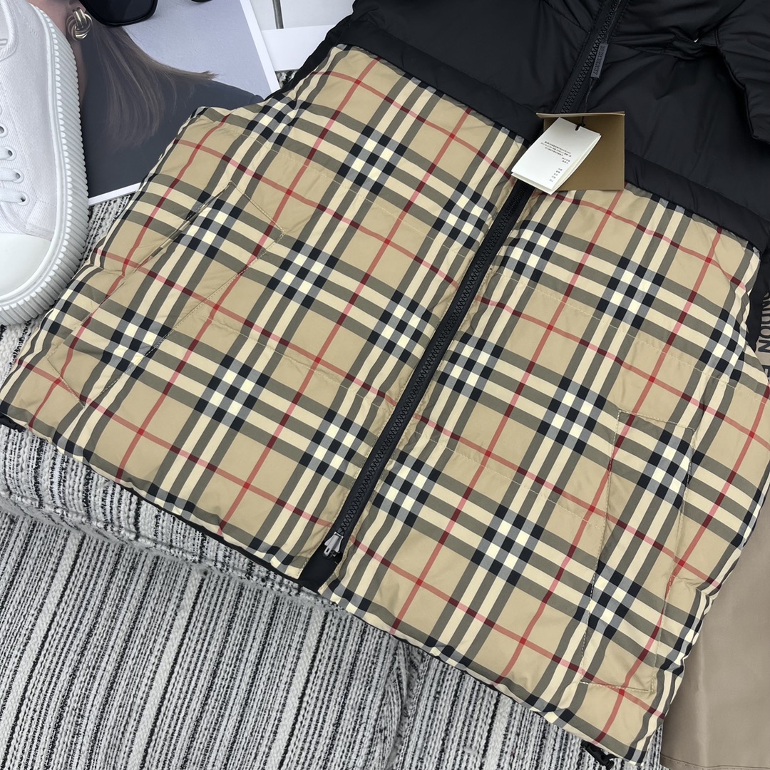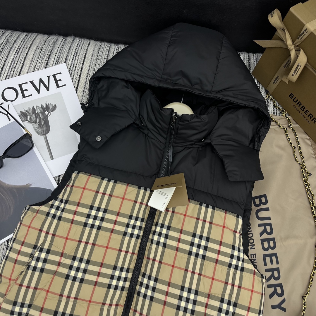 Guangzhou high version Burberry down vest early autumn color series, counter best-selling style, BUR new color-blocking plaid hooded down vest, reversible, 90% down filling, full down content, original hardware accessories.