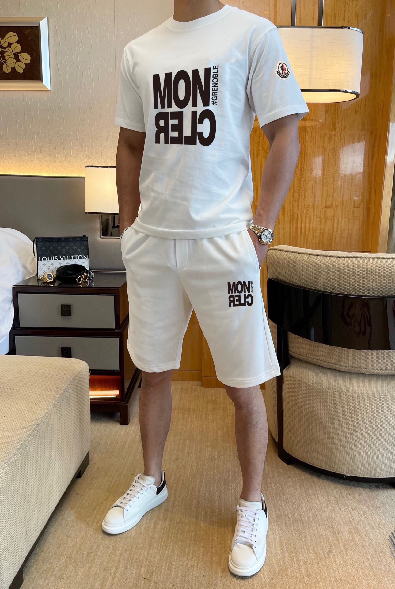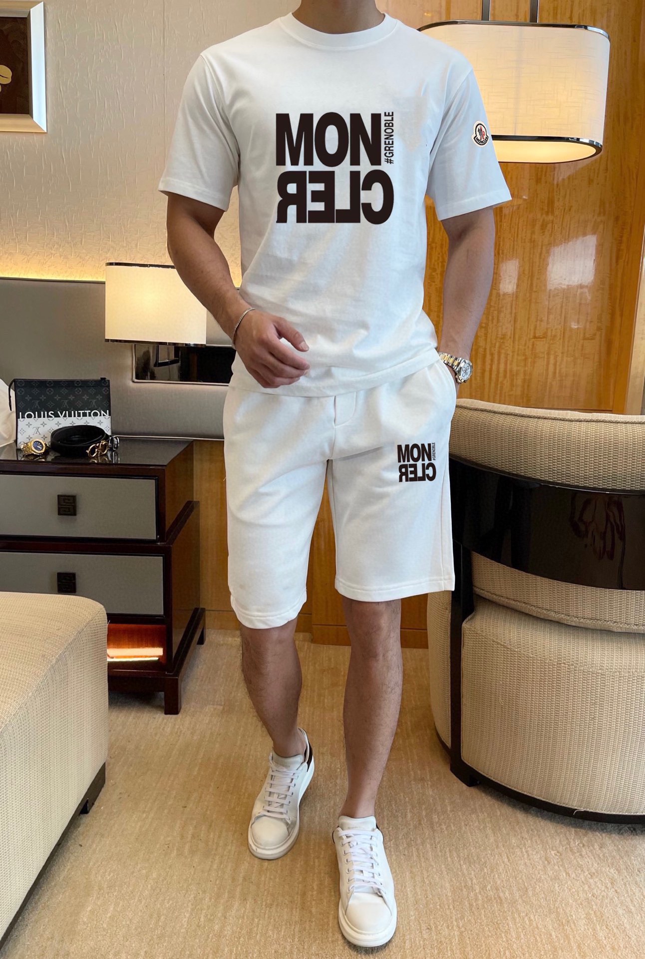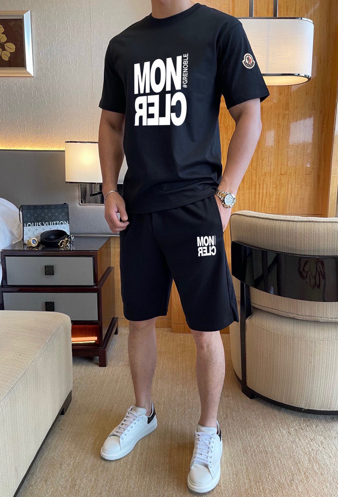 Home • Apparel • Suit • MONCLER 2025 new men's short sleeve and shorts set. High-end version with soft texture and comfortable fit. Available in sizes M-5XL.