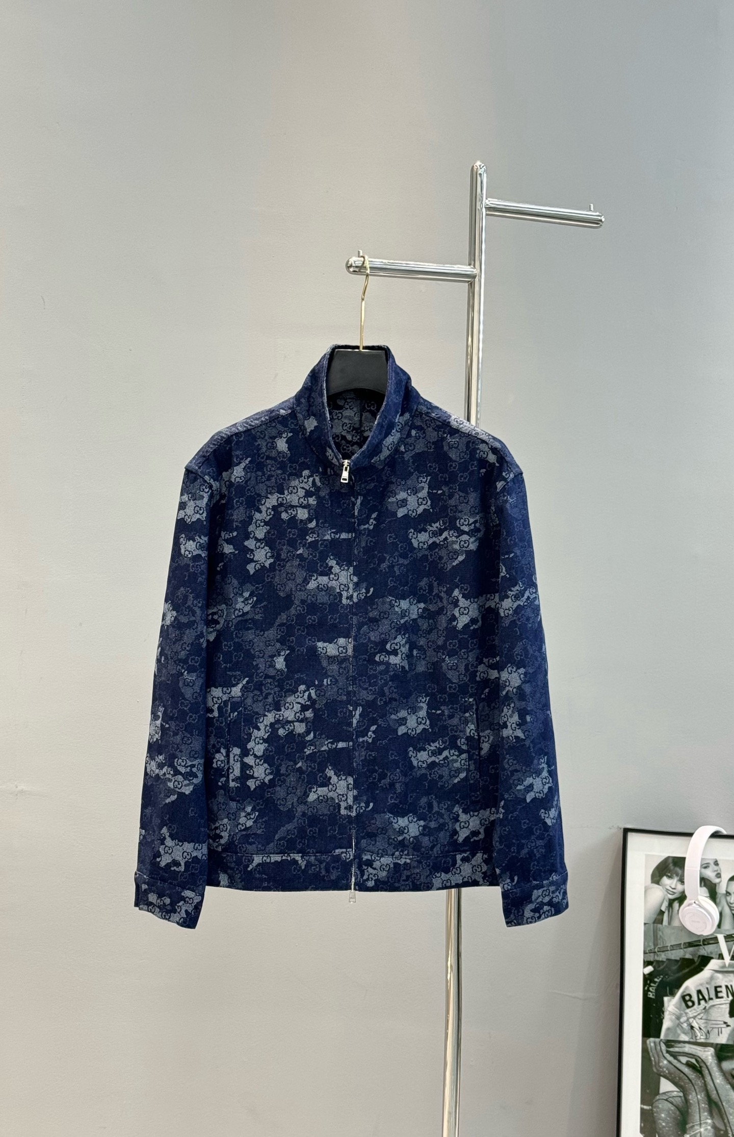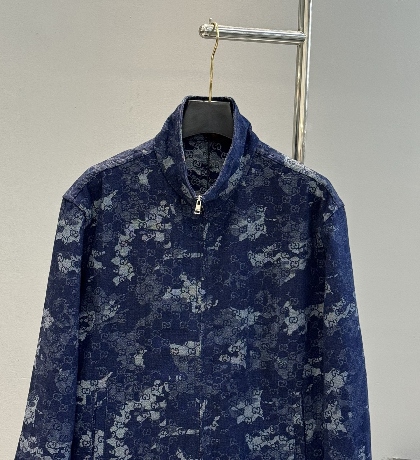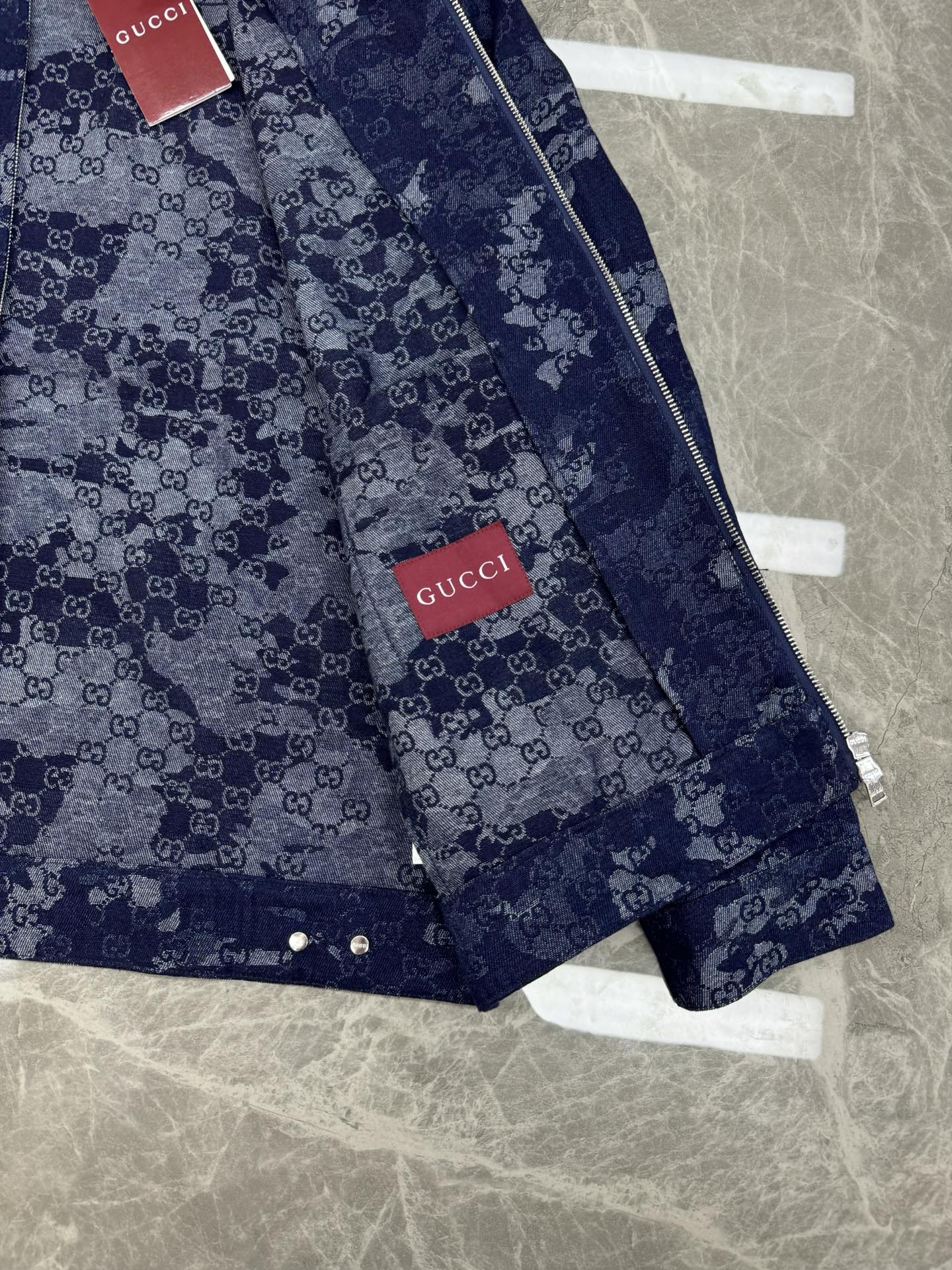Home•Apparel•Suit•Gucci printed denim jacket with stand collar. Custom jacquard denim, deep blue with ivory white. Features marble effect pattern, leather label, and zipper. European sizes S-XL.