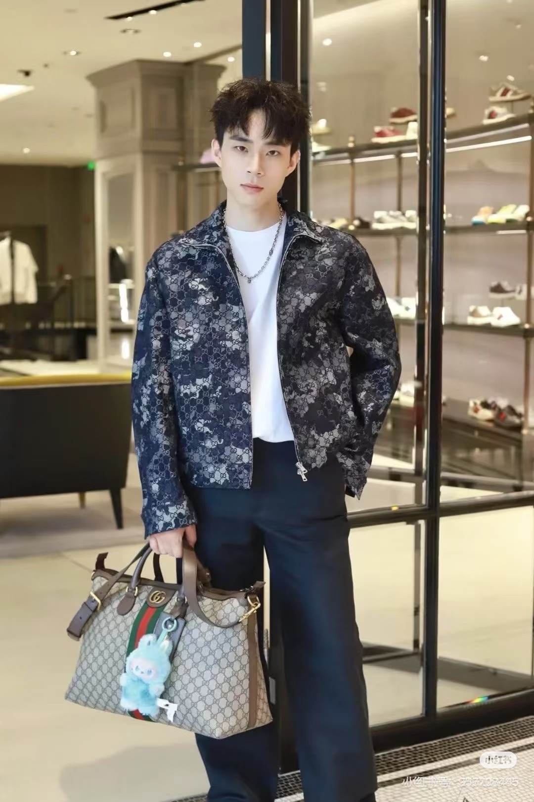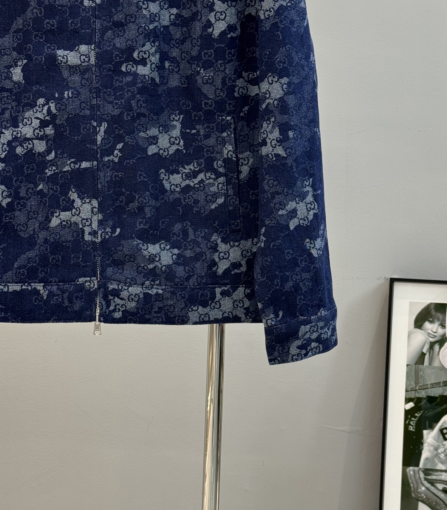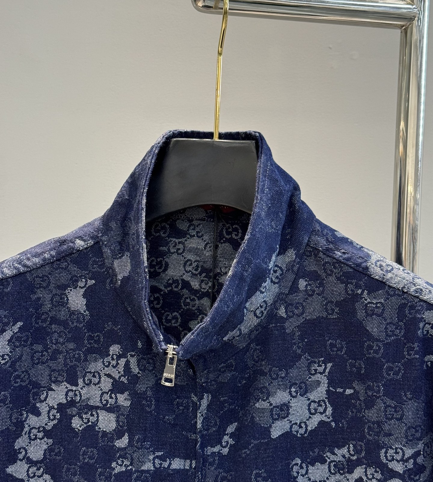 Home•Apparel•Suit•Gucci printed denim jacket with stand collar. Custom jacquard denim, deep blue with ivory white. Features marble effect pattern, leather label, and zipper. European sizes S-XL.