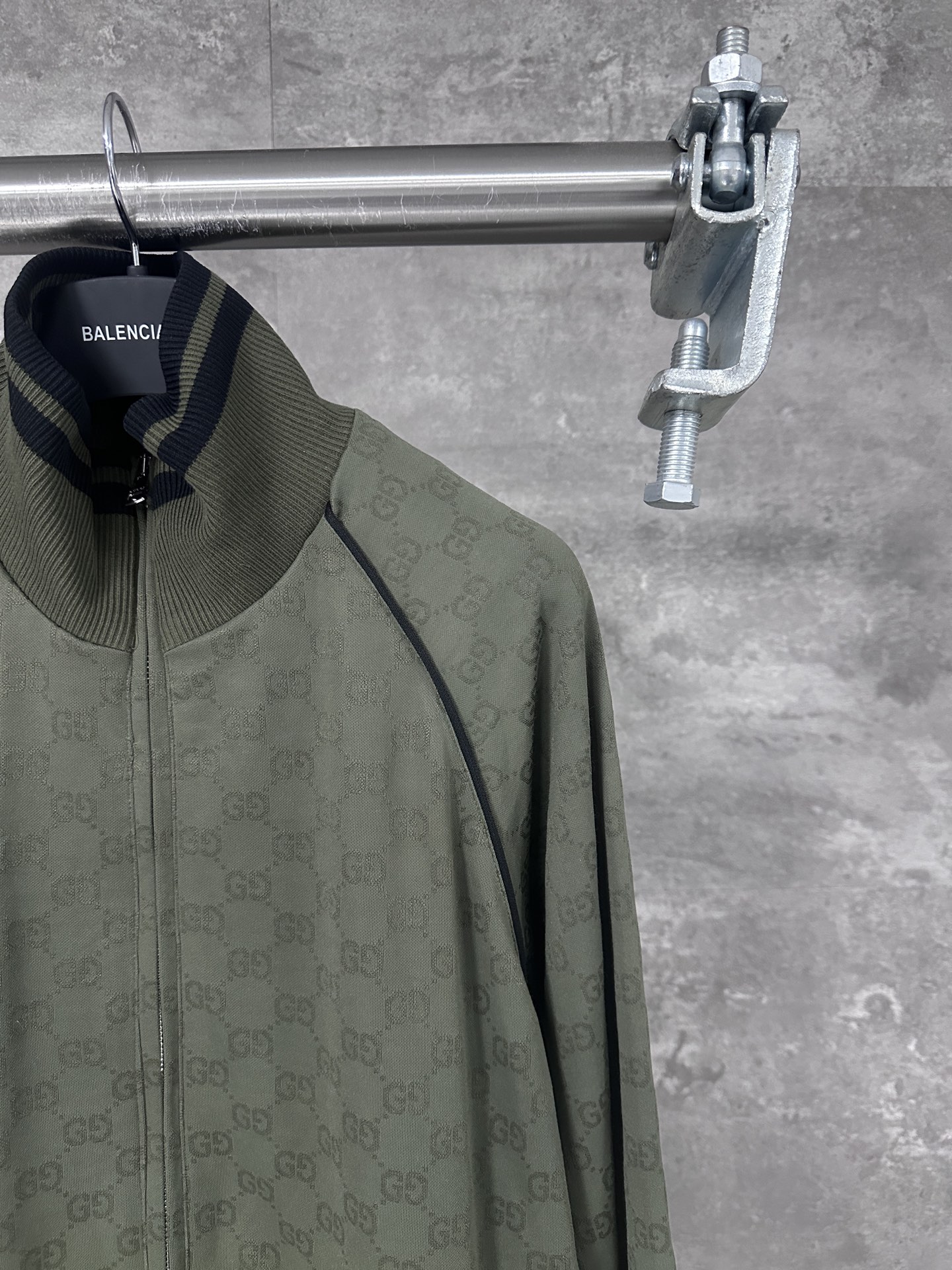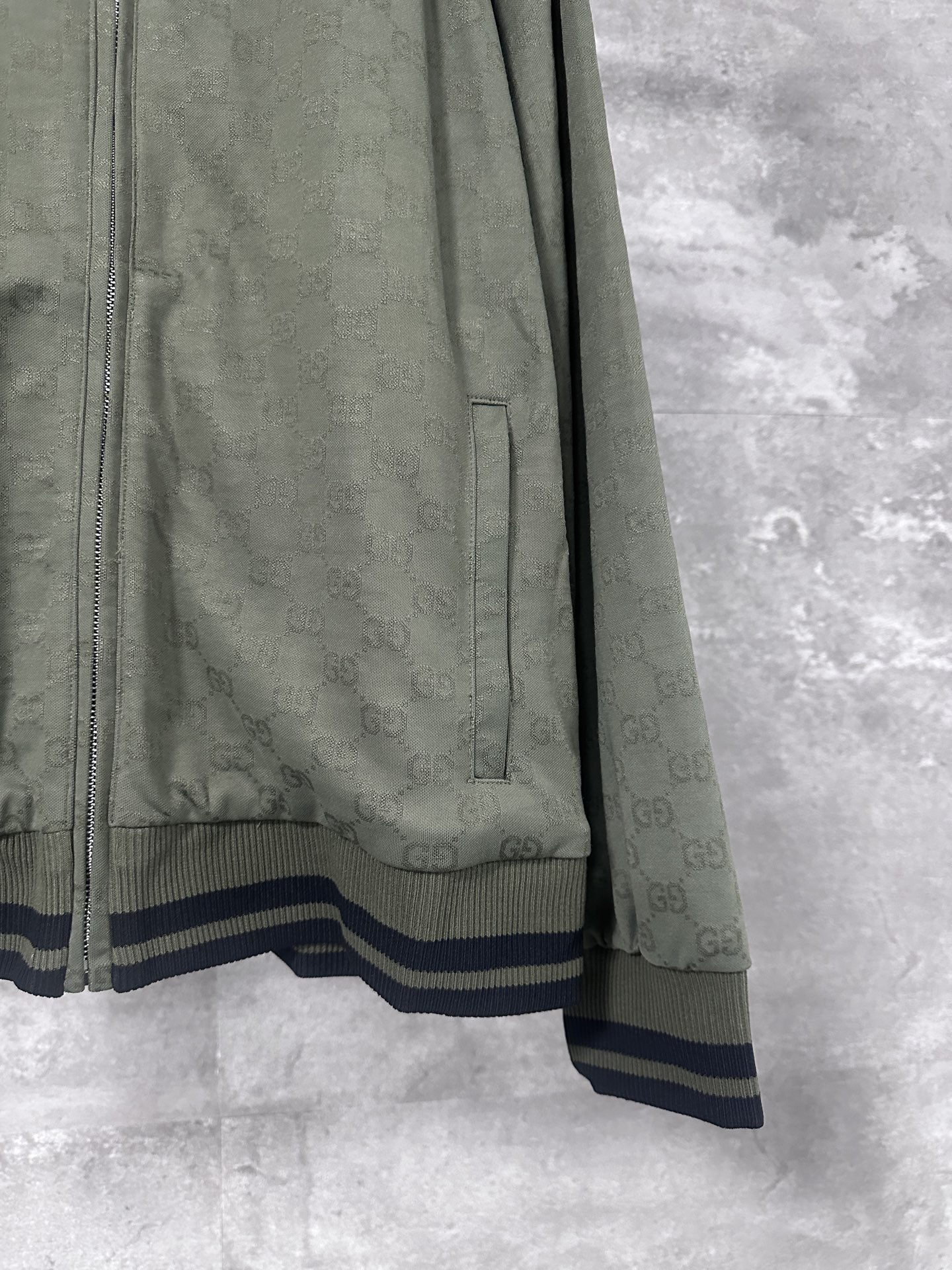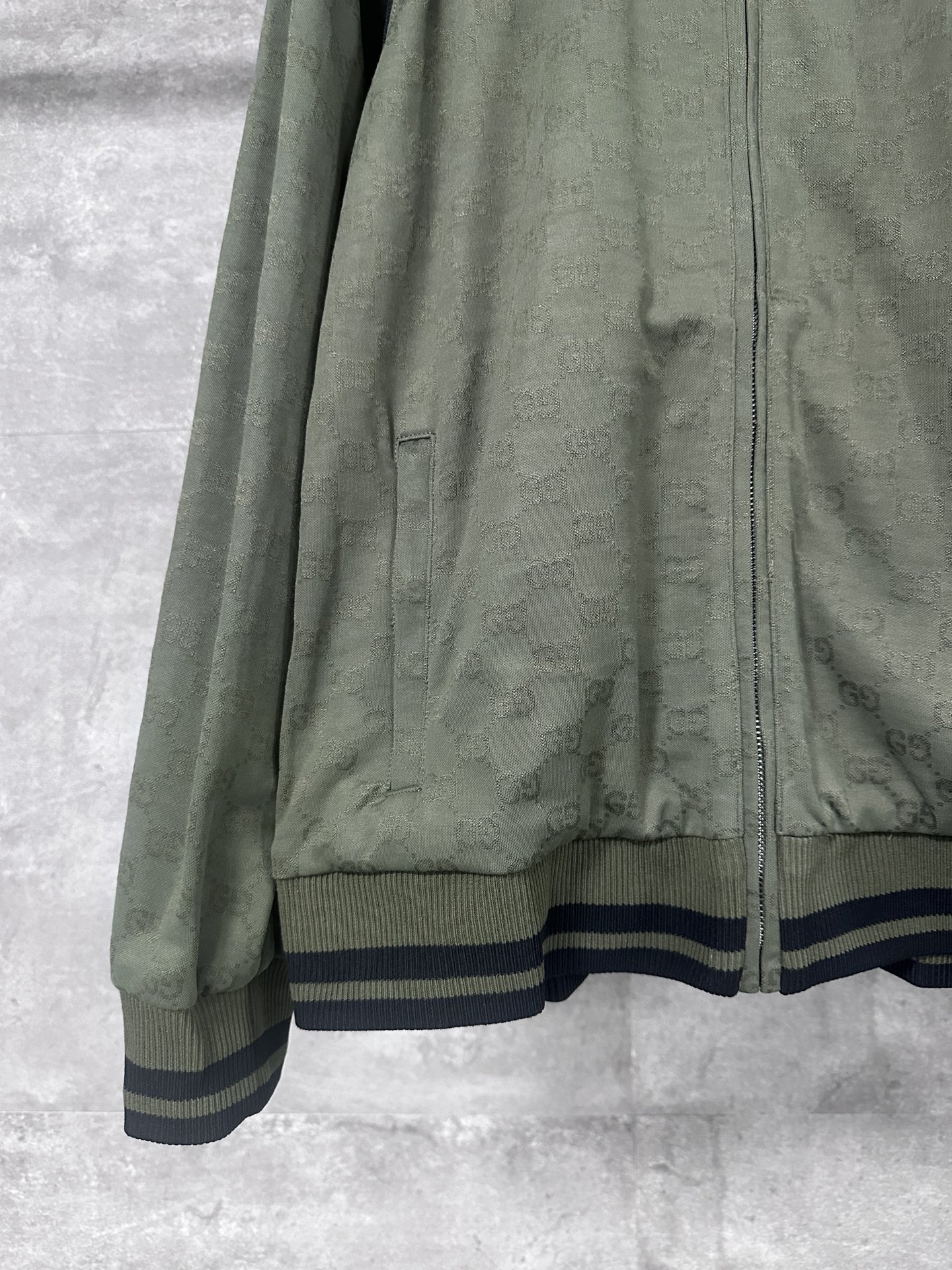 Gucci 2025 Forest Green GG Jacquess Zip Jacket. Loose Bohemian style with trim details. Sizes: S/M/L/XL.