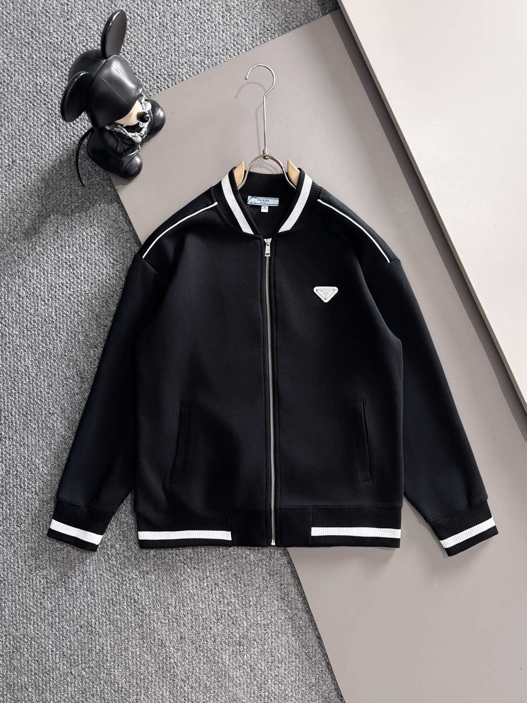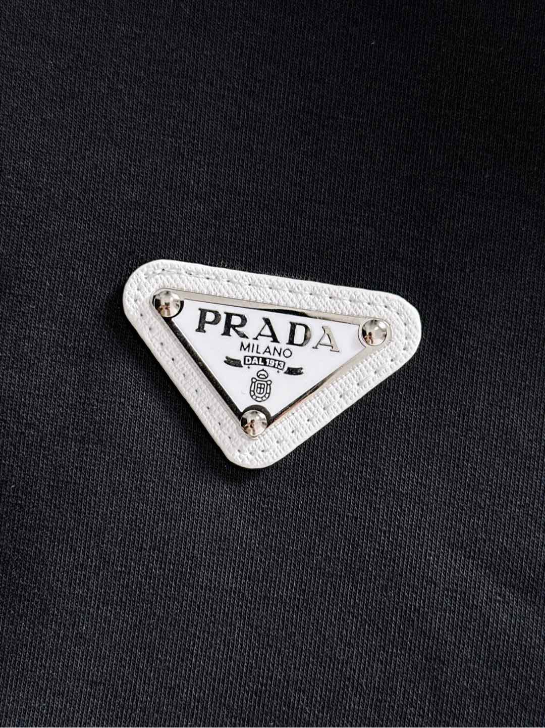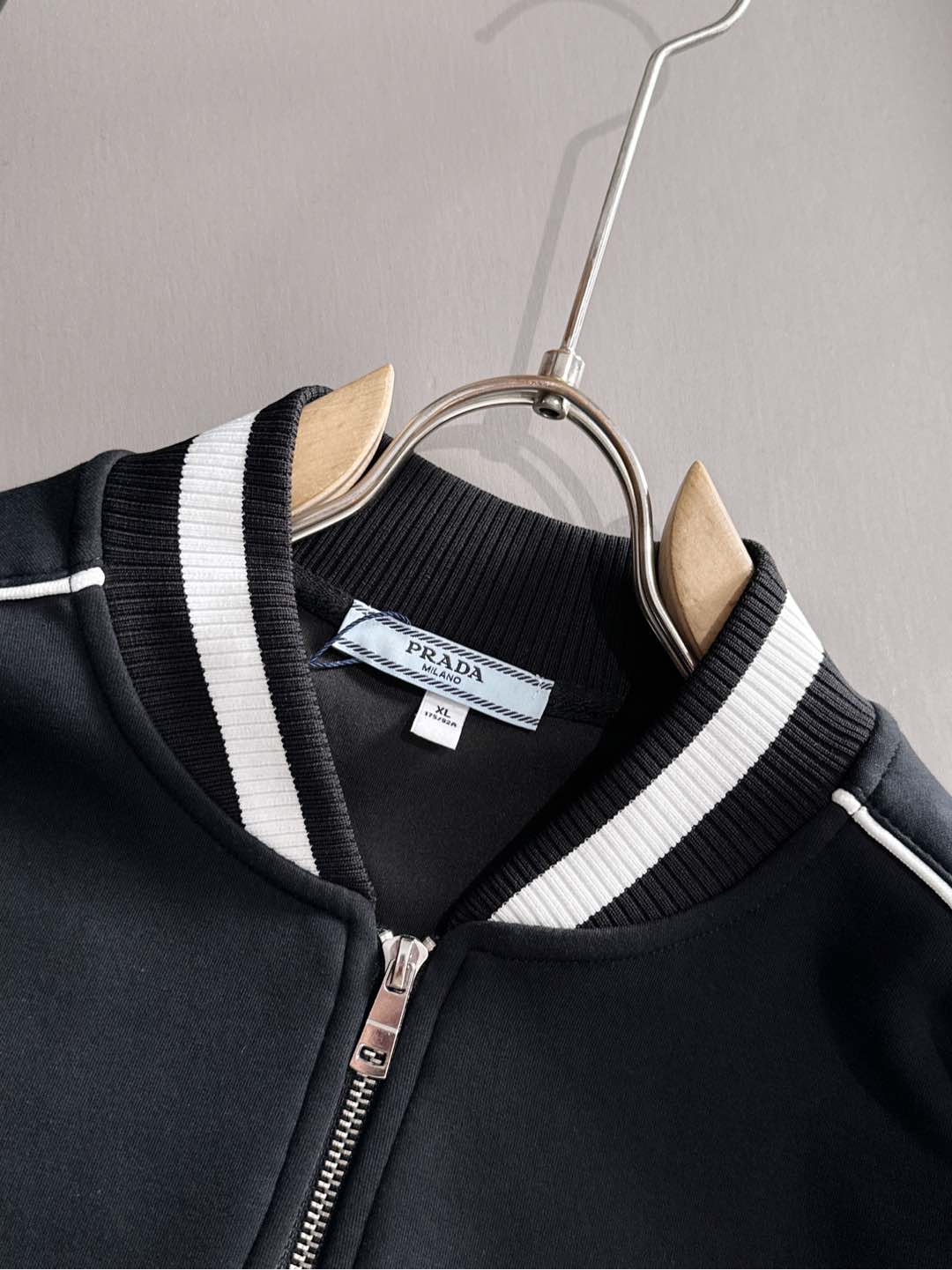 Prada set with top拼接, jacquard zipper pants, logo embroidery, classic black and white tape. Custom fabric, premium craftsmanship. Full classic labels. Sizes M-3XL.