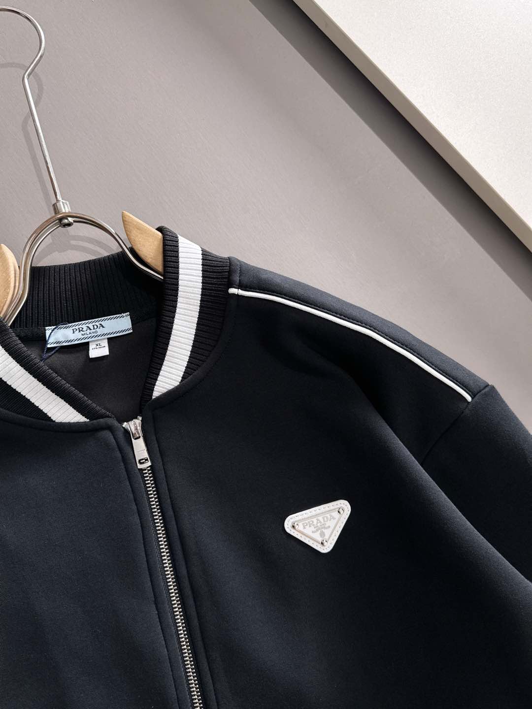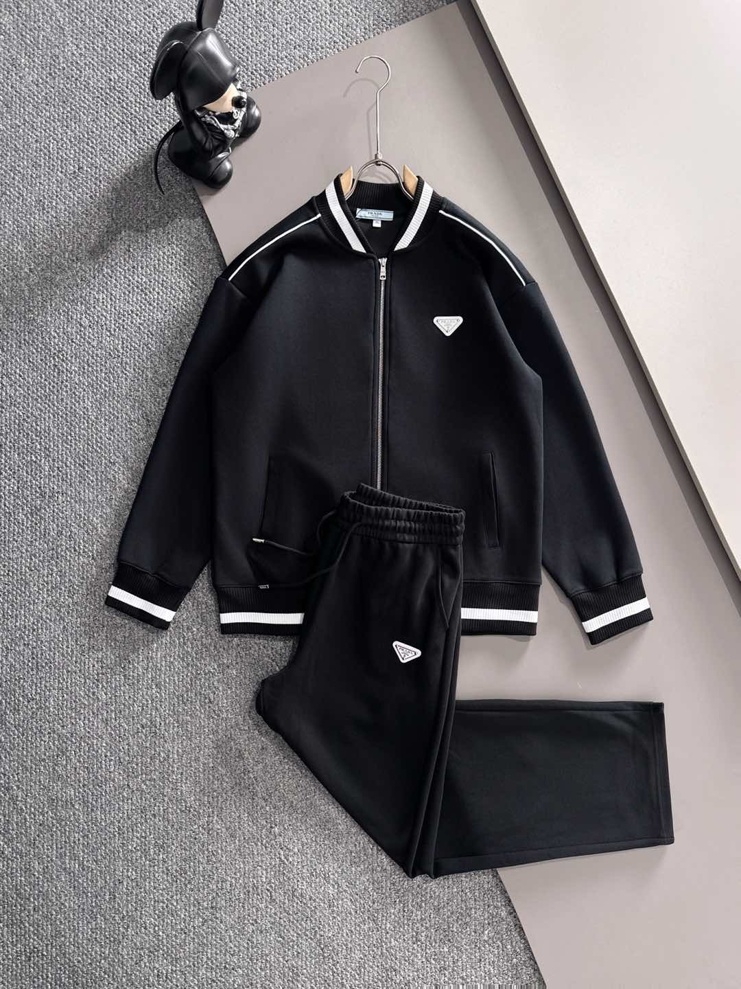 Prada P310 set, top拼接suit with ribbon jacquard zipper pants. Logo embroidery, classic black and white ribbon, versatile counter version. Custom fabric, fine craftsmanship, complete with 3 labels. Trendy men's fashion, unparalleled comfort. Sizes: M-3XL.