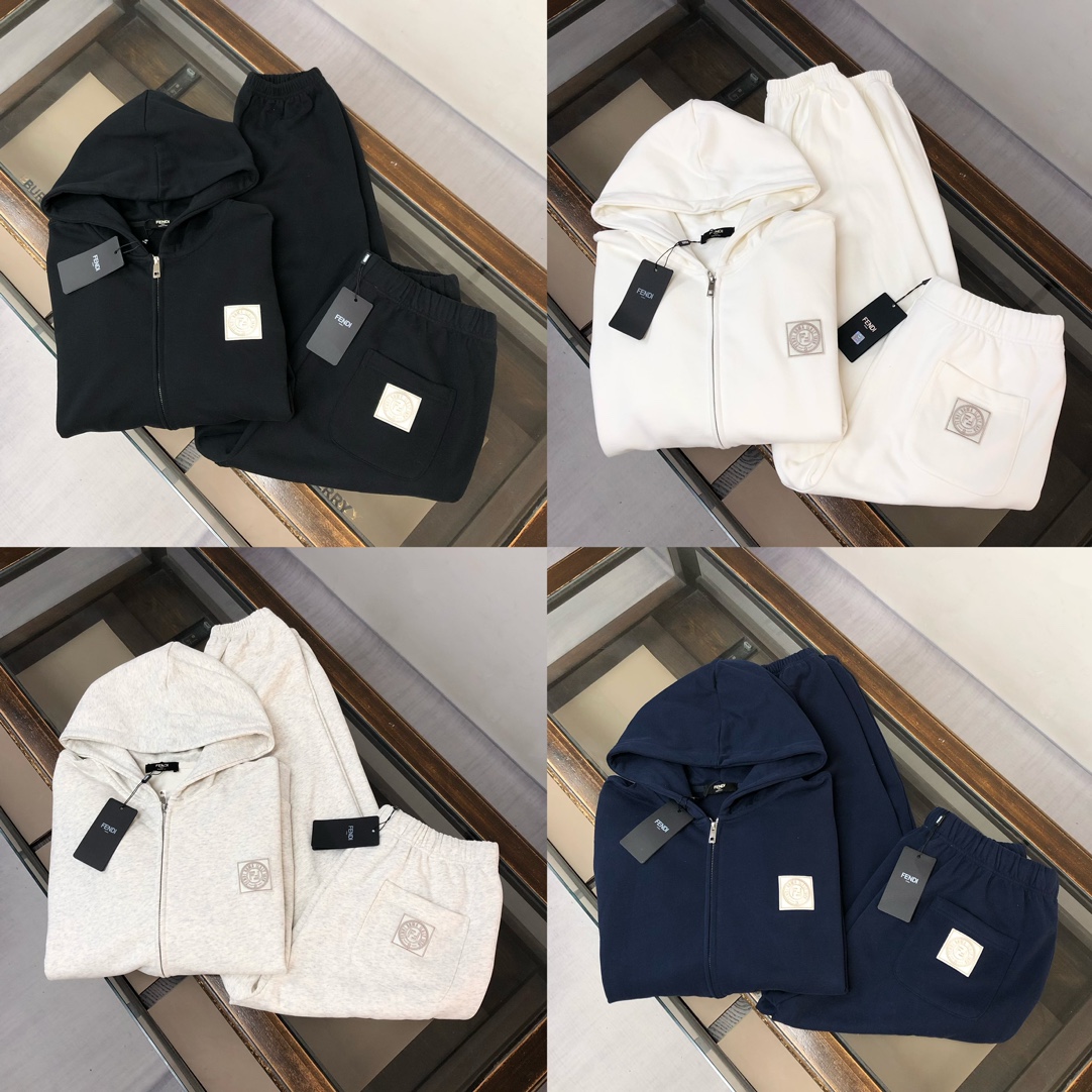 FENDI 2025 early autumn hoodie & sweatpants set. Custom 420g cotton, logo detail. Colors: black, white, blue, gray. Sizes: S-XXL.