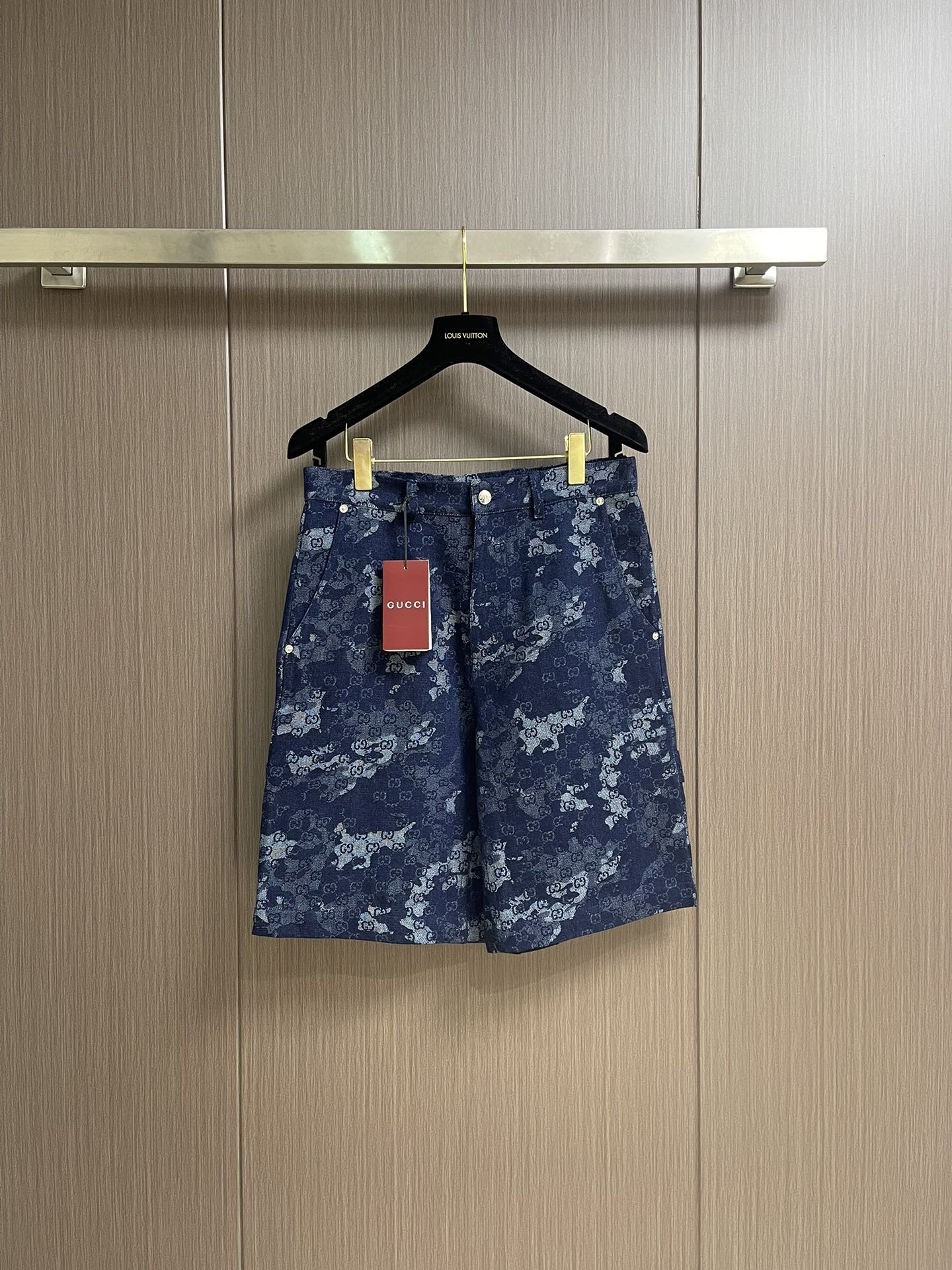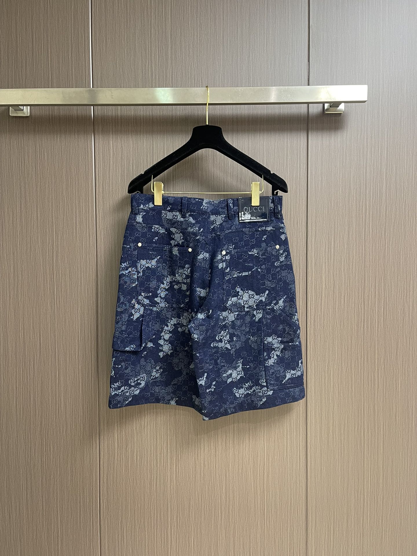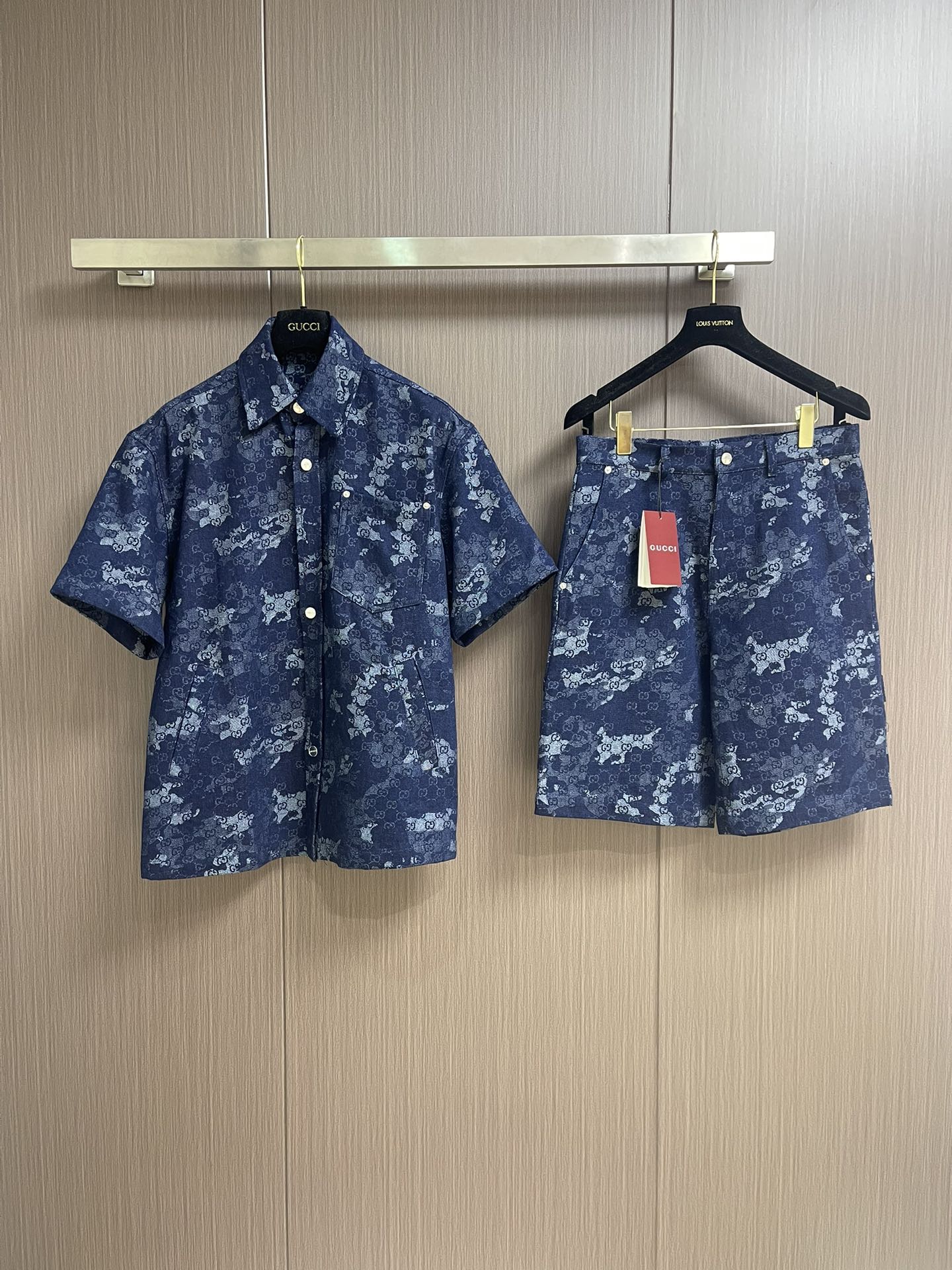 GUCCI jacquard denim short sleeve shirt and shorts set. 2025 early fall series blends denim with elegant details for sophisticated daily wear. Dark blue and ivory GG marble jacquard with metal buttons. Sizes: S-XL.