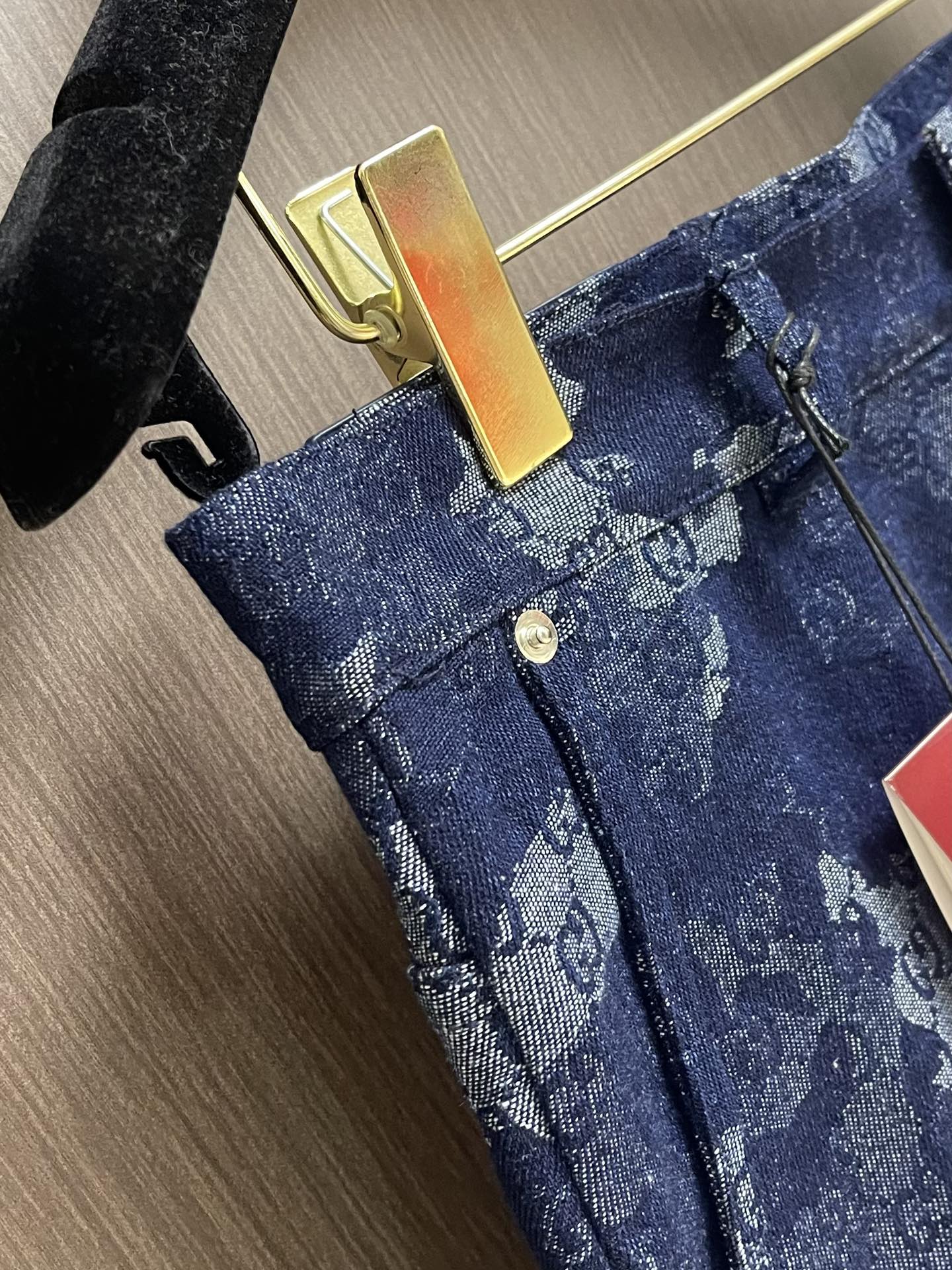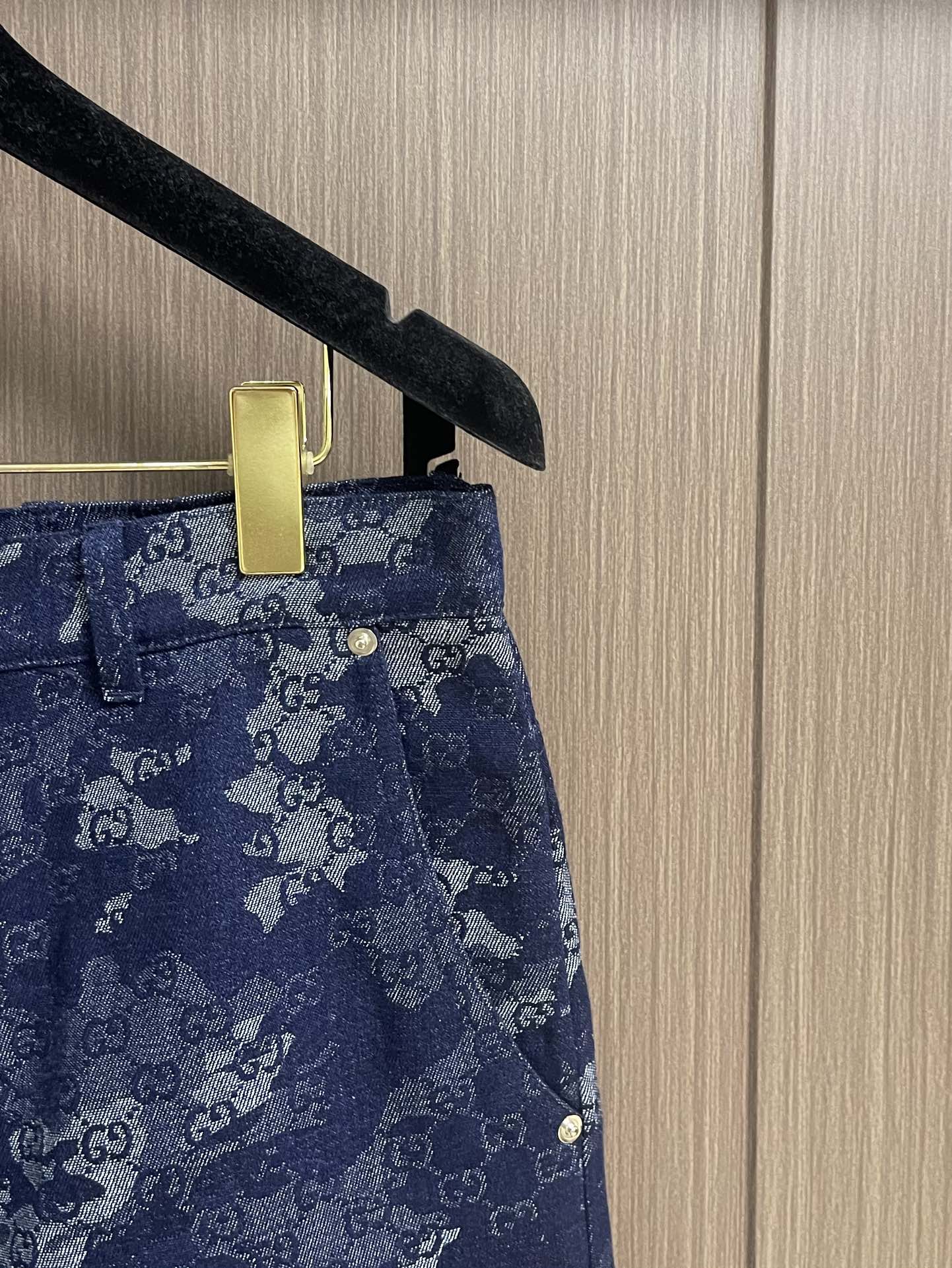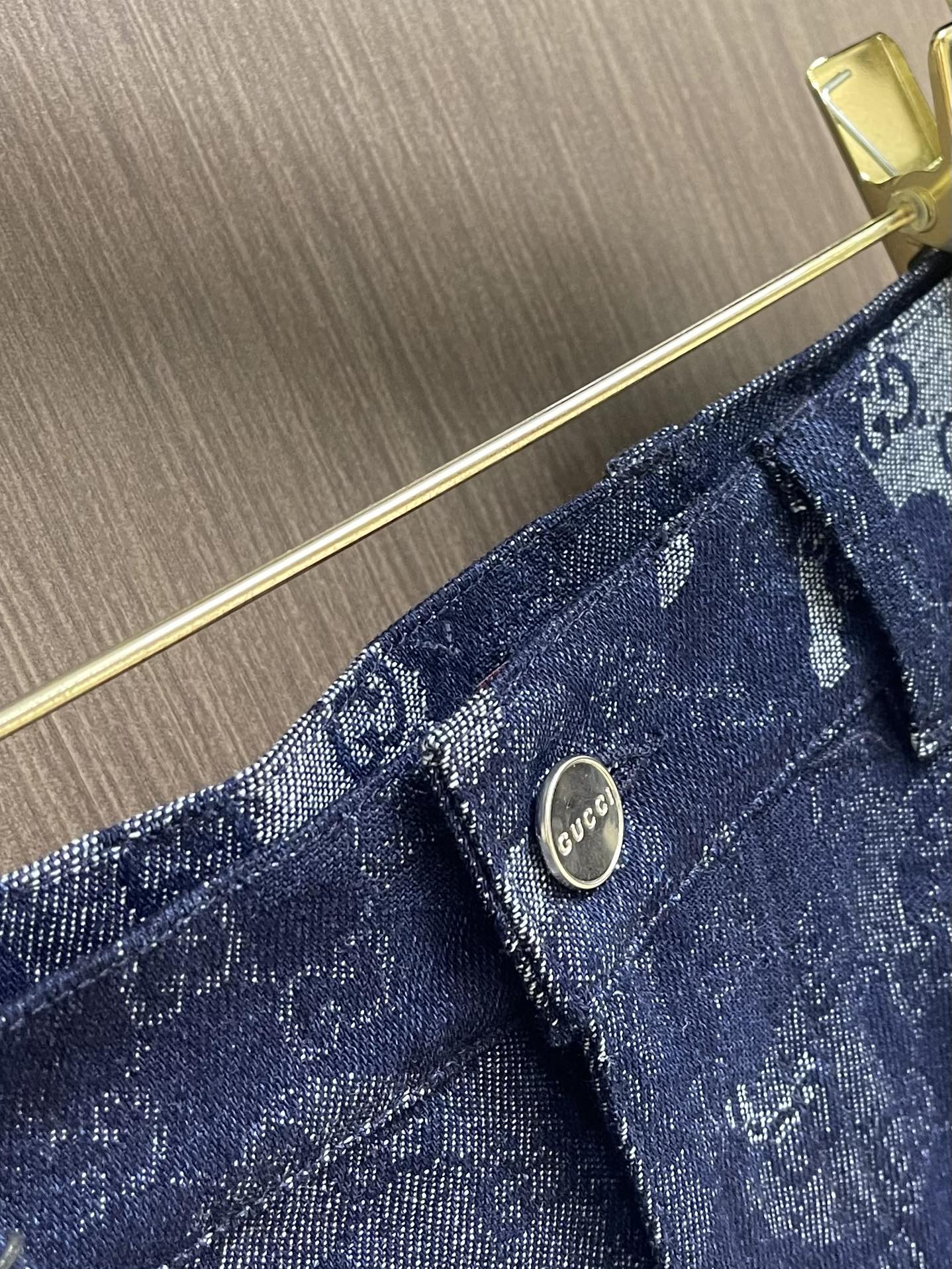 GUCCI jacquard denim short sleeve shirt and shorts set. 2025 early fall series blends denim with elegant details for sophisticated daily wear. Dark blue and ivory GG marble jacquard with metal buttons. Sizes: S-XL.
