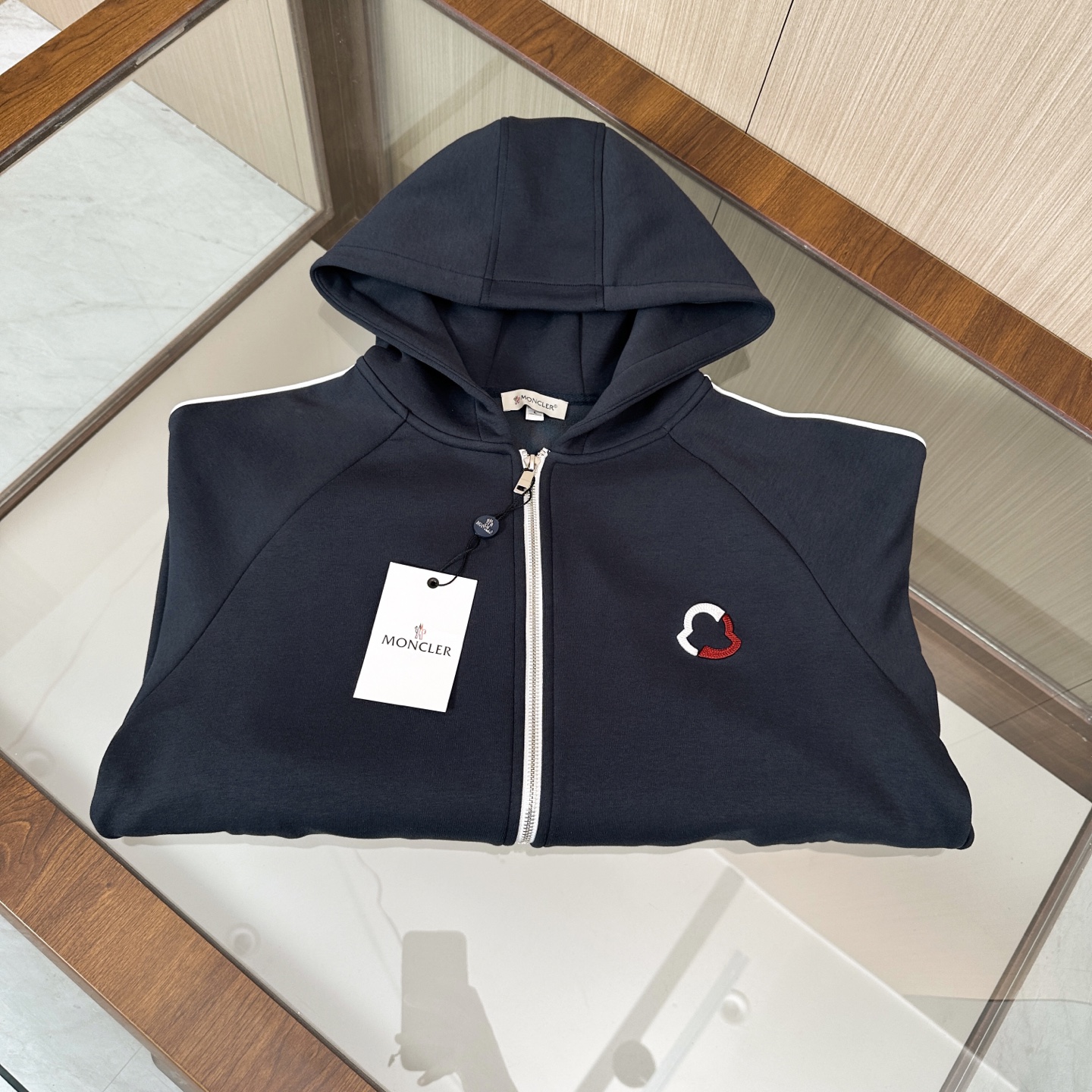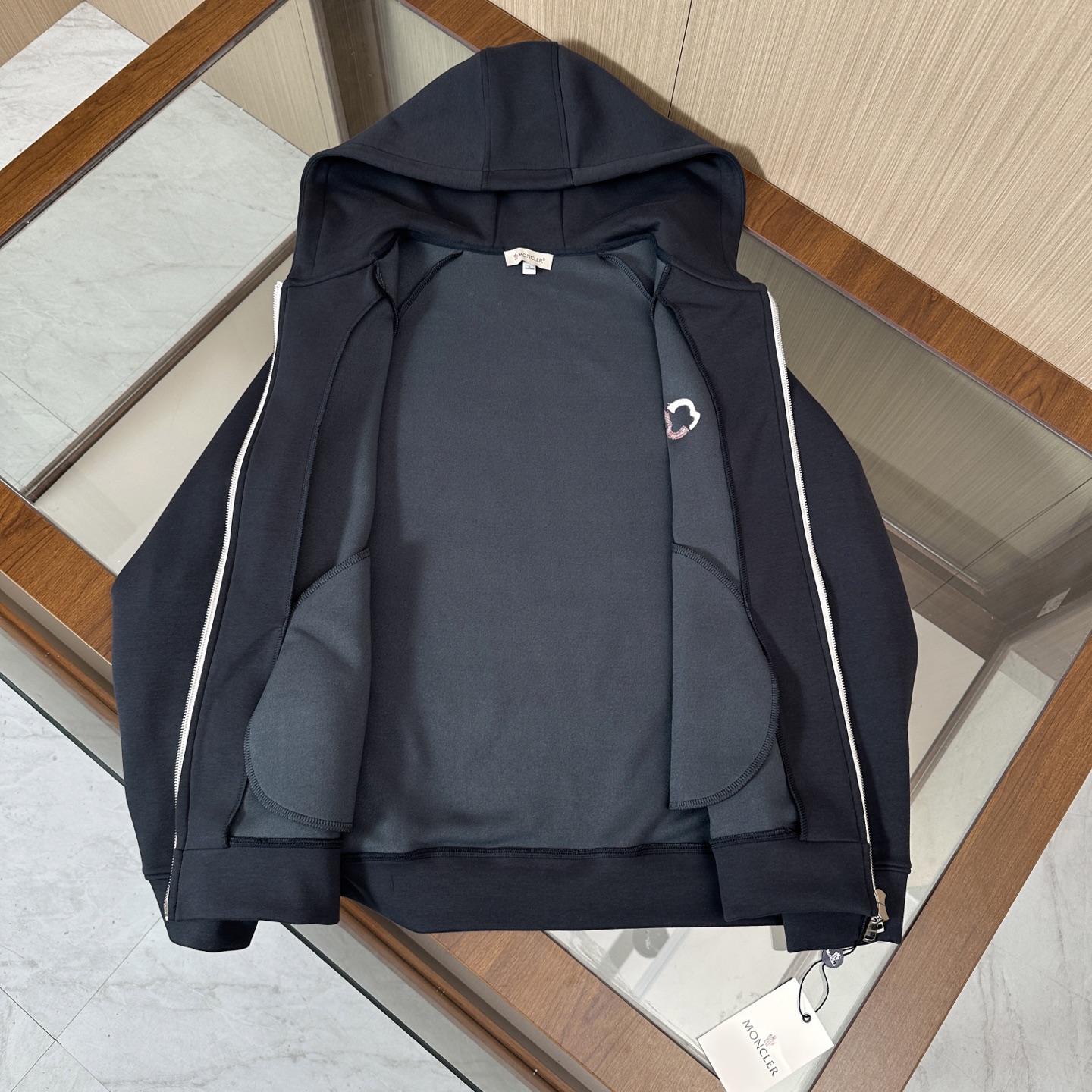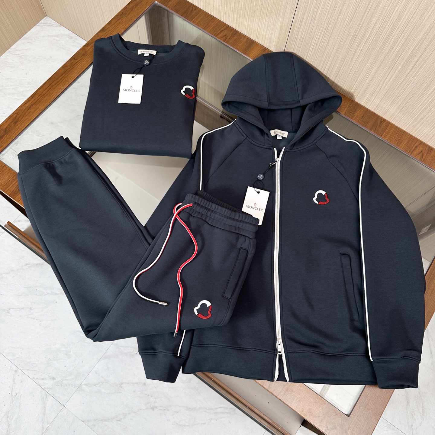 Moncler three-piece set: hooded jacket, sweatshirt, pants. Custom cotton fabric, embroidered logo, slim fit. Lightweight, warm, minimalist style. Colors: black, blue, off-white. Sizes: M-3XL.