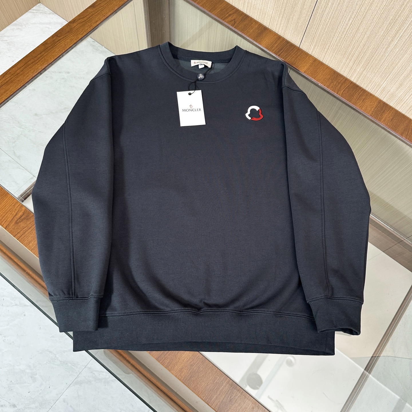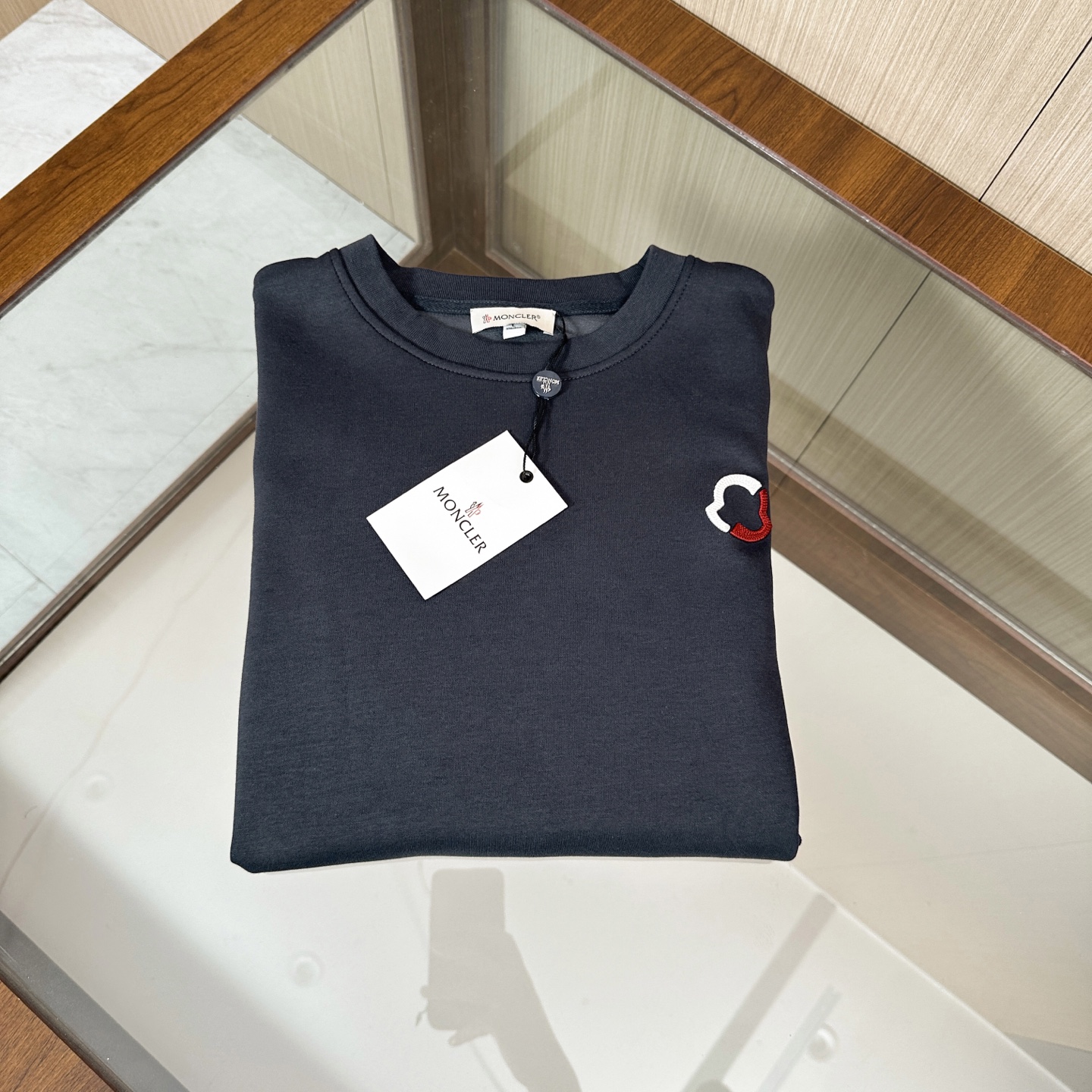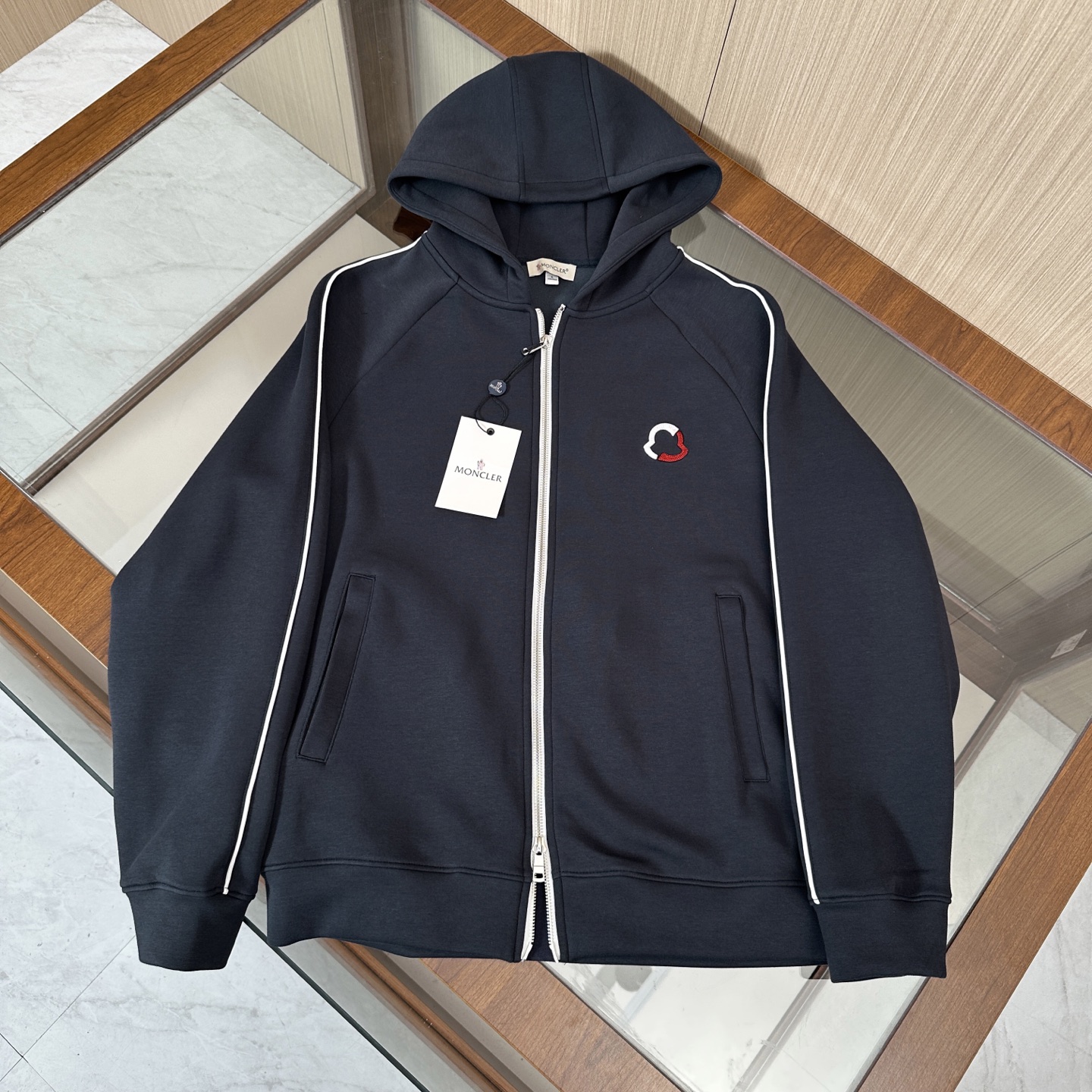 Moncler three-piece set: hooded jacket, sweatshirt, pants. Custom cotton fabric, embroidered logo, slim fit. Lightweight, warm, minimalist style. Colors: black, blue, off-white. Sizes: M-3XL.