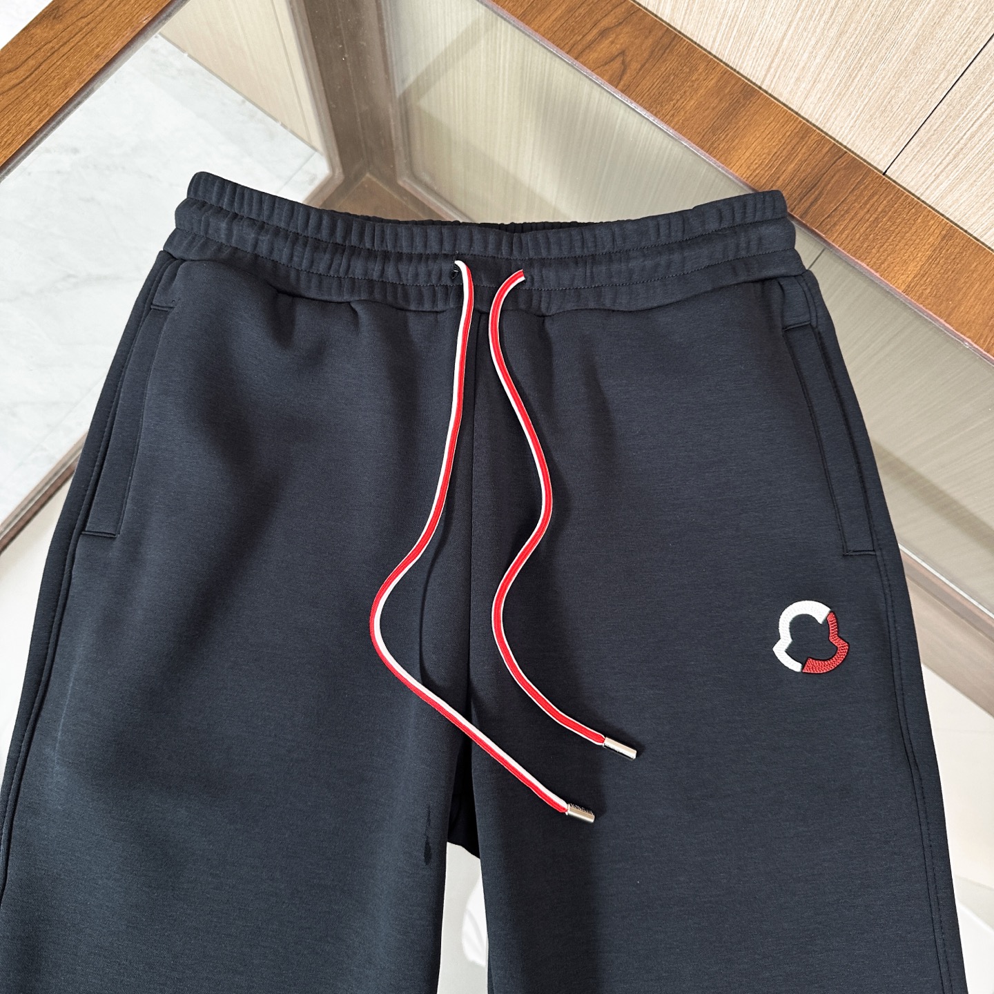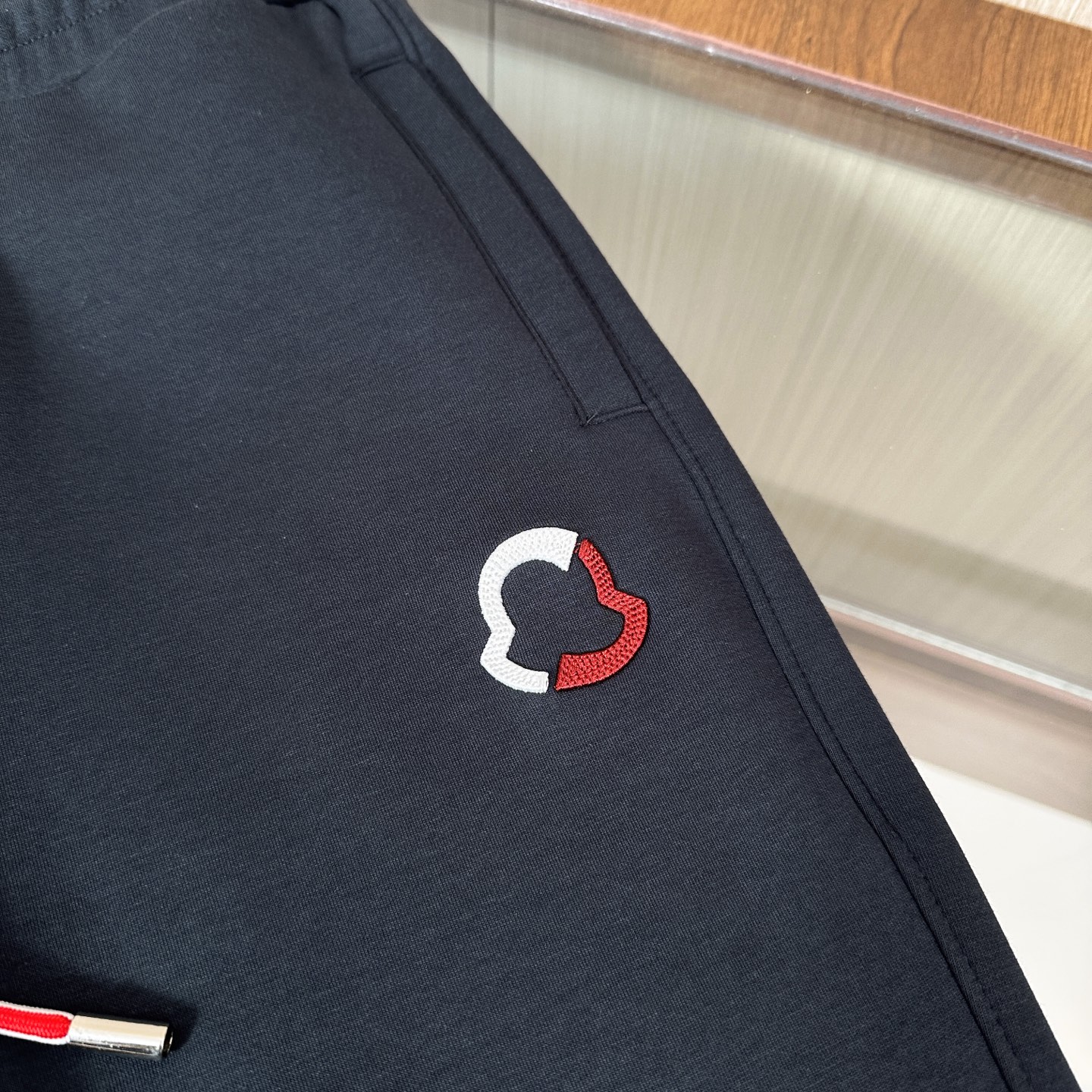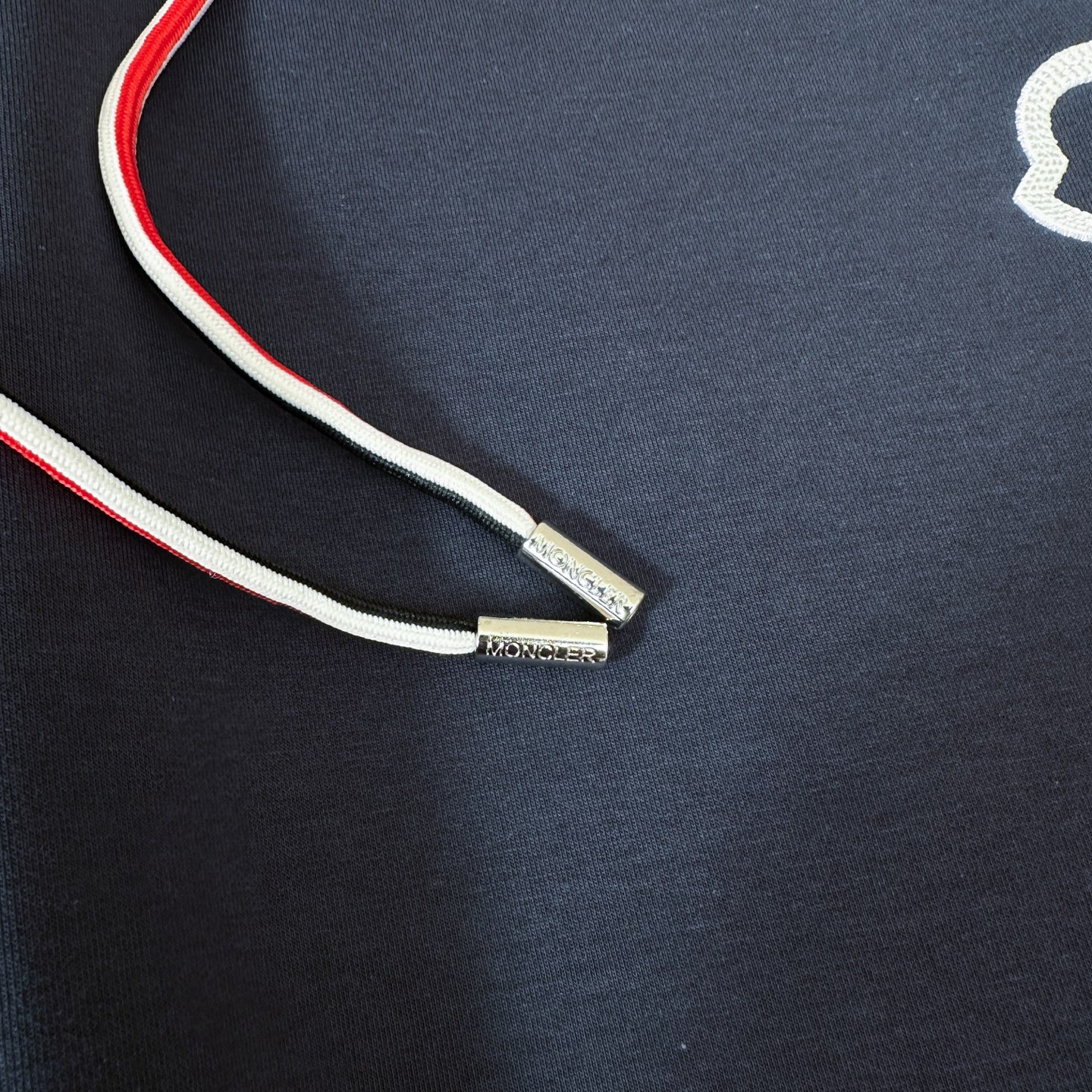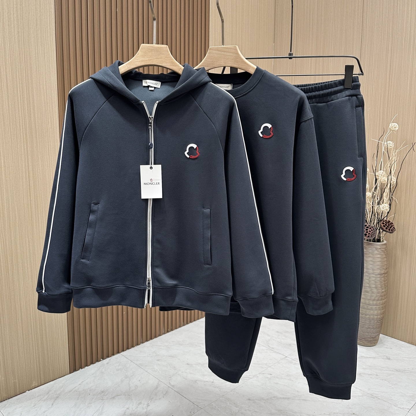 Moncler 3-piece set: hooded jacket, sweatshirt, pants. Custom cotton blend, embroidered logo, slim fit. Lightweight, warm, minimalist style. Colors: black, blue, off-white. Sizes: M-3XL.