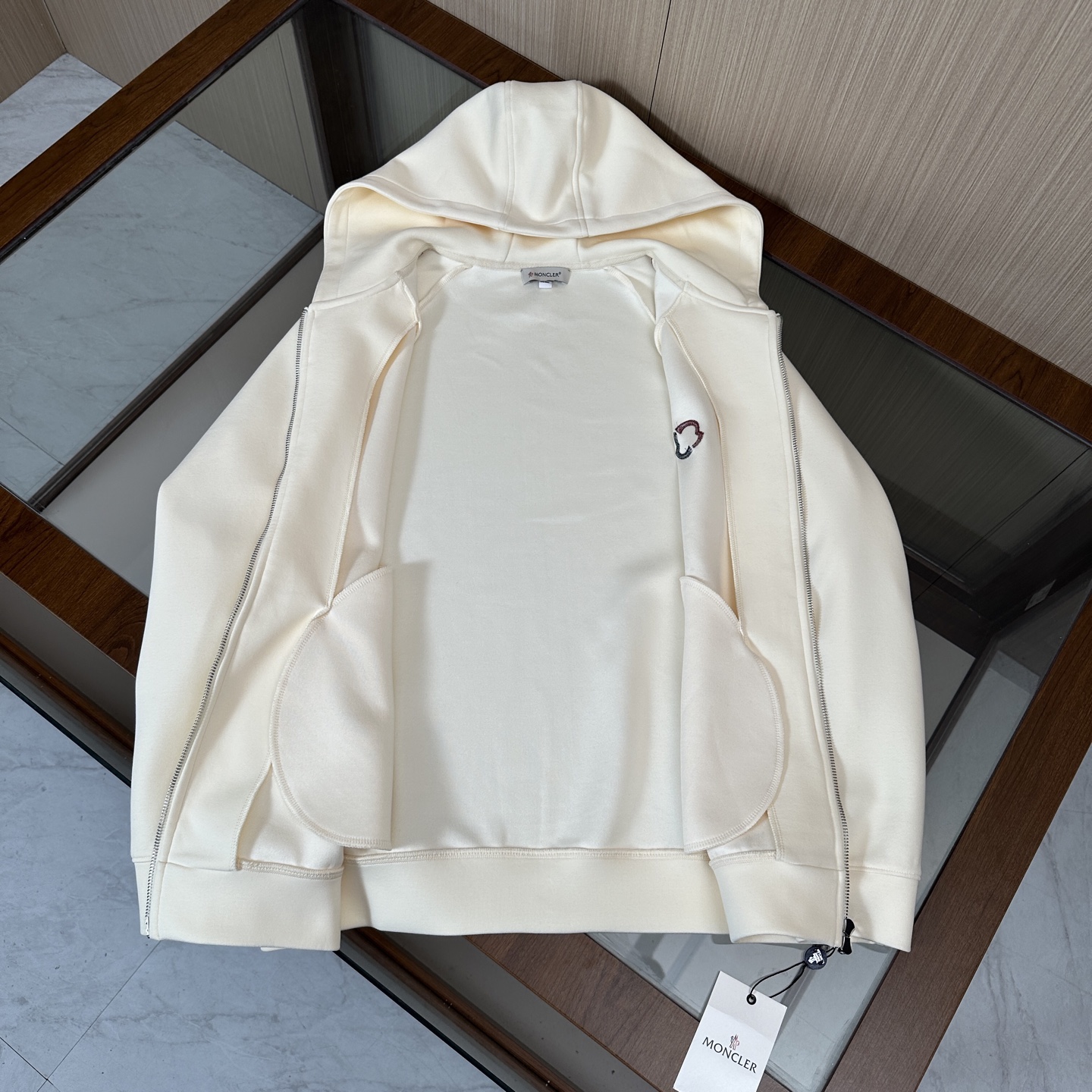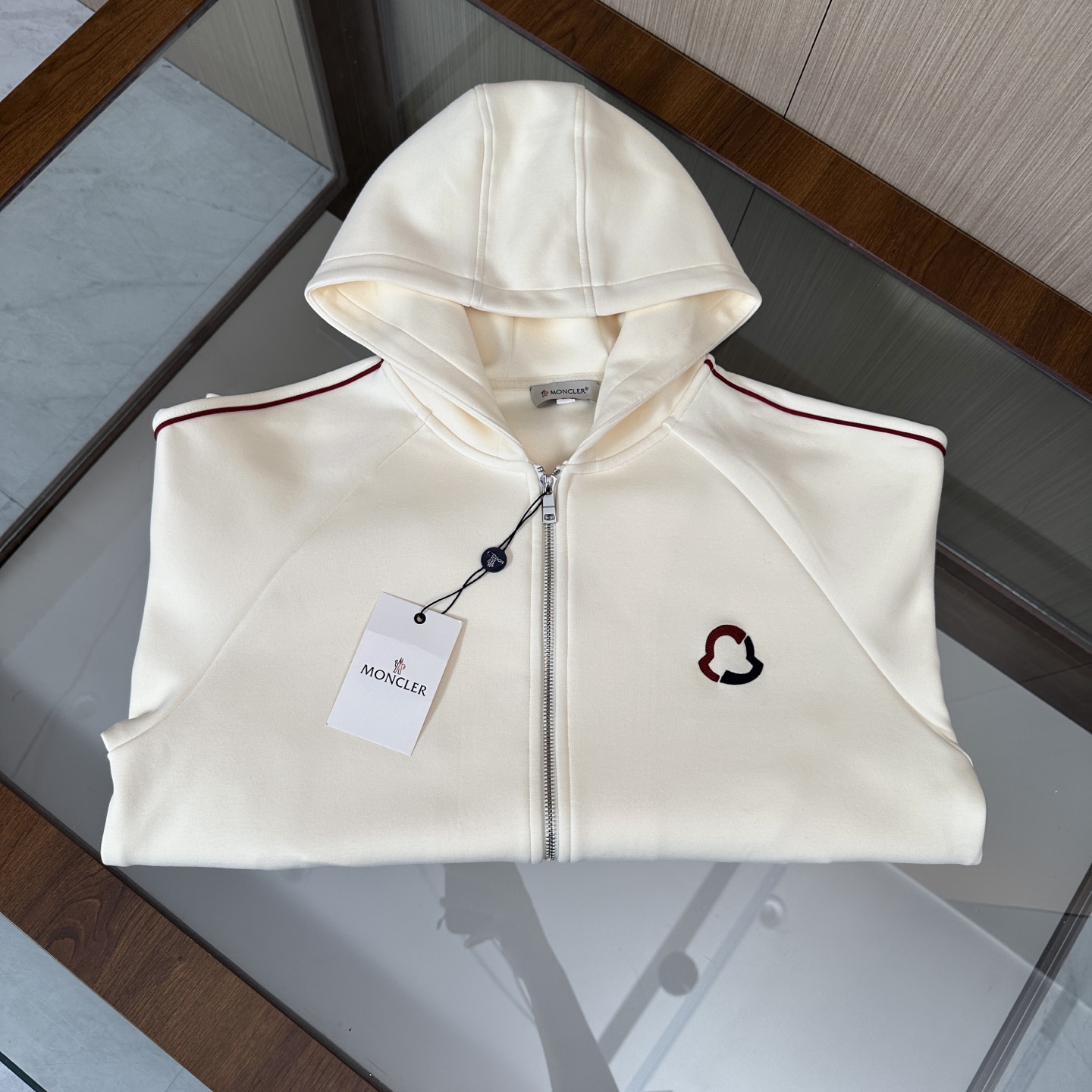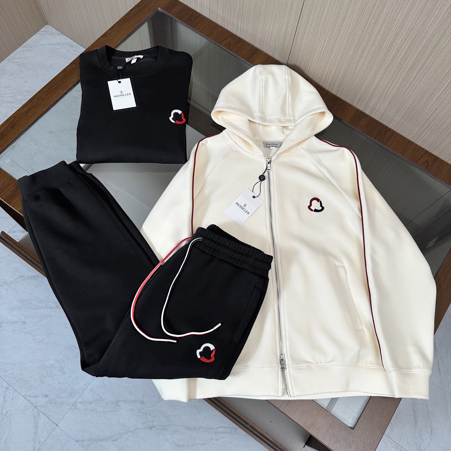 Moncler three-piece set: hooded jacket, hoodie, pants. Custom cotton blend, embroidered logo, slim fit. Lightweight, warm, minimalist style. Colors: black, blue, off-white. Sizes: M-3XL.