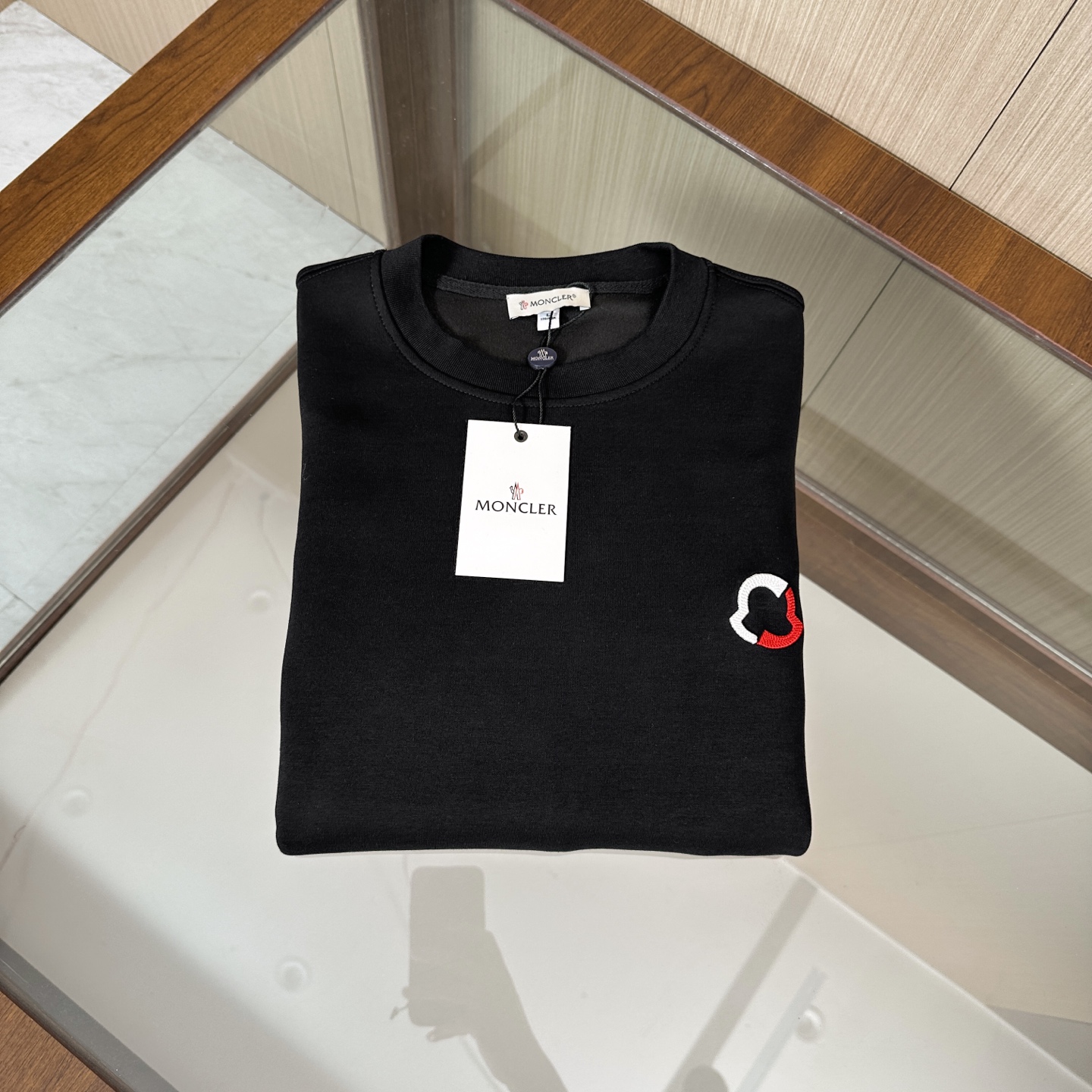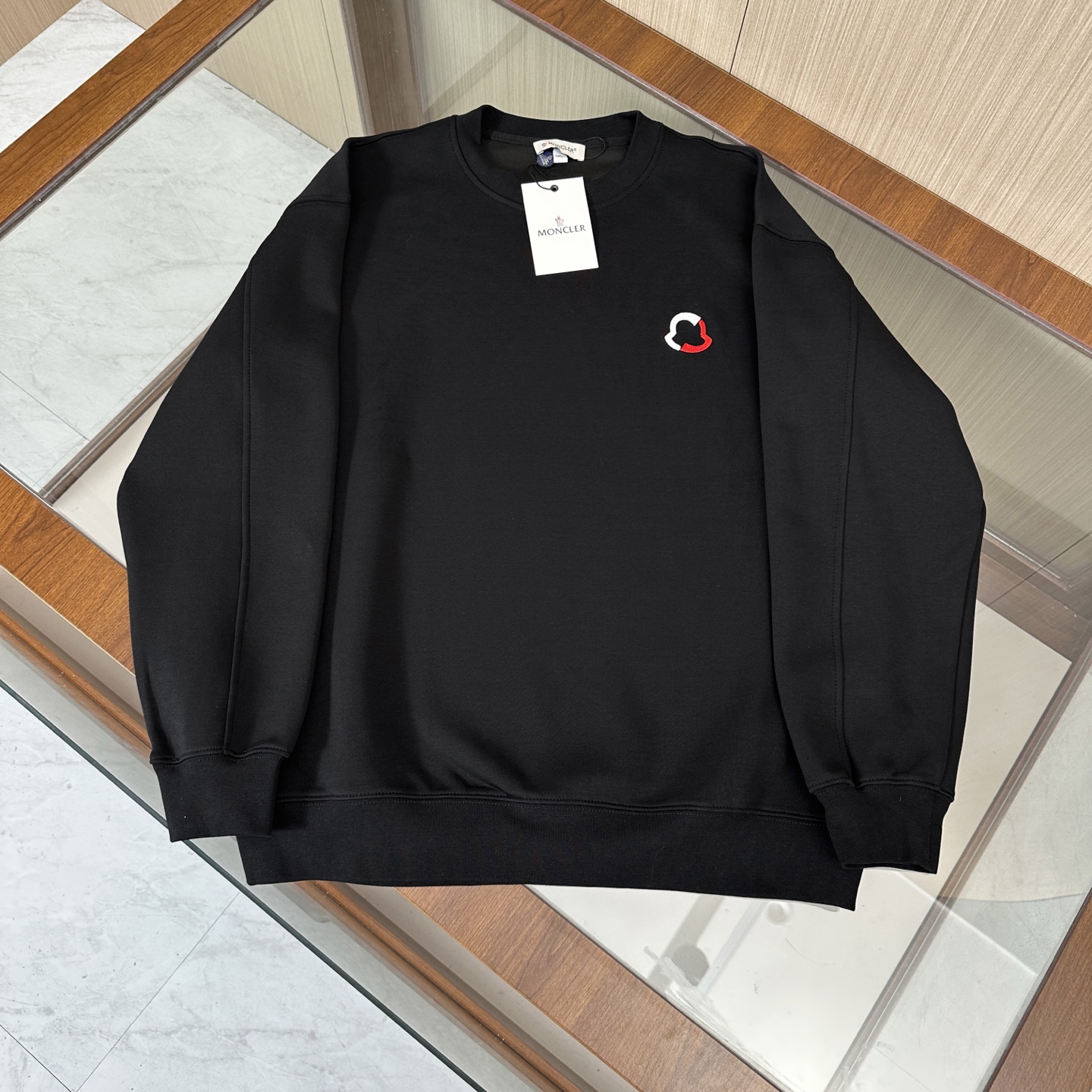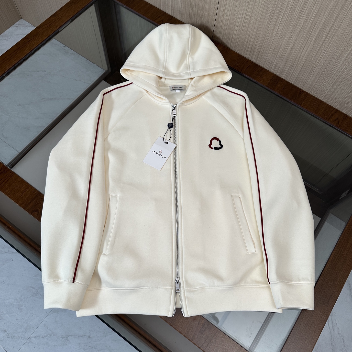 Moncler three-piece set: hooded jacket, hoodie, pants. Custom cotton blend, embroidered logo, slim fit. Lightweight, warm, minimalist style. Colors: black, blue, off-white. Sizes: M-3XL.