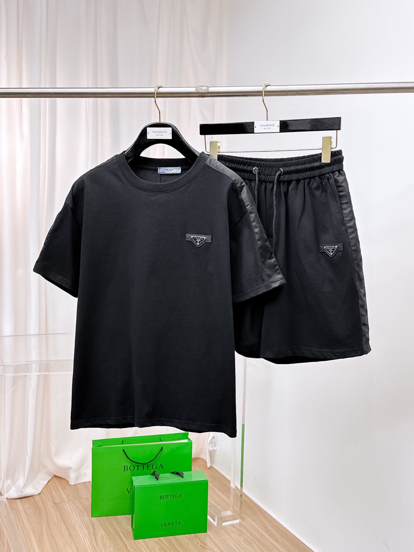 PRADA 2025 cotton short-sleeve and shorts set. Breathable, smooth fabric with classic logo. Sizes: M-3XL.