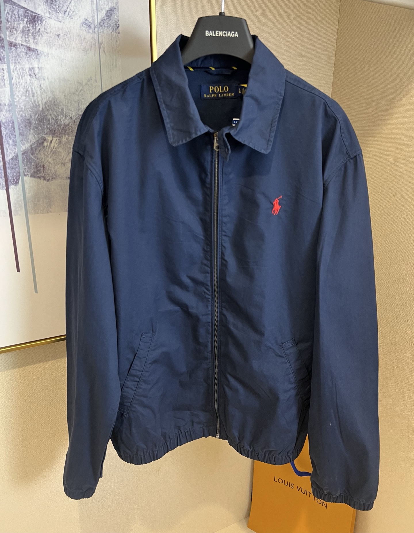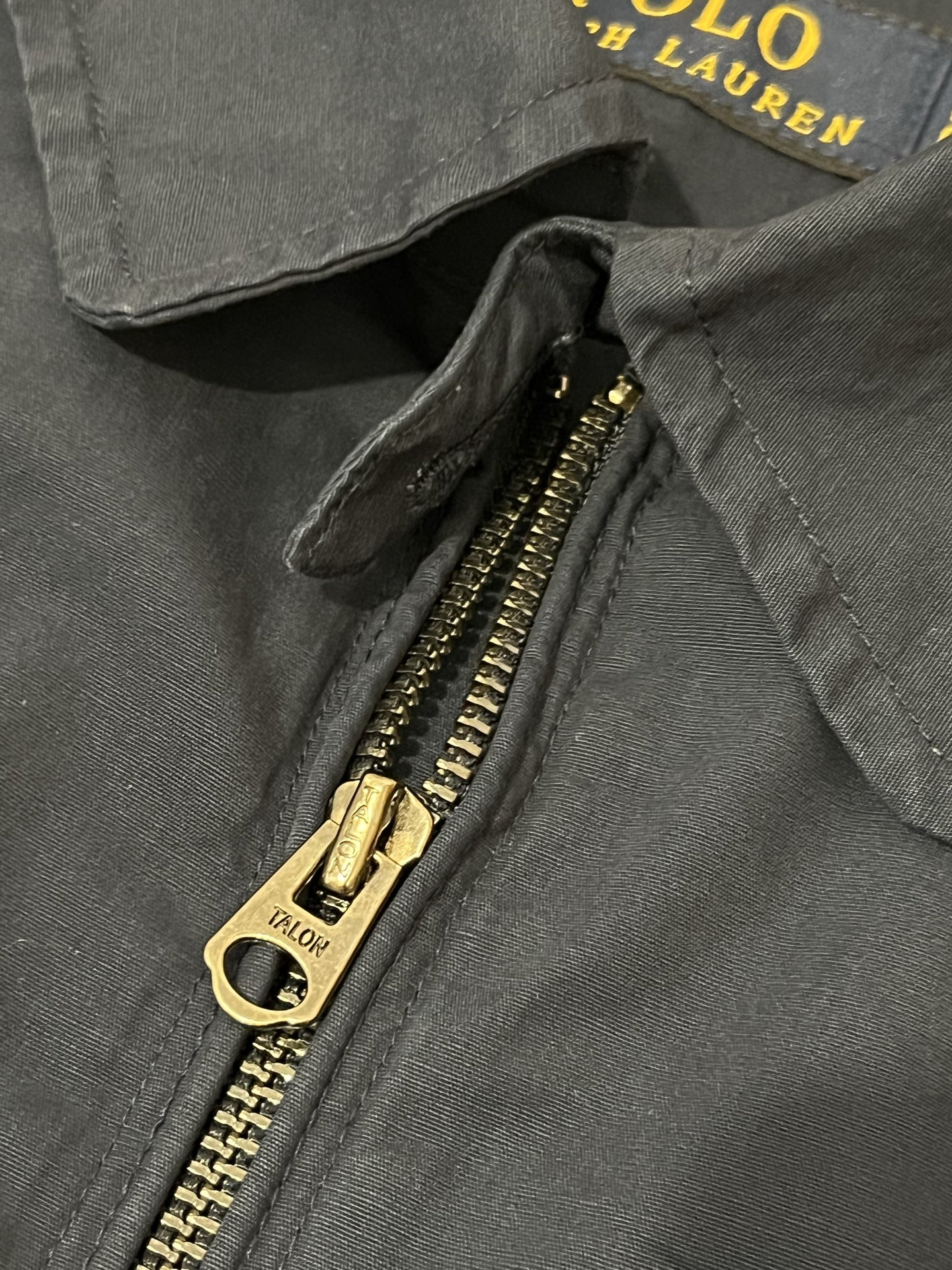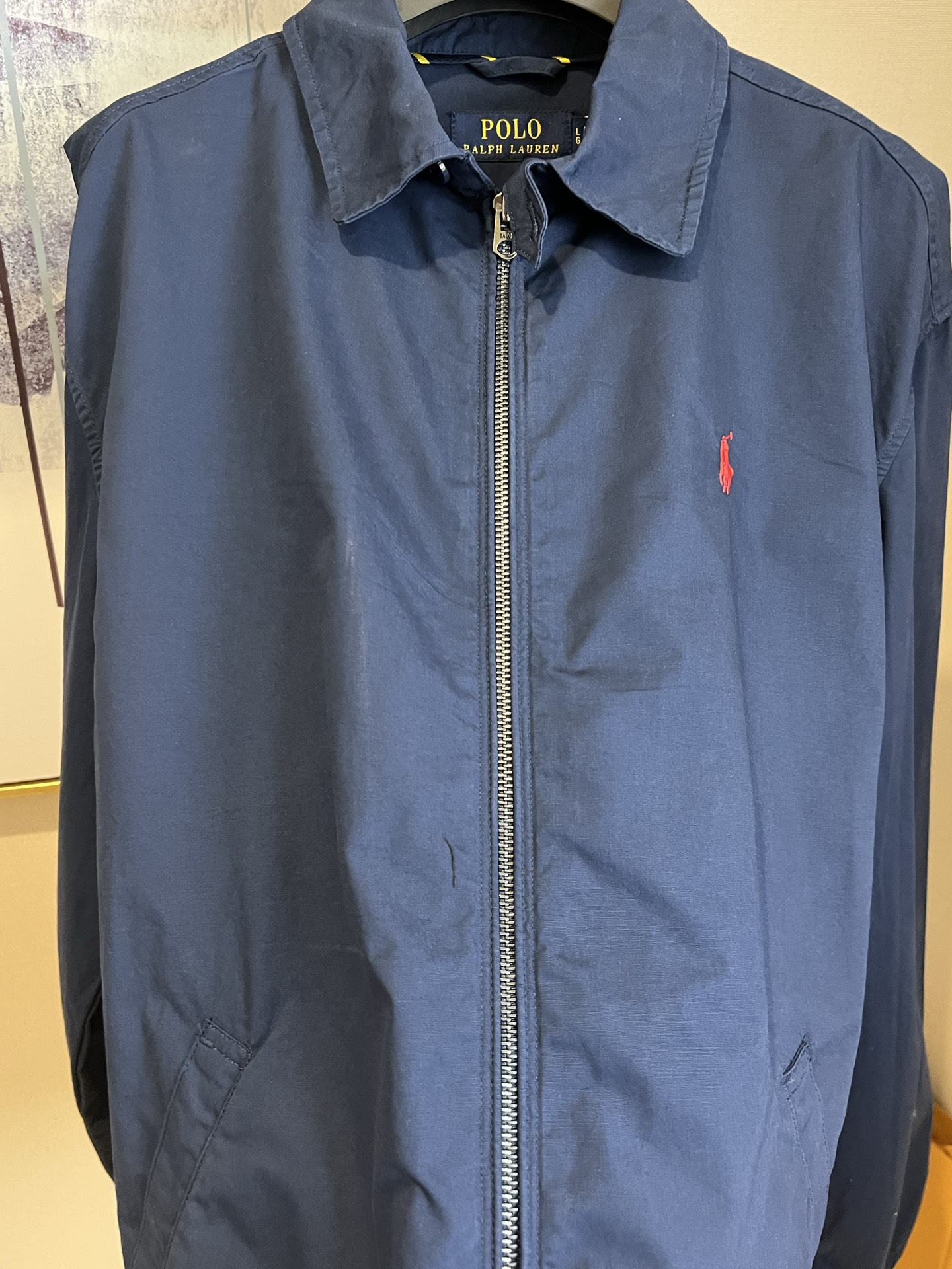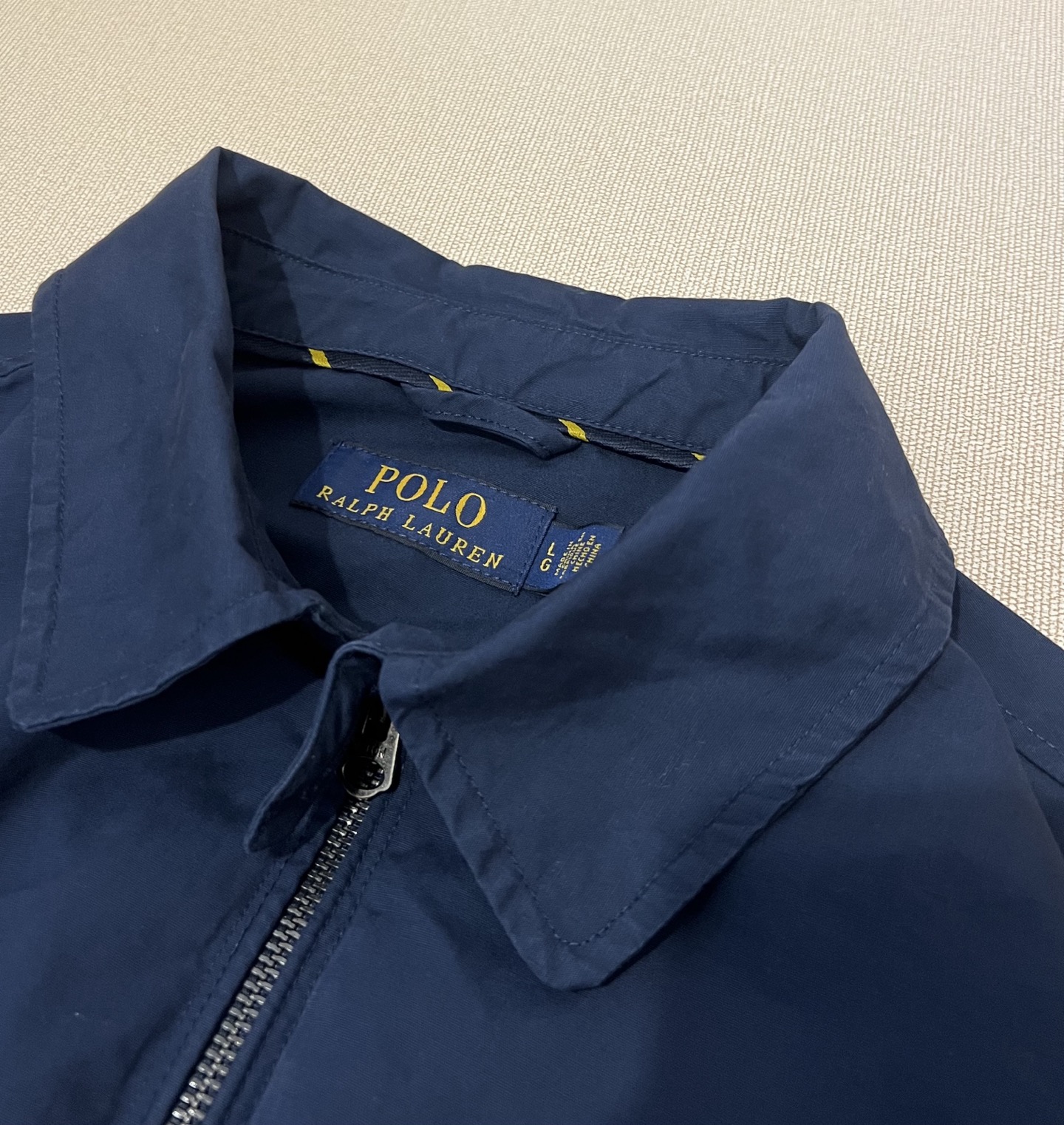 Ralph Lauren classic lapel zip jacket. Unisex. Colors: navy, khaki. Sizes: S, M, L, XL. Measurements provided.