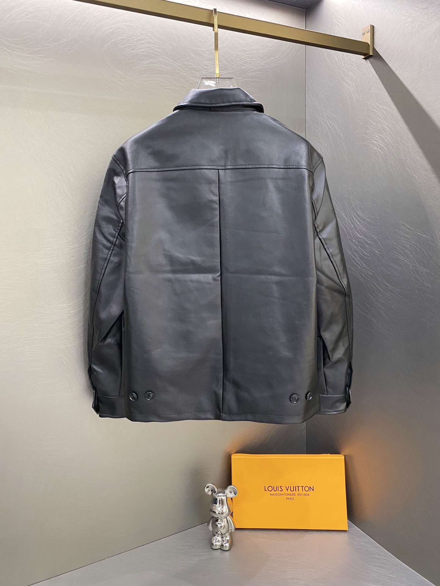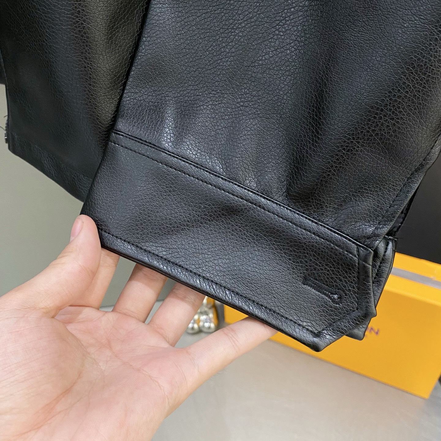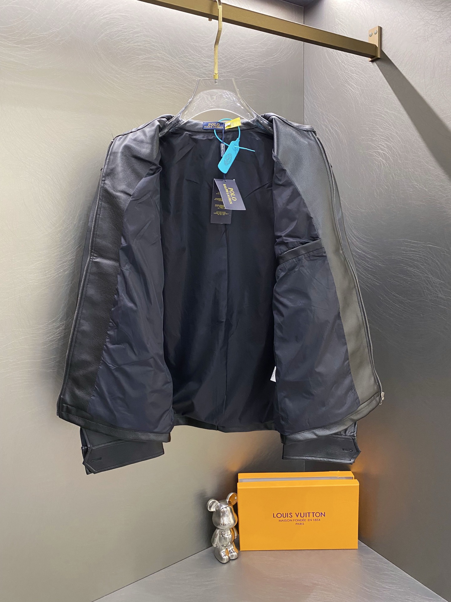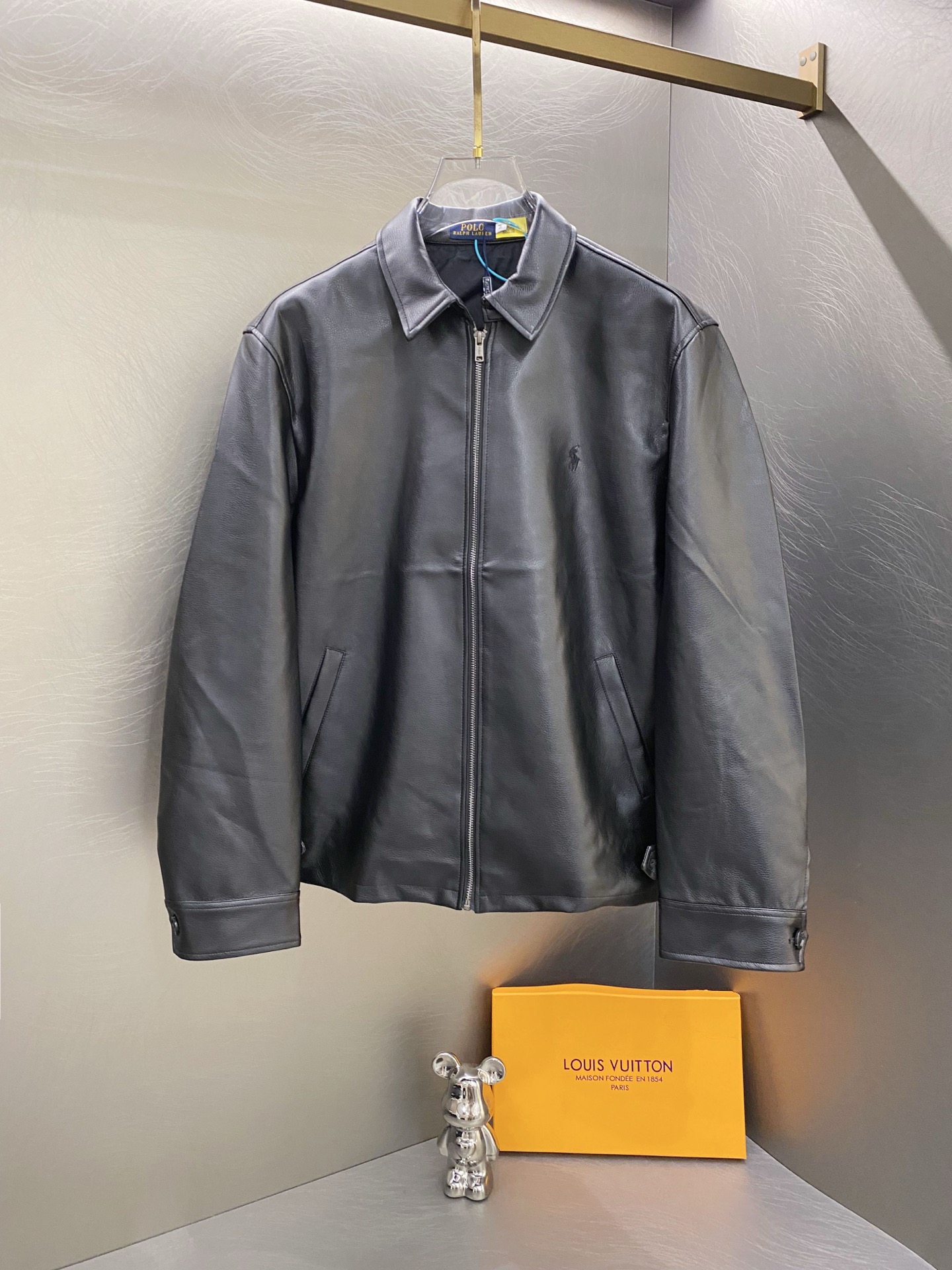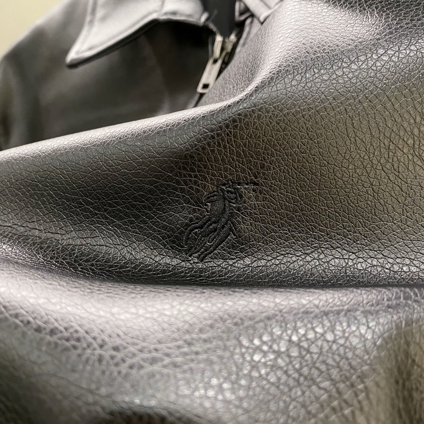 Polo Ralph Lauren men's black zip-up leather jacket. Slim fit, faux lychee grain leather, custom zipper, equestrian embroidery. Sizes S-XL.