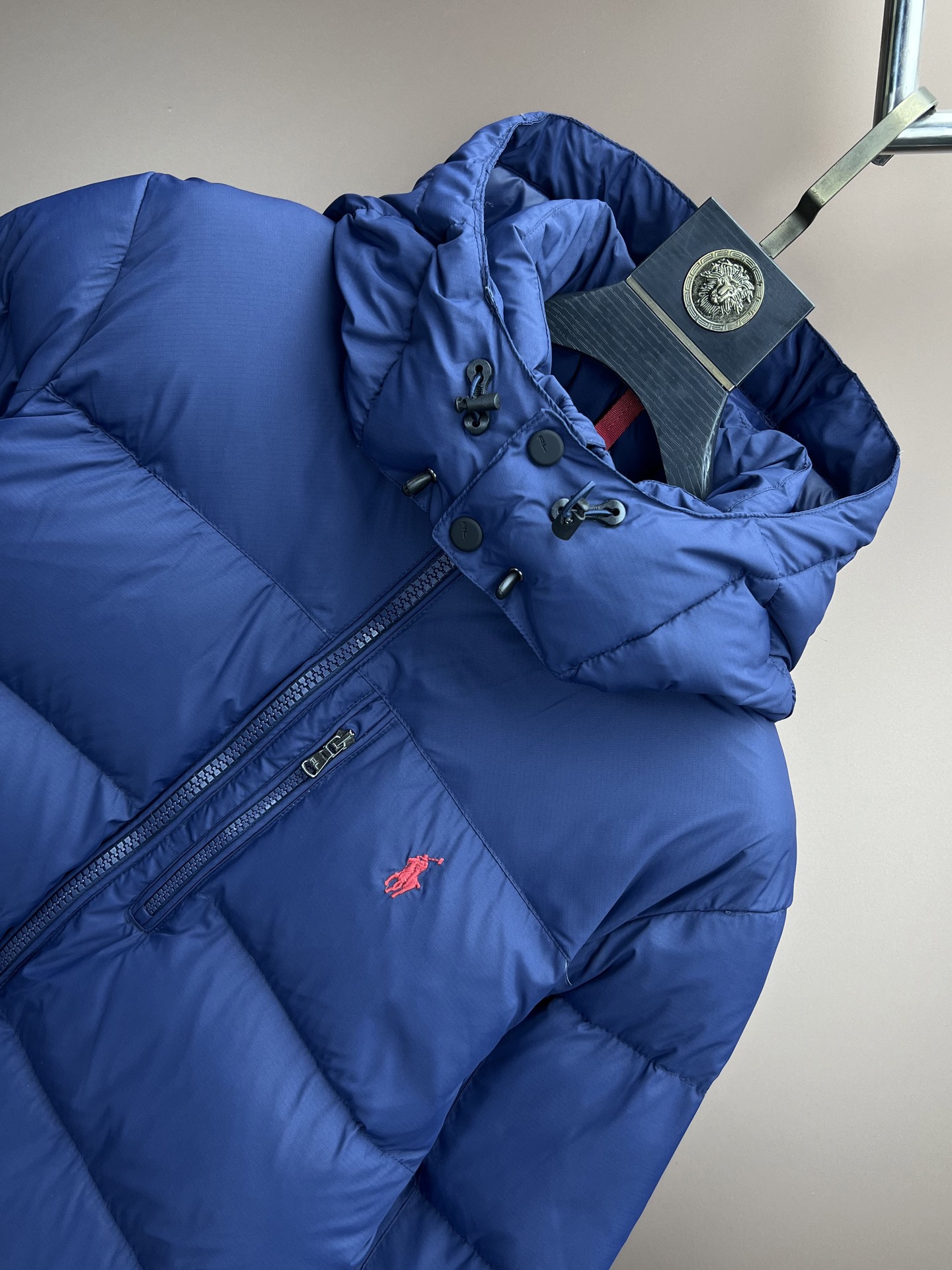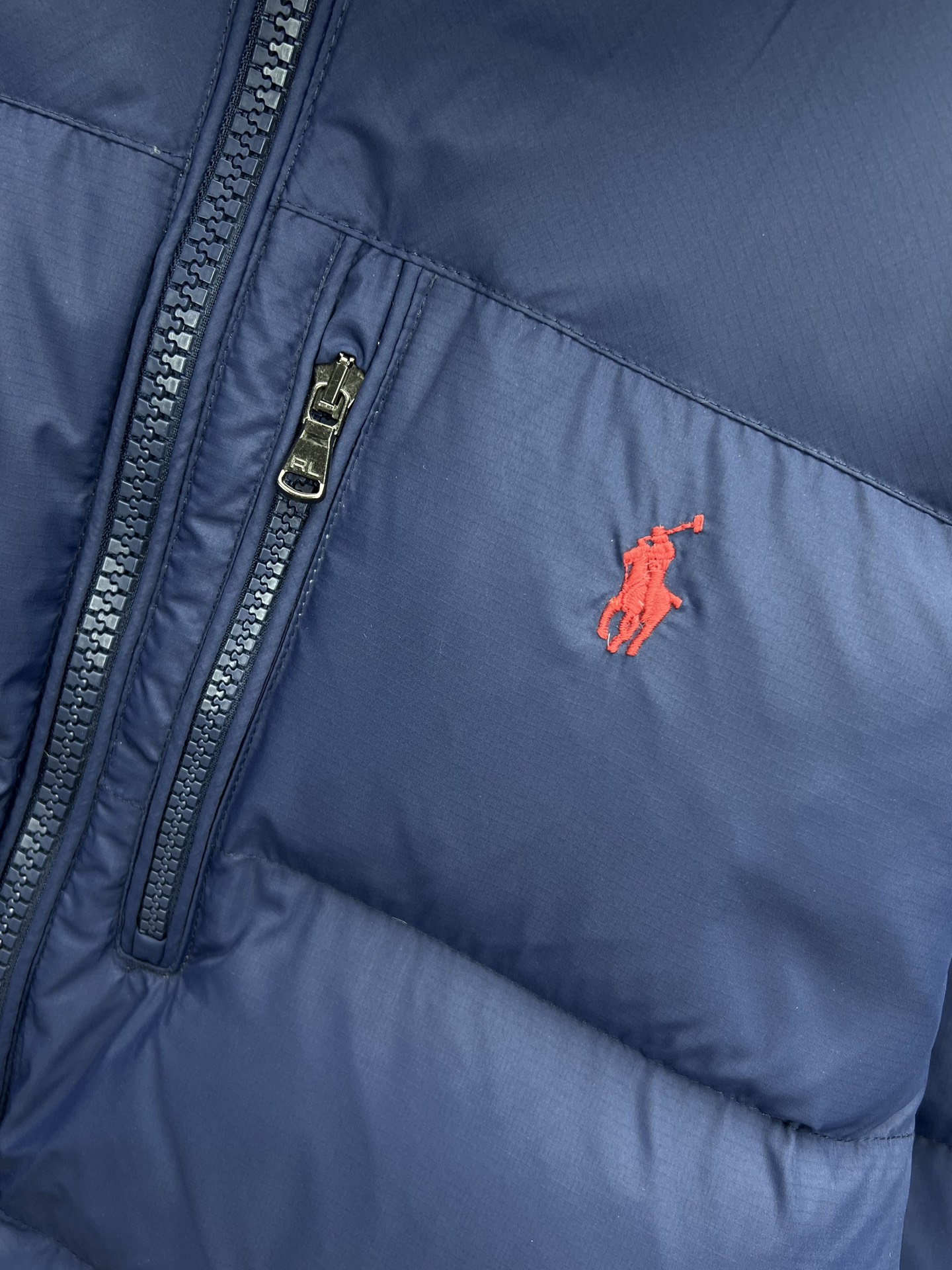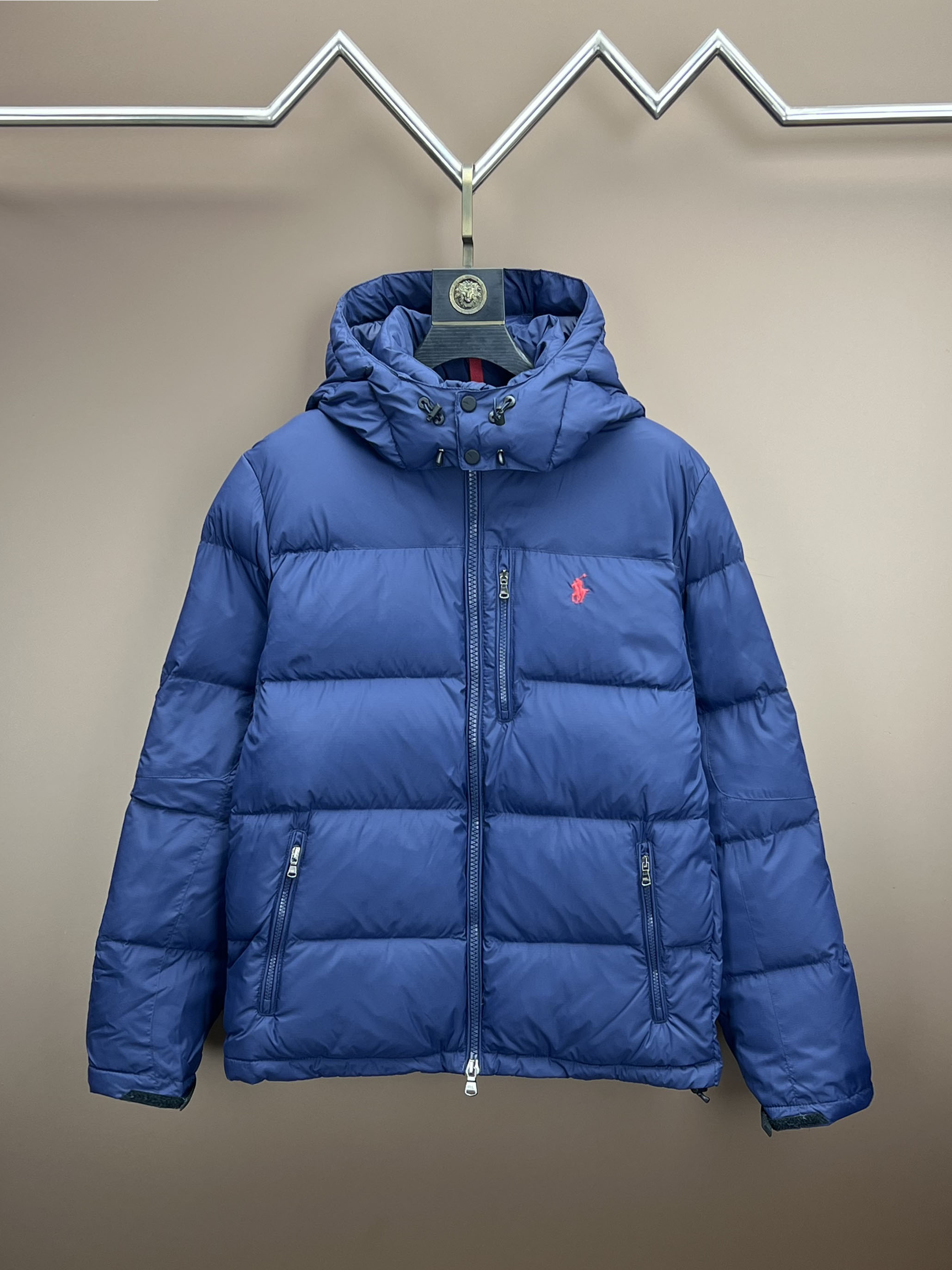 Ralph Lauren classic down jacket. 80% white duck down. Custom hardware, waterproof/anti-static fabric. Three-layer lining prevents down leakage. Colors: blue, black. Sizes: S, M, L, XL.