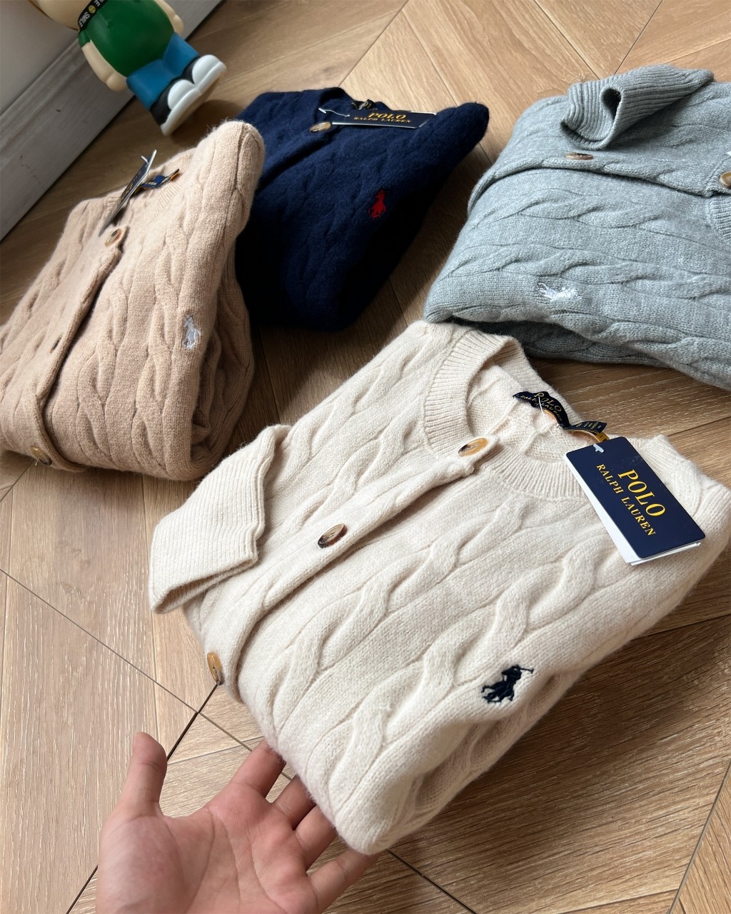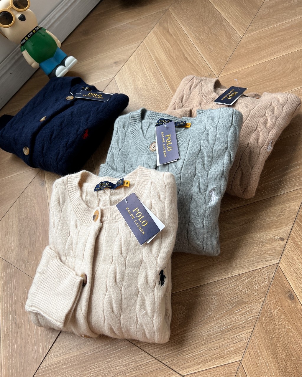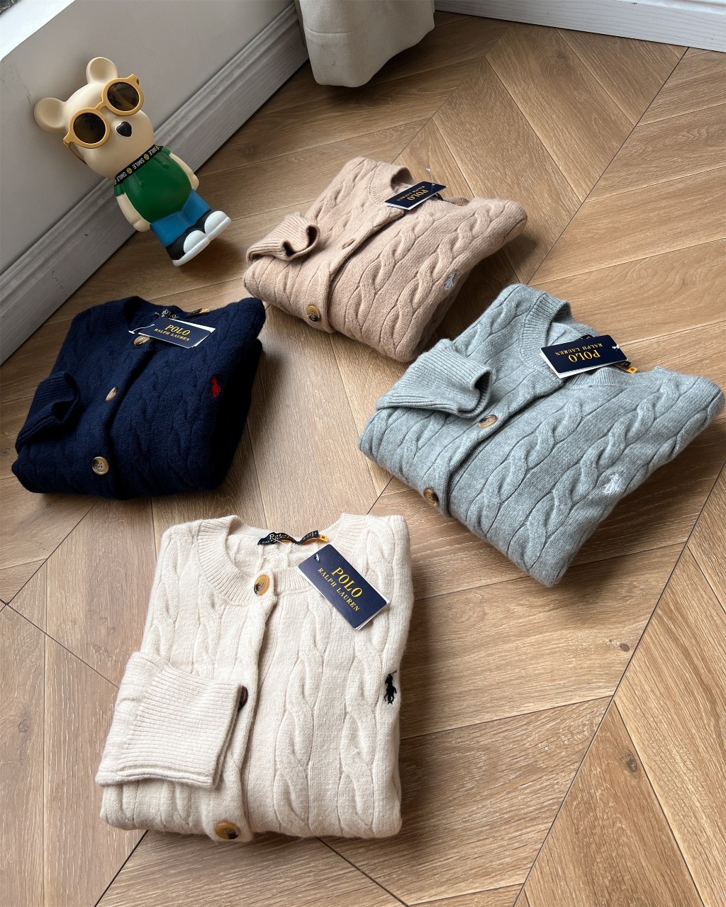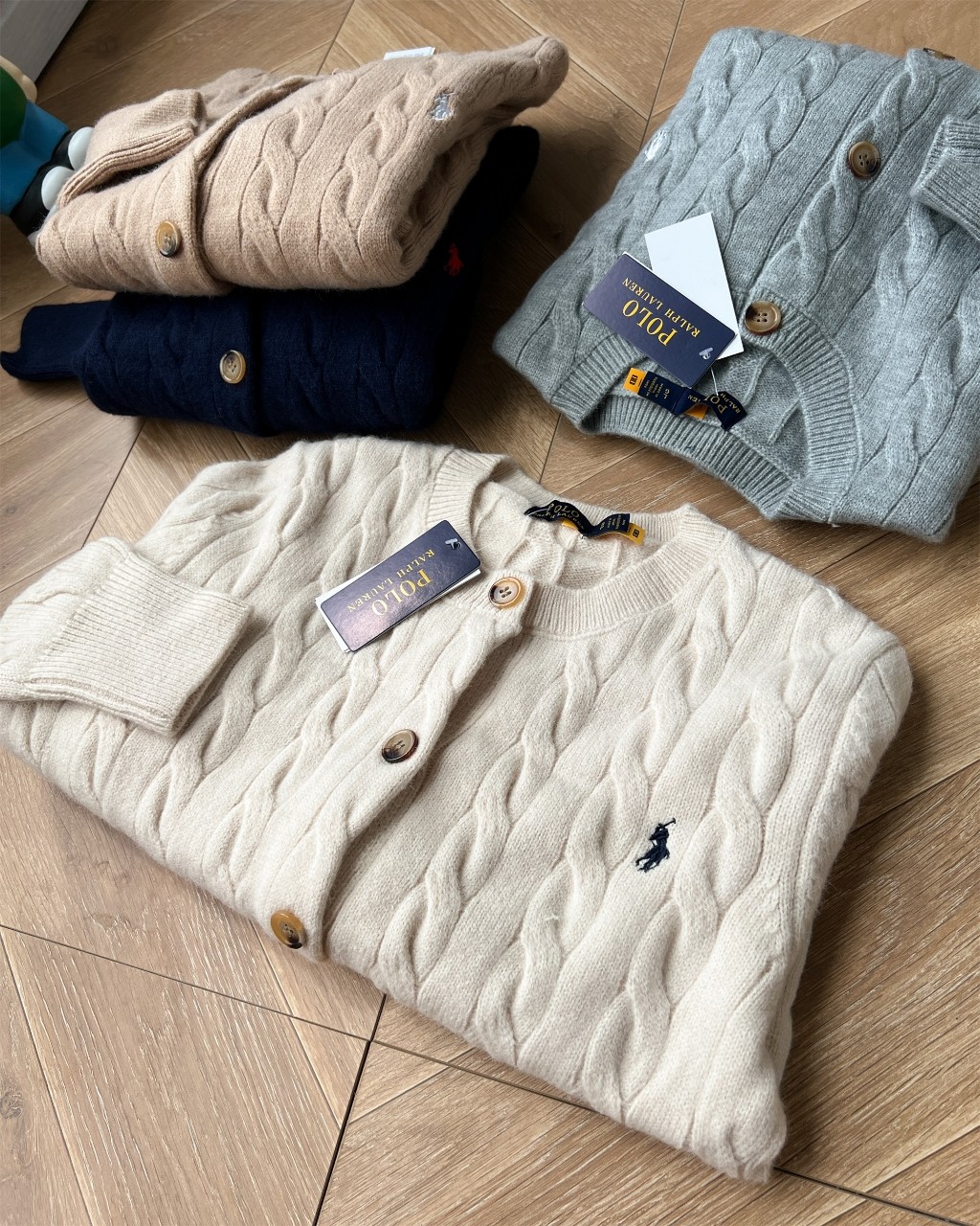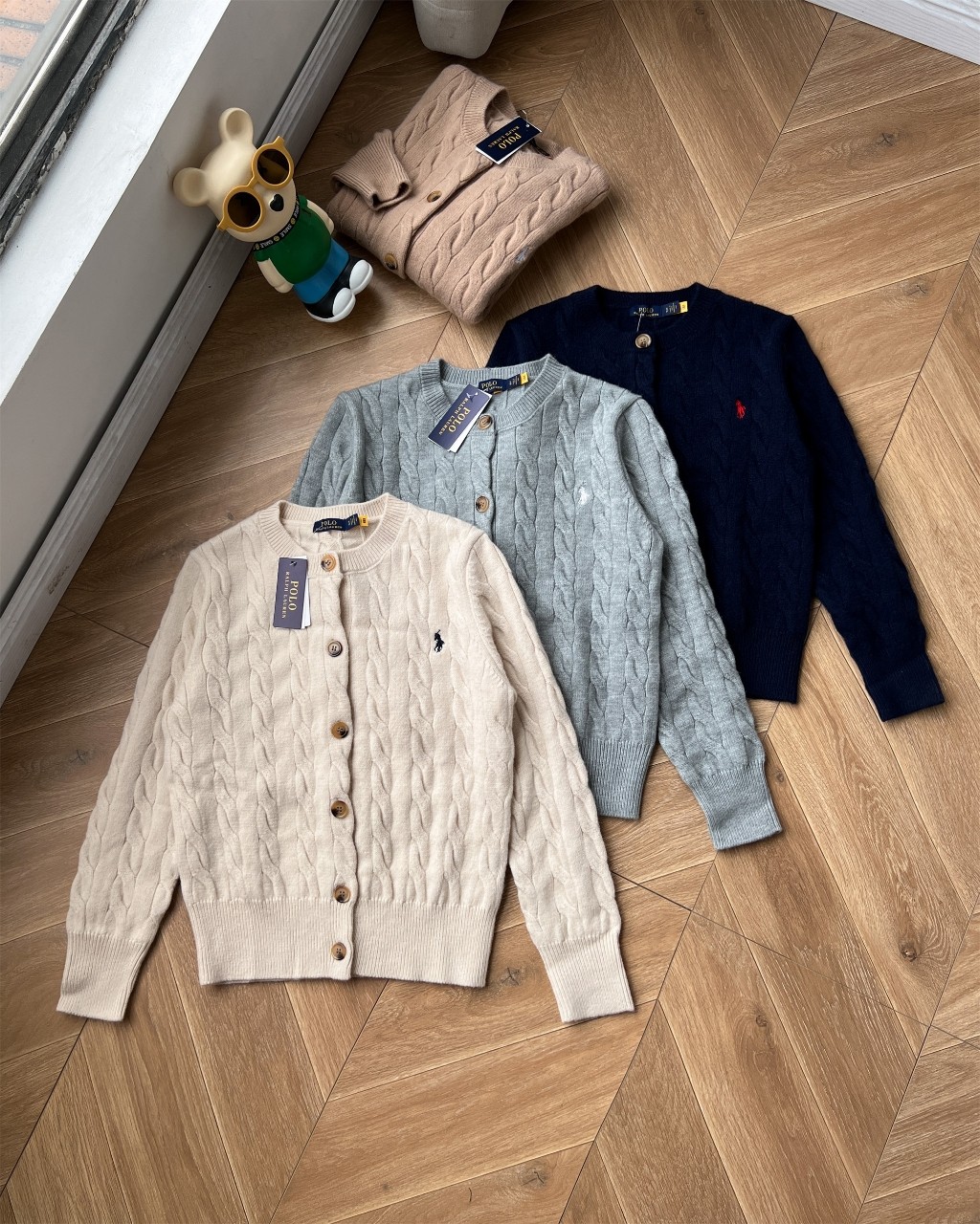 Ralph Lauren women's classic cable knit cardigan with embroidered pony logo. Soft, comfortable cotton-wool blend. Available in gray, beige, navy, khaki. Sizes S, M, L.