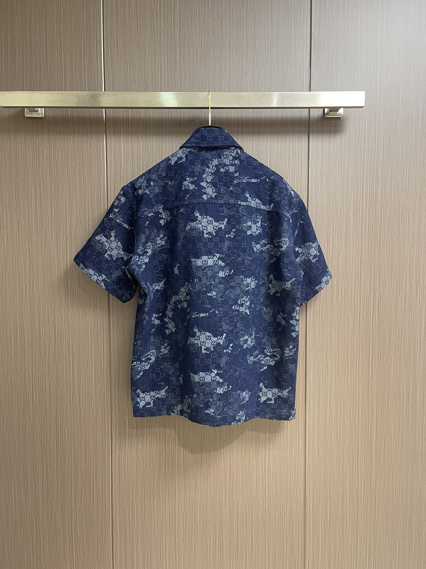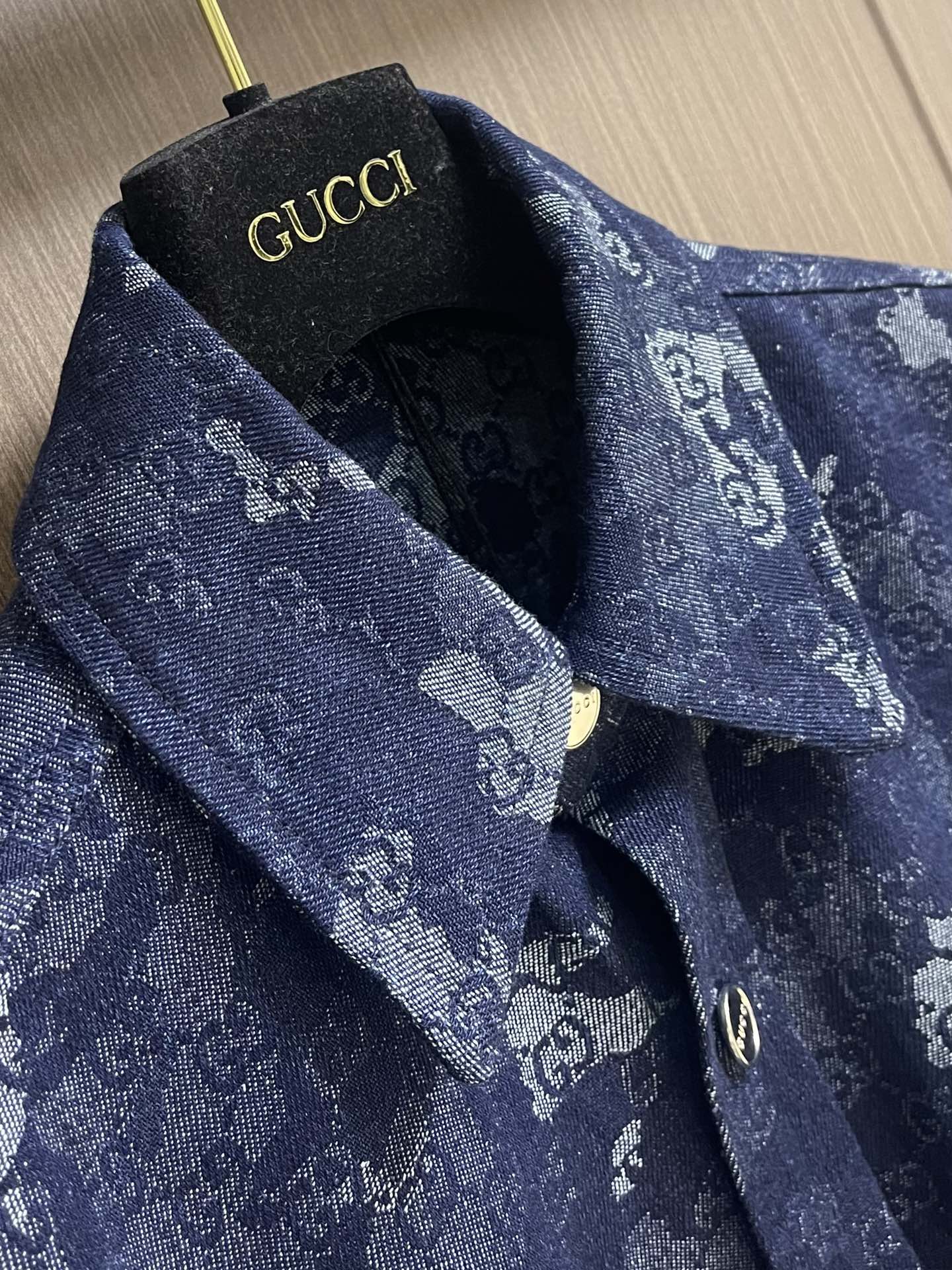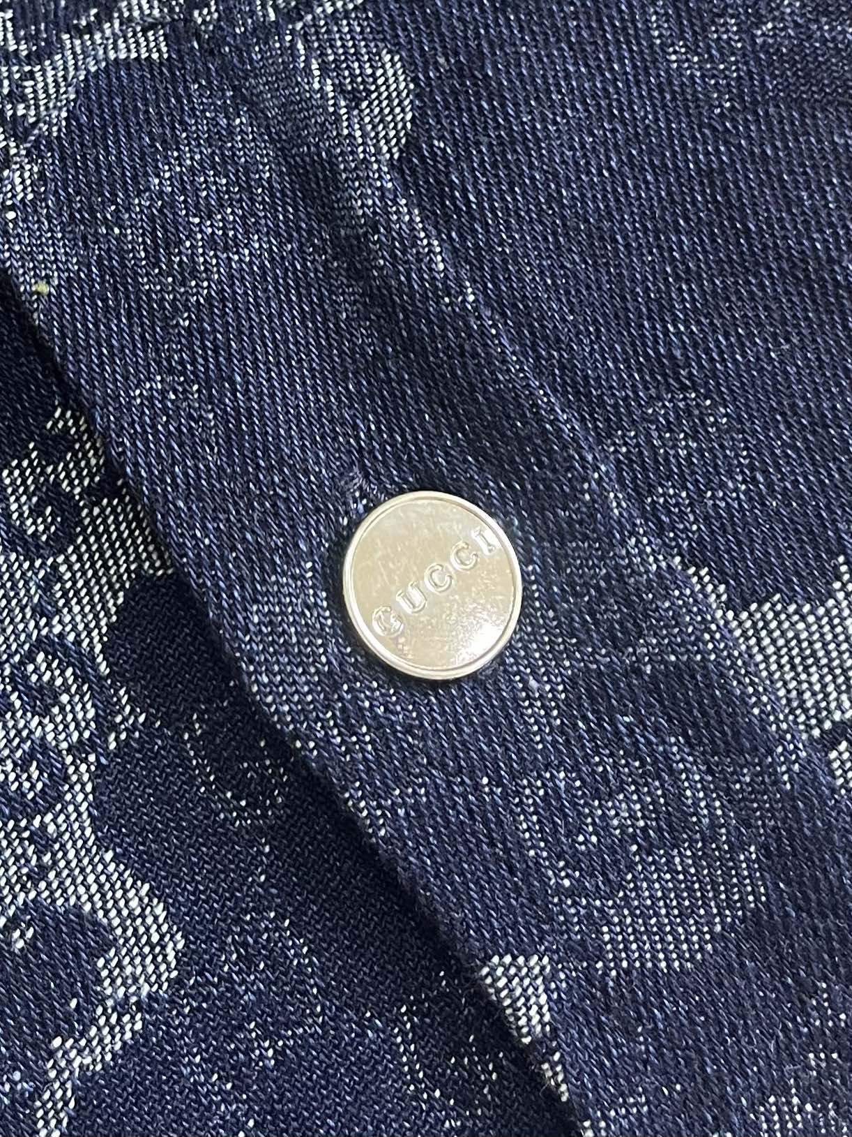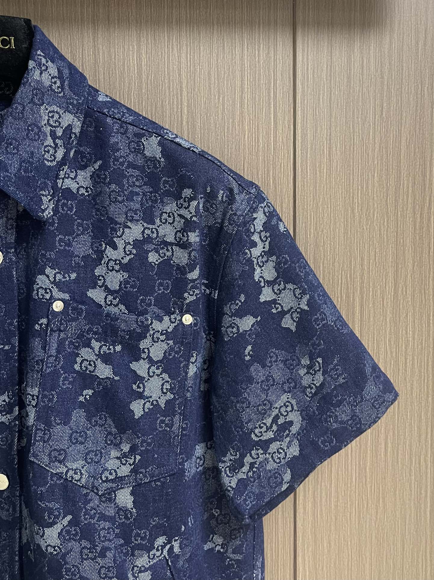 GUCCI jacquard denim short sleeve shirt and shorts set. 2025 early fall collection blends denim with elegant details. Features dark blue and ivory GG marble jacquard with metal buttons. Sizes: S-XL.