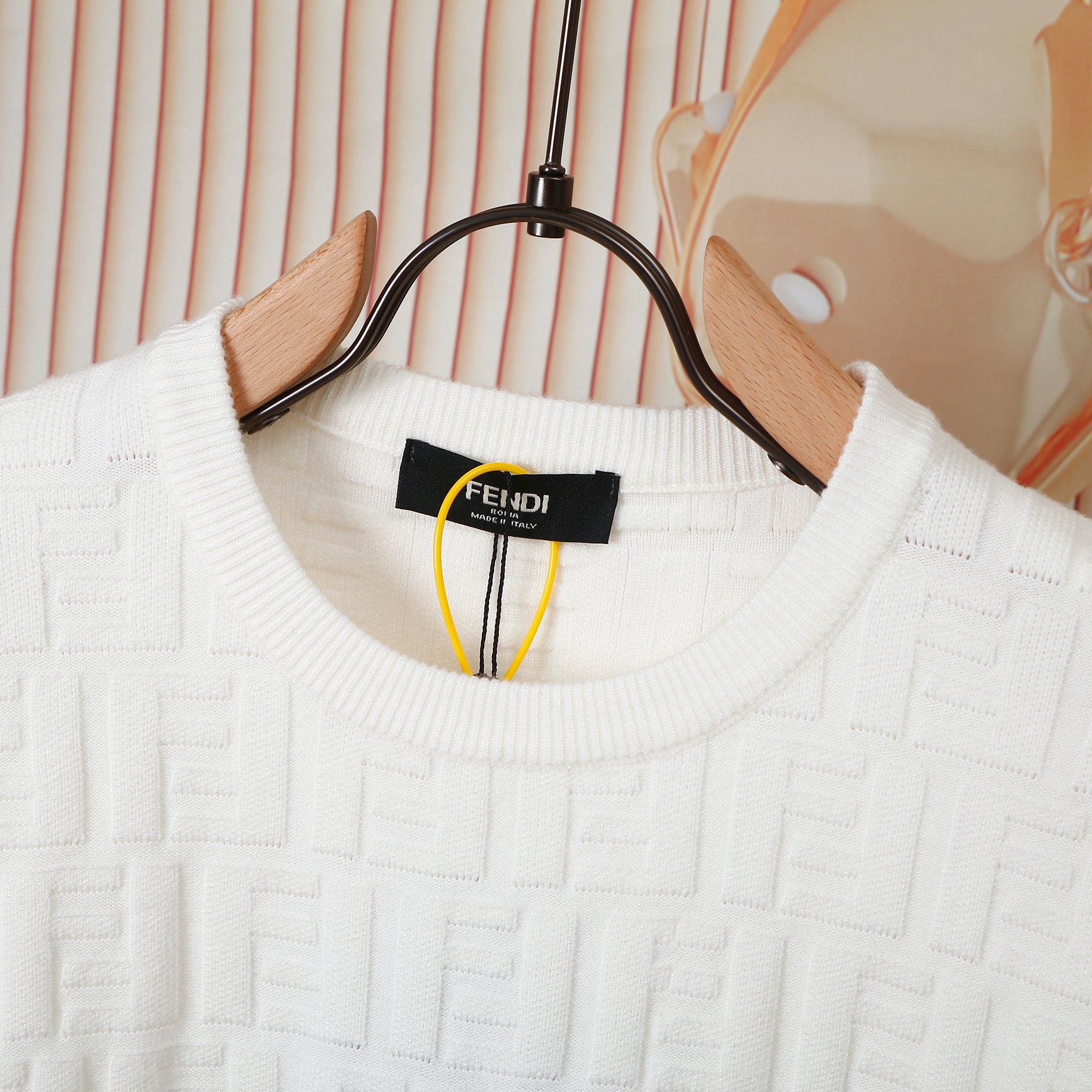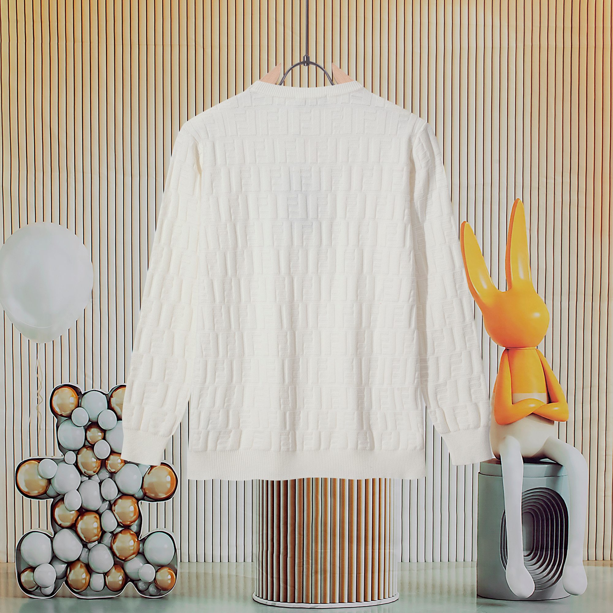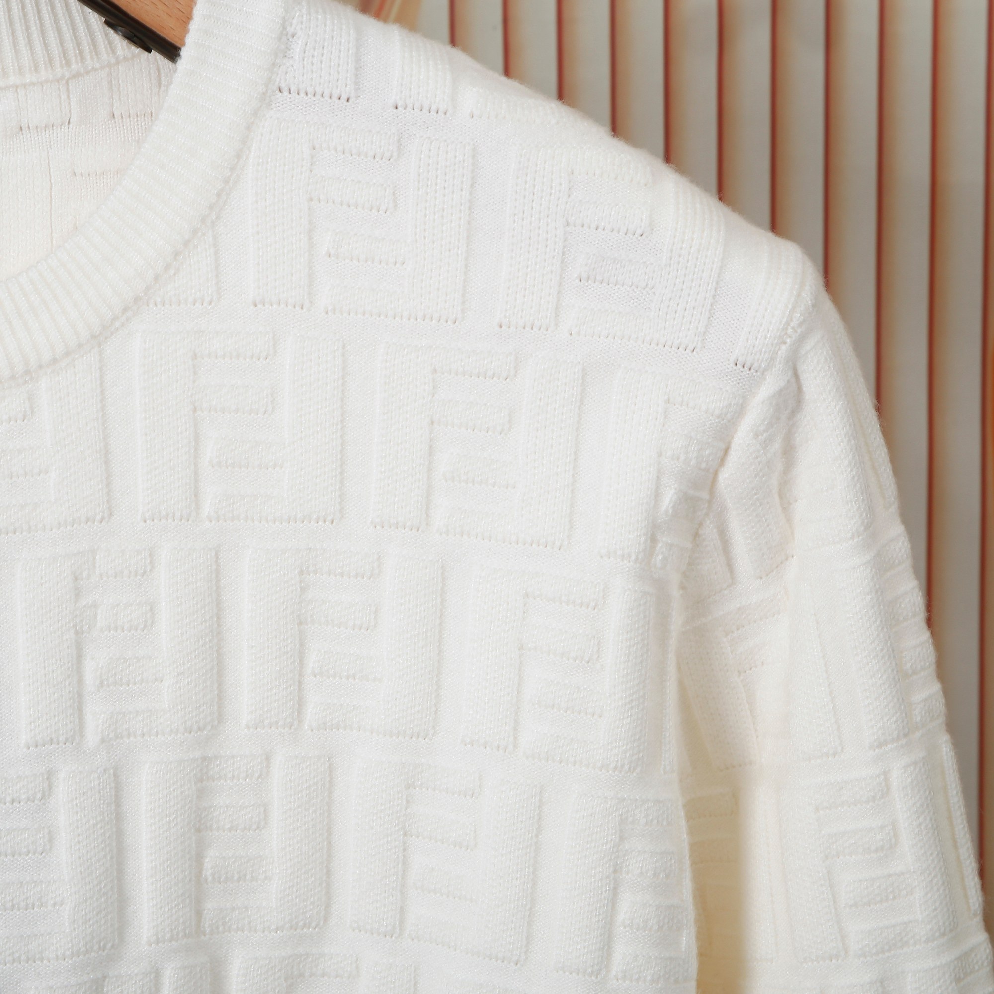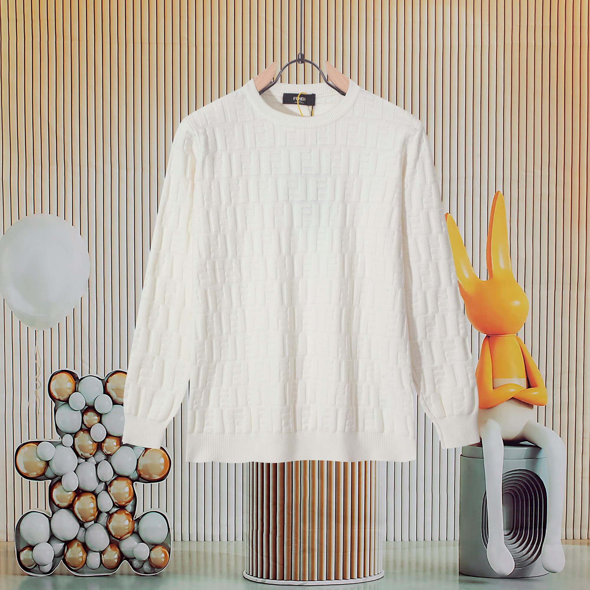 New hit FENDI knit sweater, exclusive new design with unique double F jacquard logo, distinct raised pattern. Really great. Easy to pair with anything, highly fashionable. Workmanship and details are 1:1 synchronized with the official website. Absolutely pilling-free, non-irritating, super comfortable to touch. The fit is especially comfortable, appearance is very stylish, color matching is beautiful, craftsmanship is extremely detailed. Highly recommended. Quality can be compared to the market, not afraid of comparison.