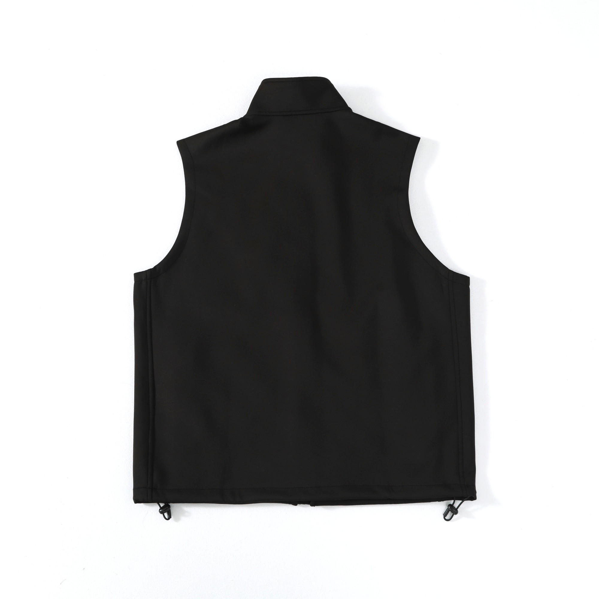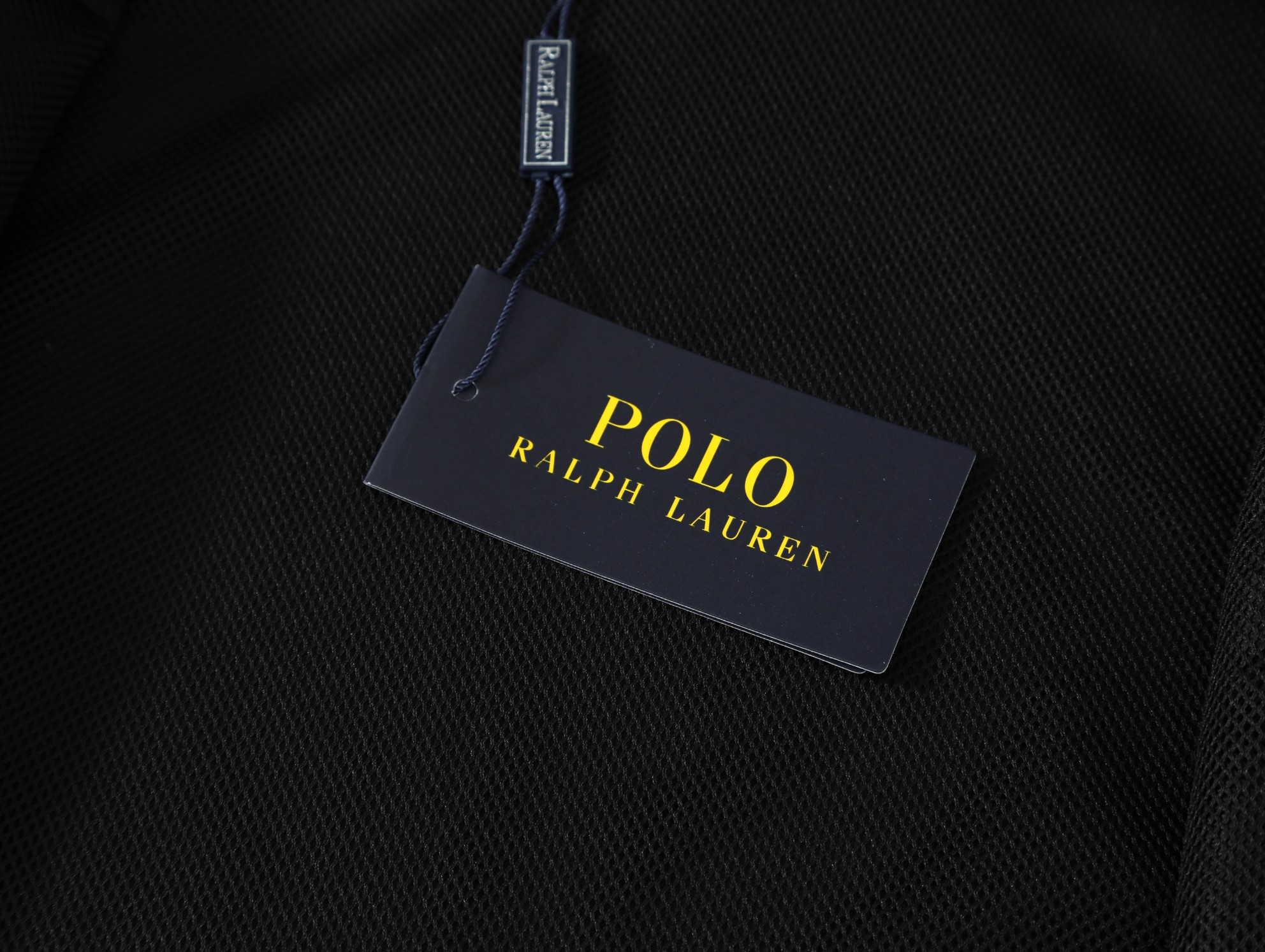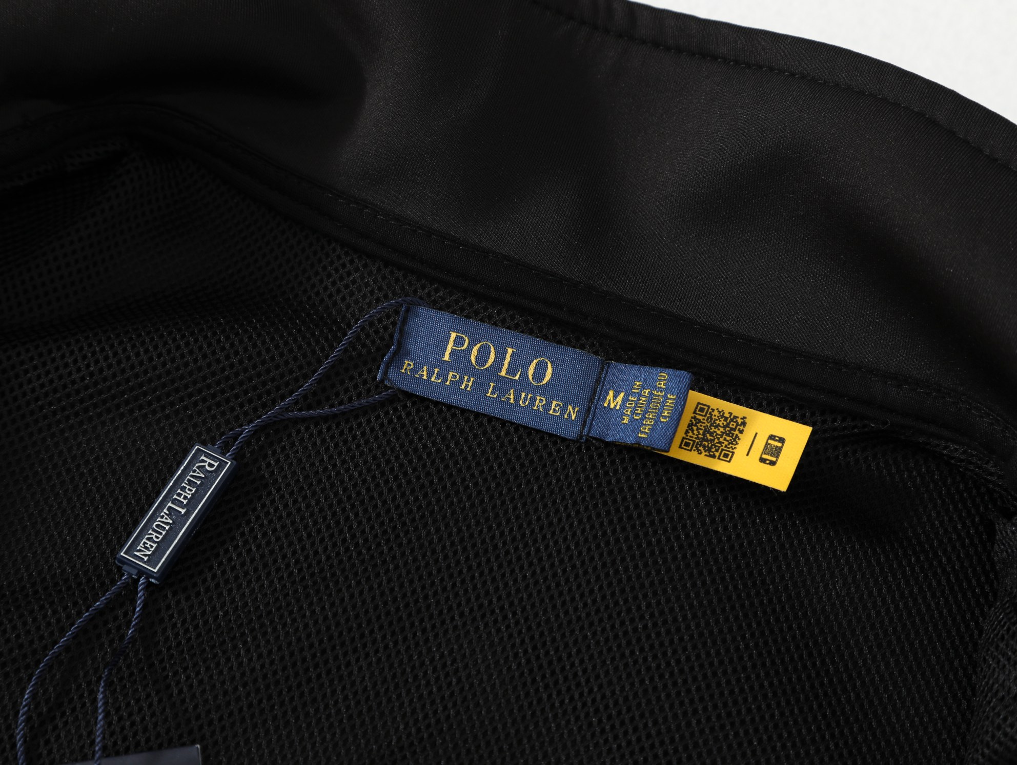 Ralph Lauren SS24 logo embroidered high-neck zip vest. Black. Sizes S-XL. Chest embroidery, unisex Harrington style, custom zipper.