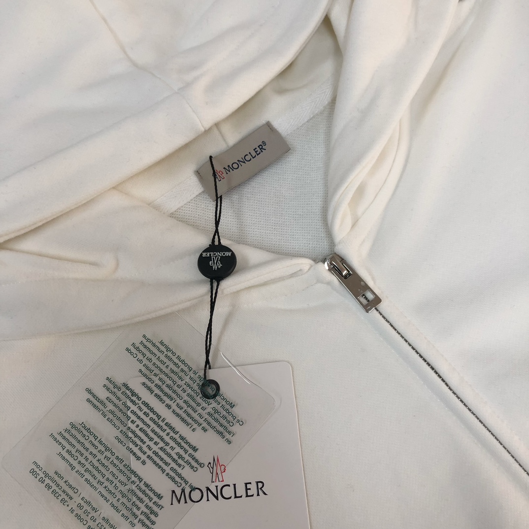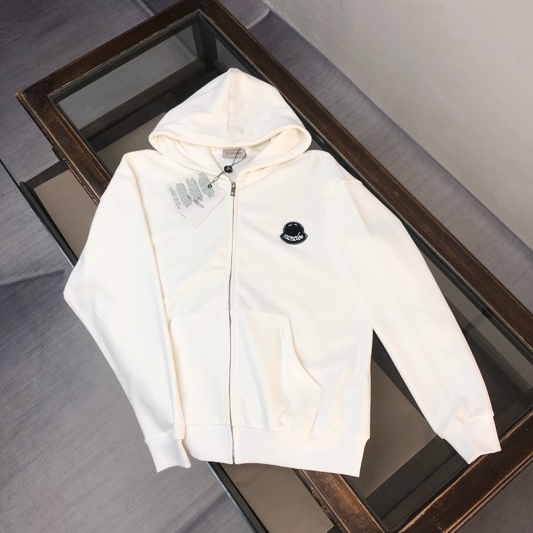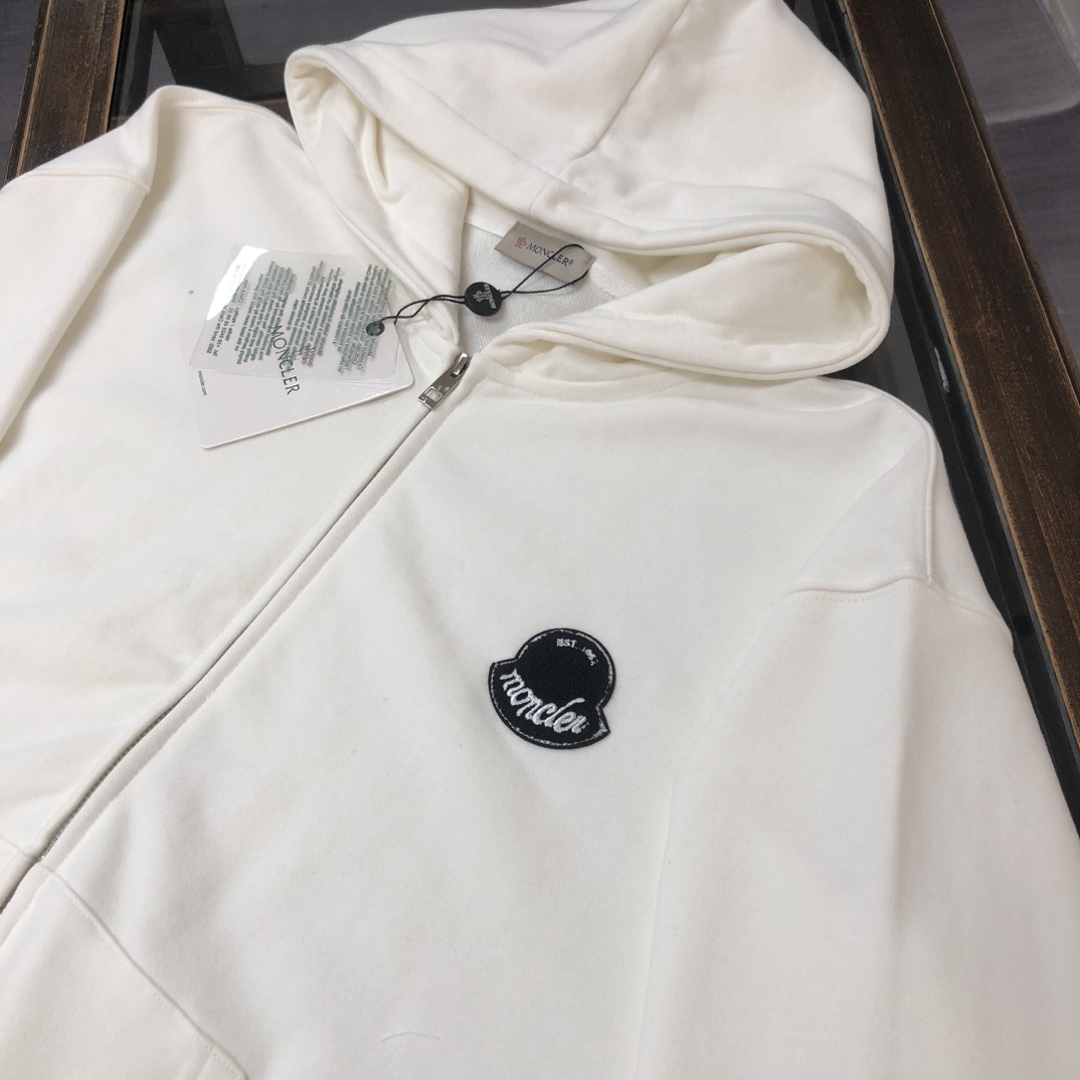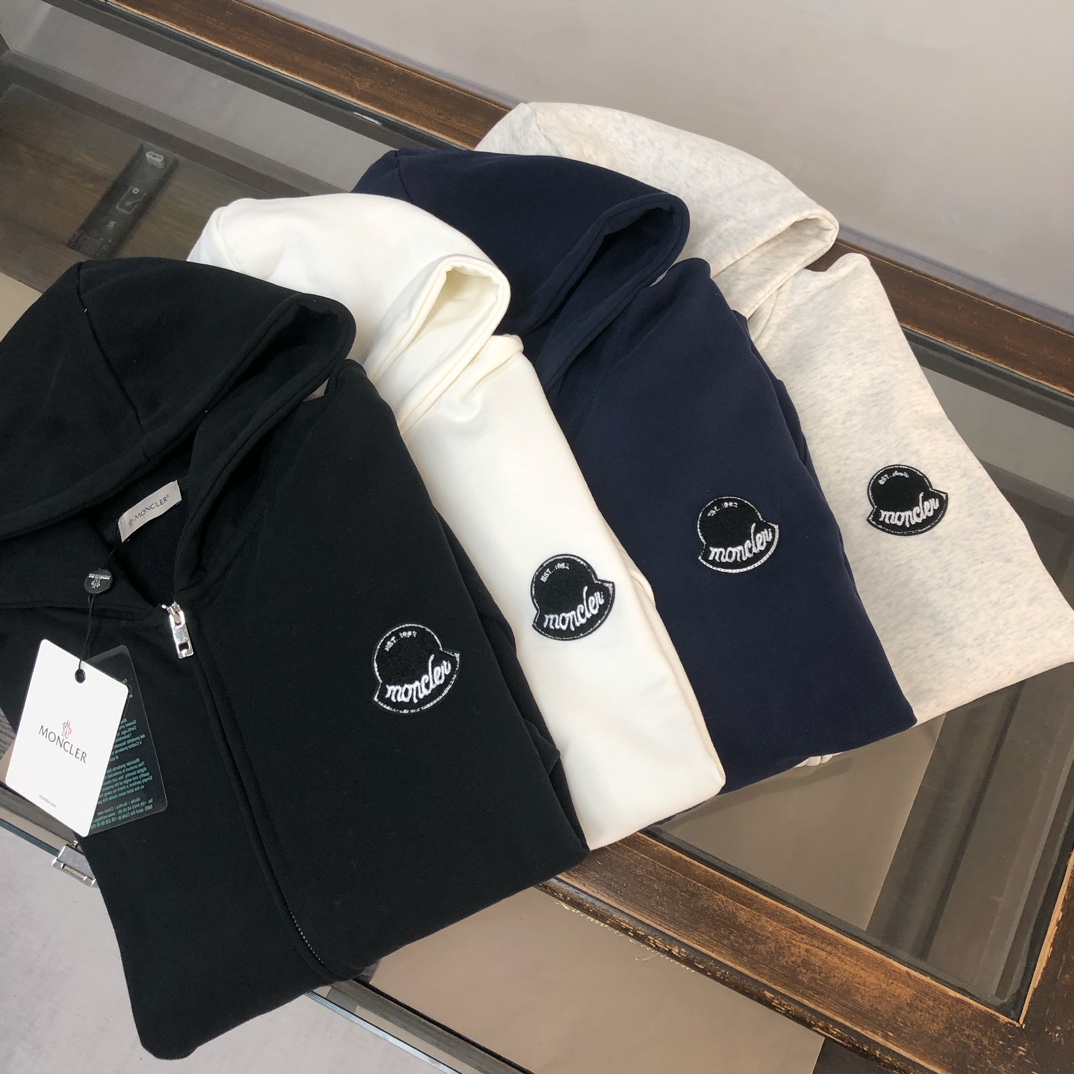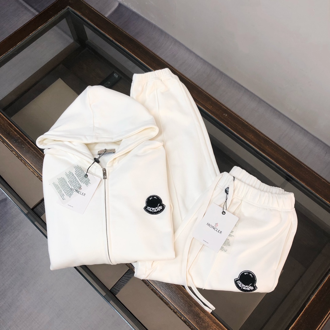 MONCLER 2025 early autumn hoodie and pants set. Custom 420g cotton, breathable, logo detail. Colors: Black, White, Navy, Gray. Sizes: S-XXL.