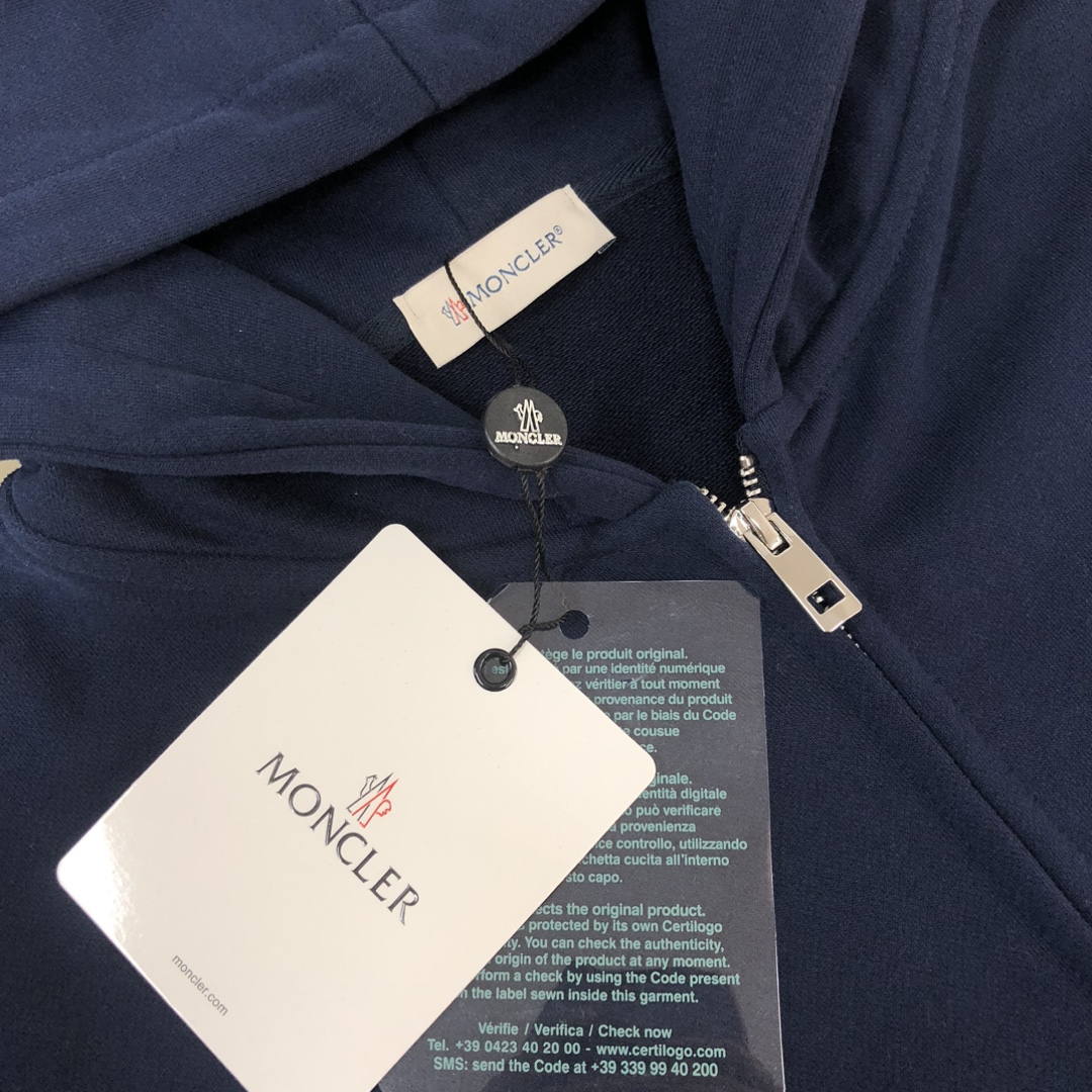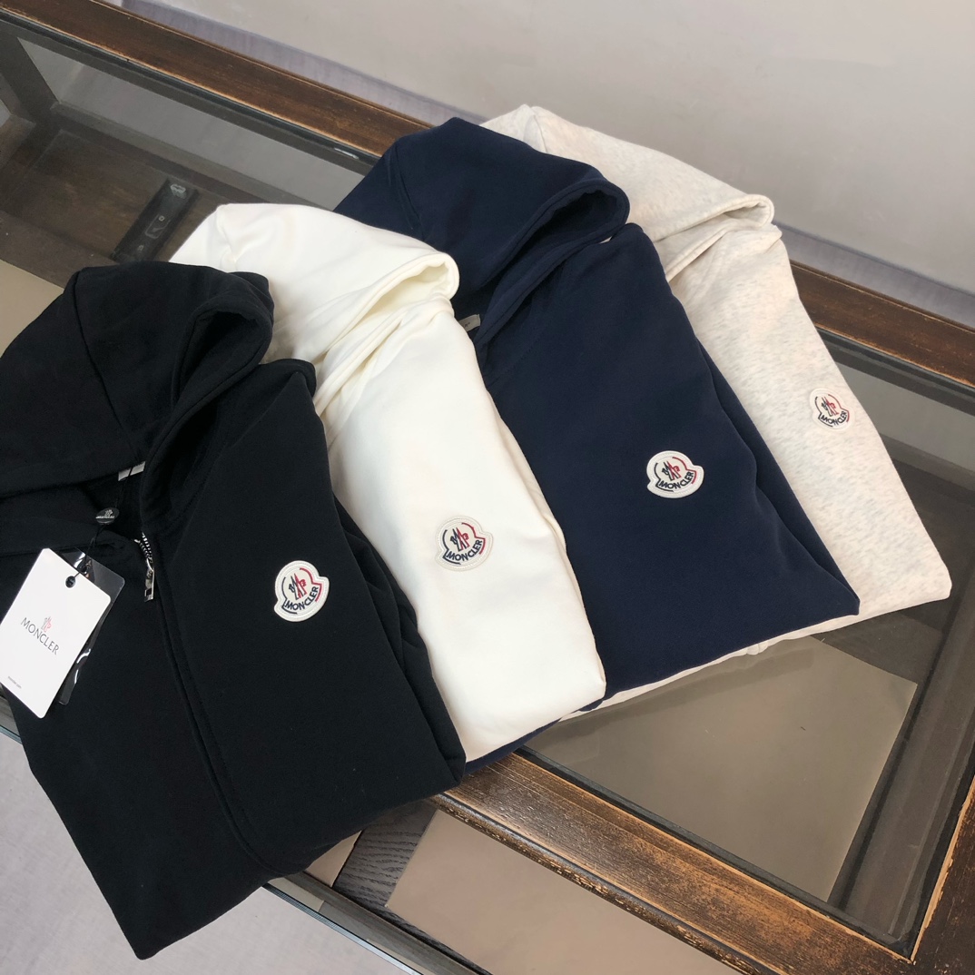 Moncler 2025 early autumn new couple's hooded zip-up sweatshirt and straight-leg sweatpants set. Custom 420g washed cotton, tailored fit, available in black, white, navy, gray. Sizes: S to XXL.