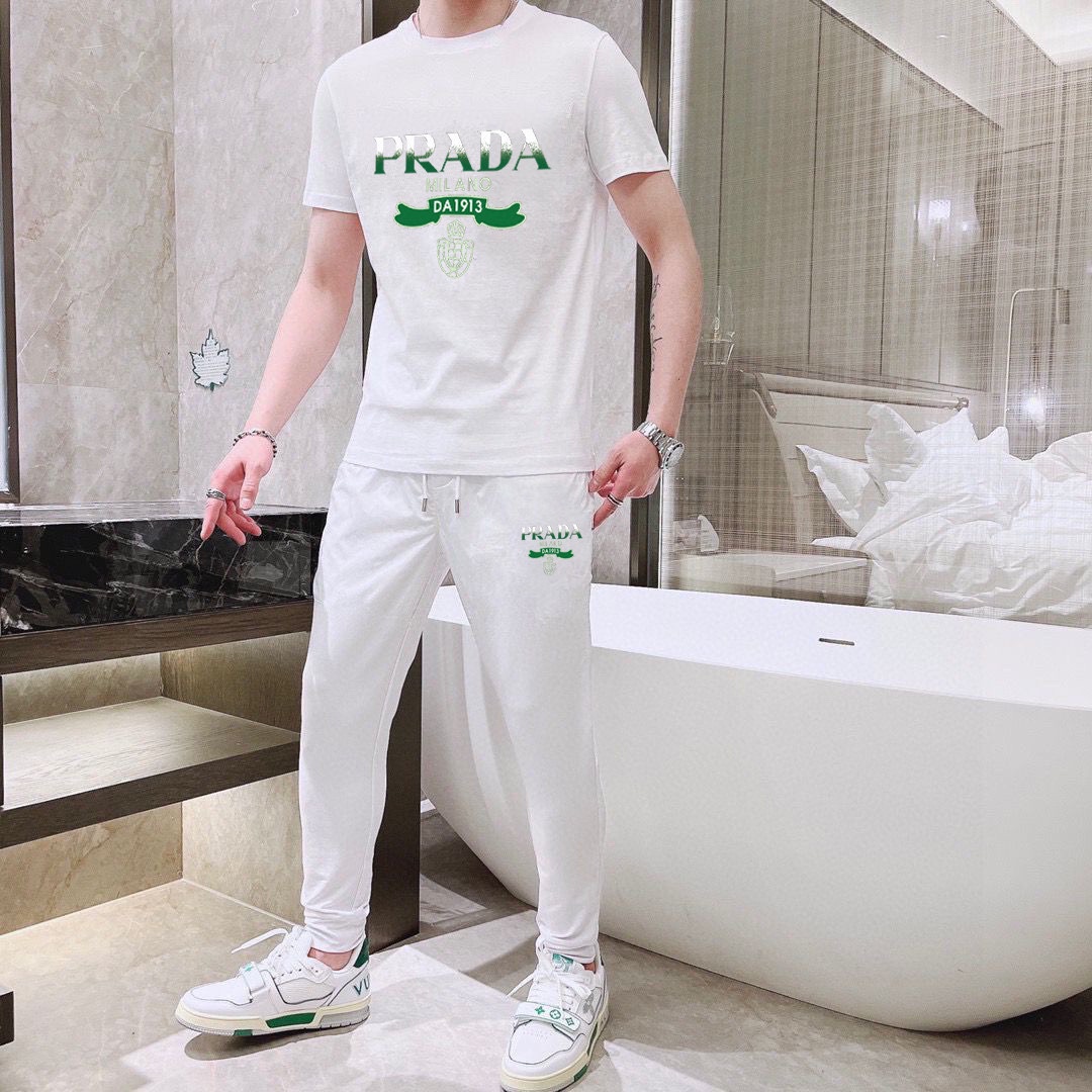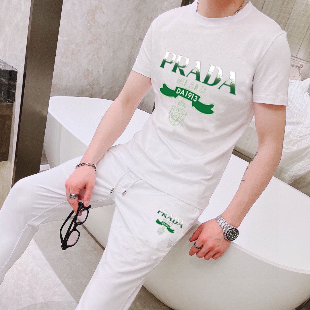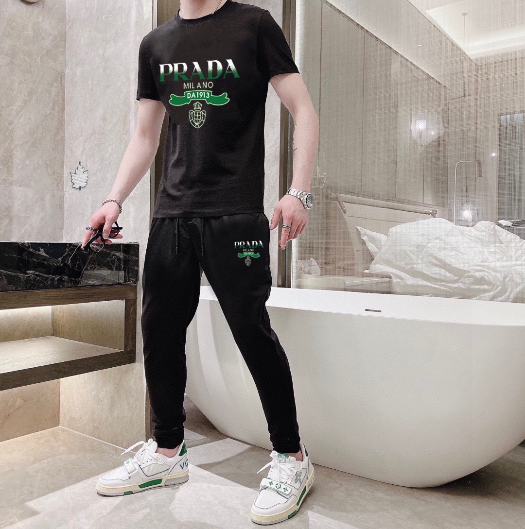 Prada men's summer dual-gloss luxury set. Imported fabric, trendy, versatile. Sizes M-5XL.