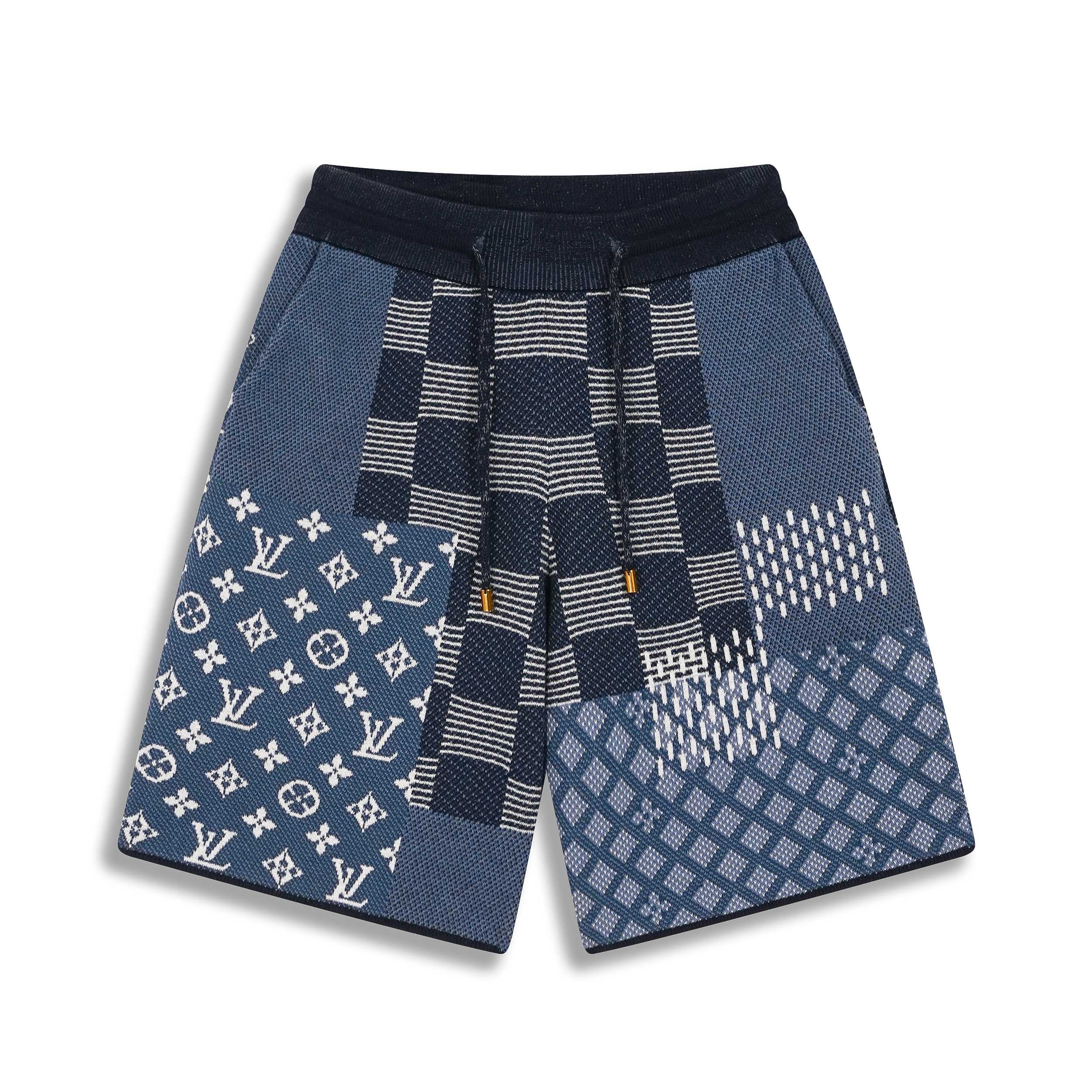 High-quality 2025 Fall/Winter LV Damier and Monogram patchwork knit shorts set, unisex, sizes XS S M L.