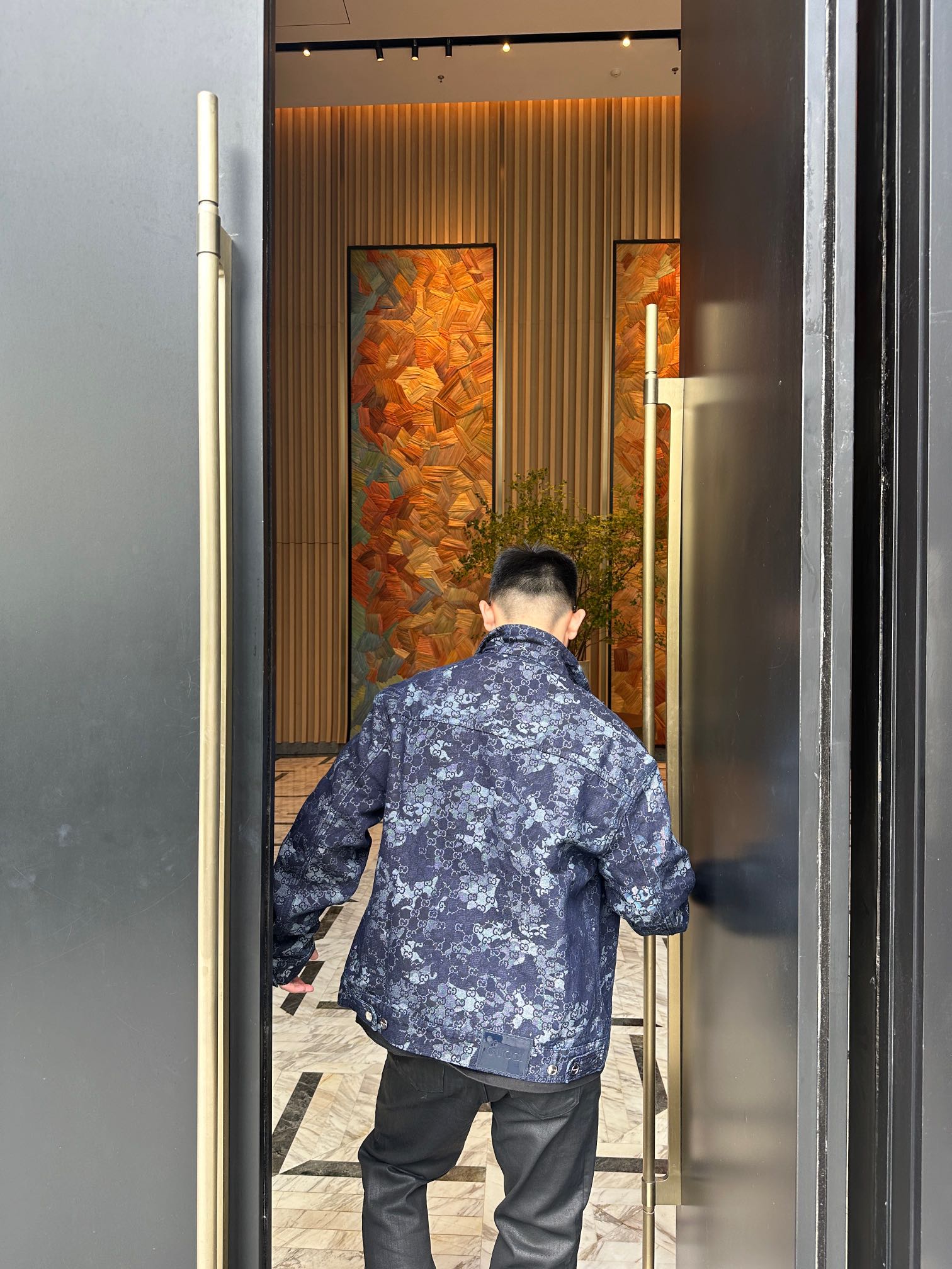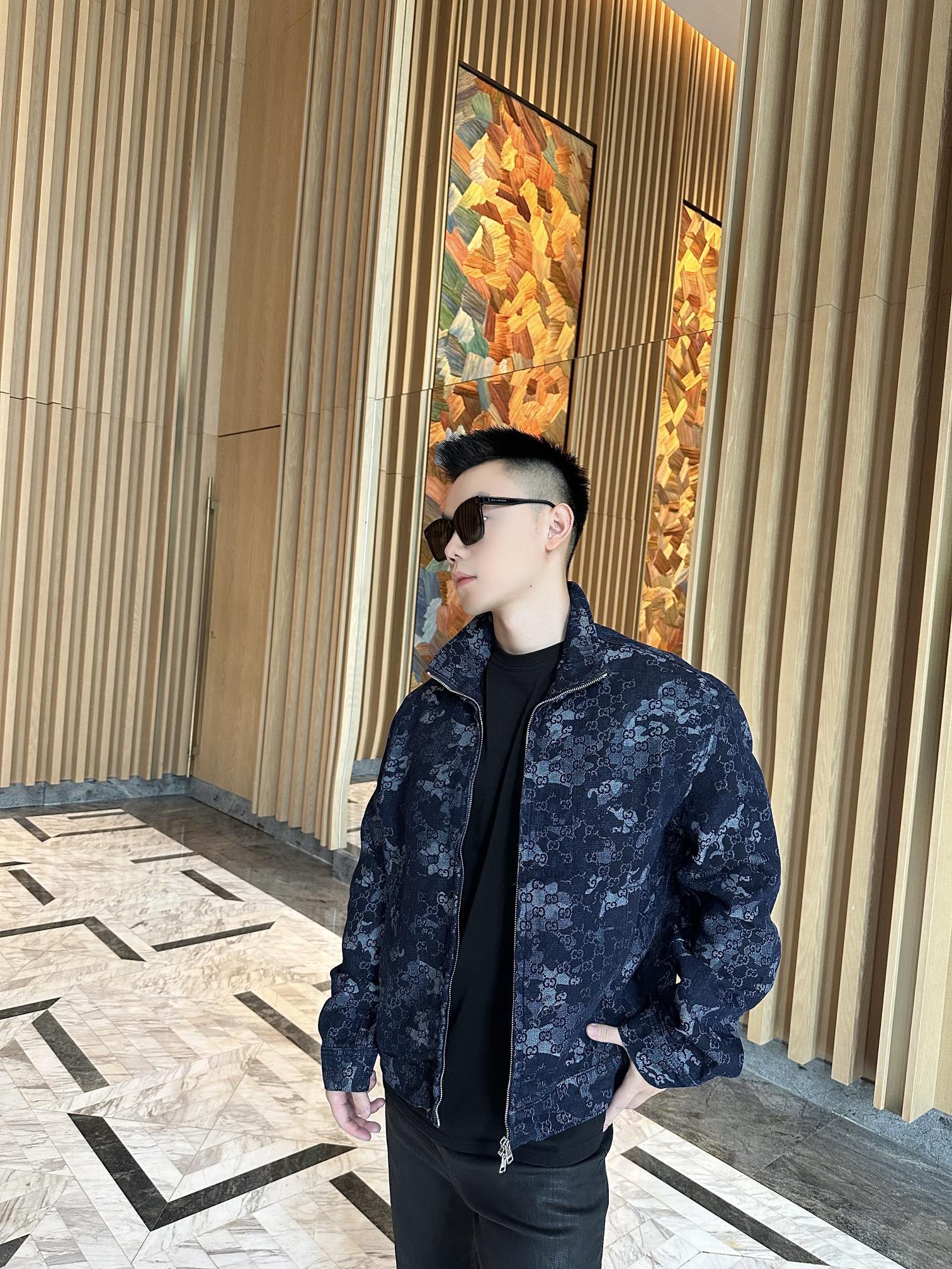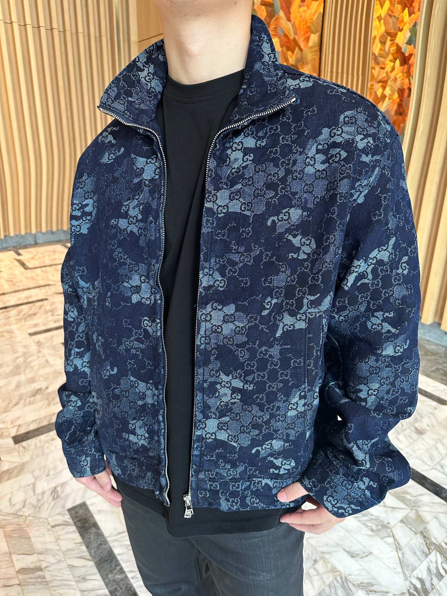 Gucci jacquard denim jacket with GG marble pattern, deep blue with ivory accents. Features custom zippers, leather labels, and relaxed fit. Sizes 44-50.