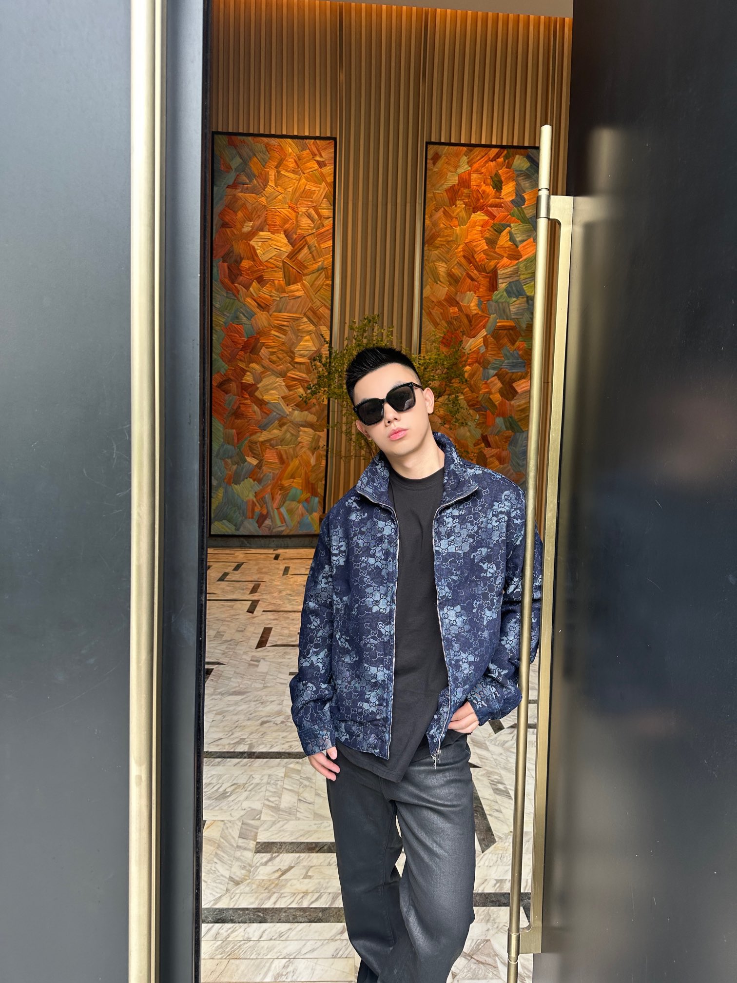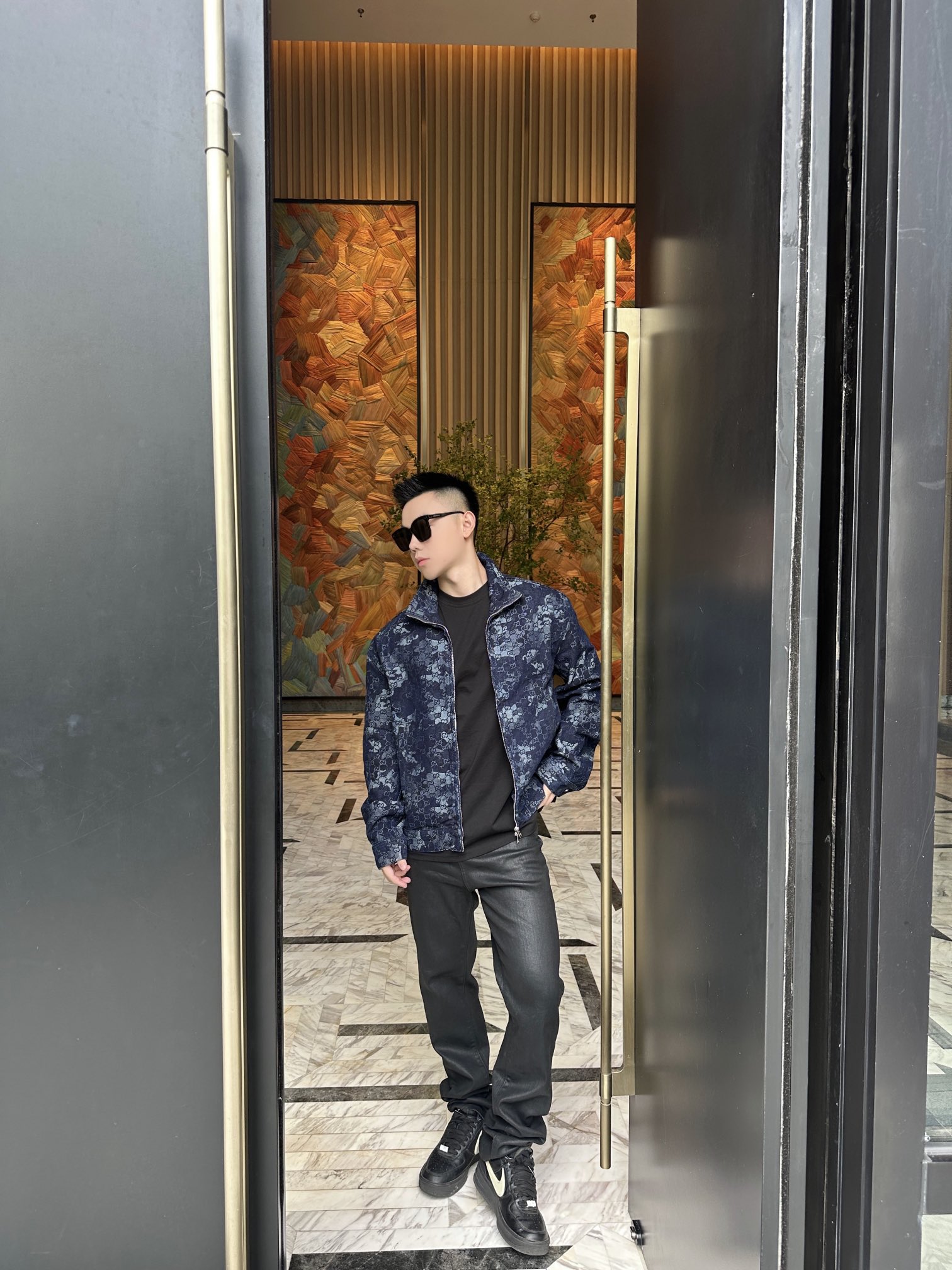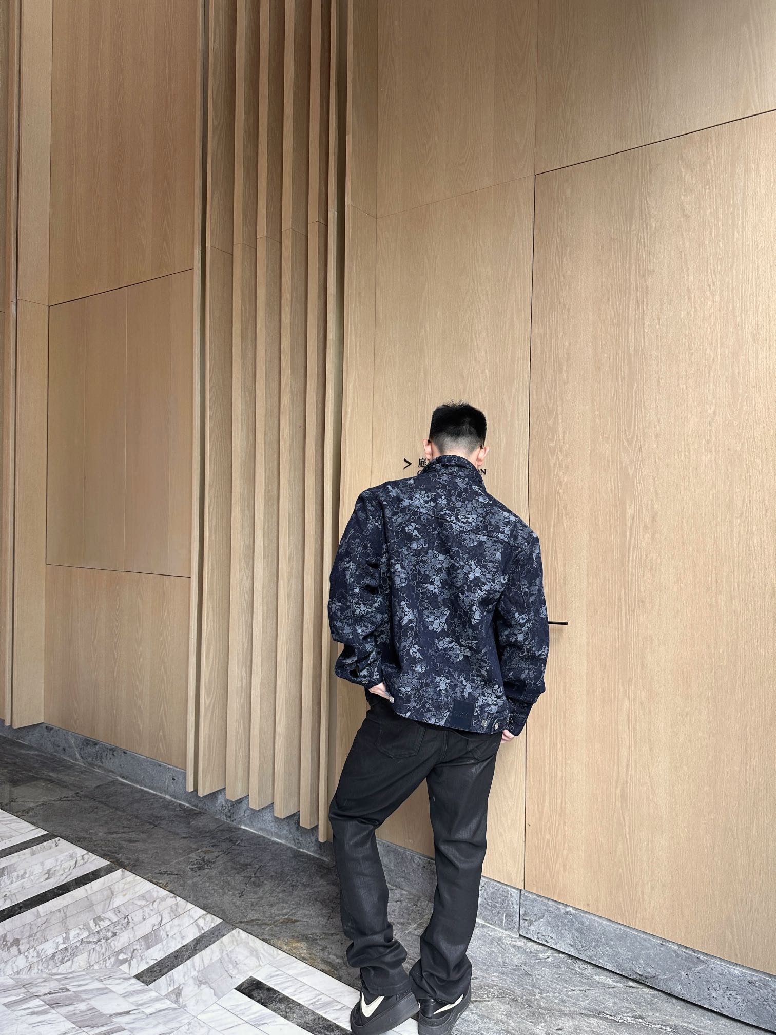 Gucci jacquard denim jacket with GG marble pattern, deep blue with ivory accents. Features custom zippers, leather labels, and relaxed fit. Sizes 44-50.
