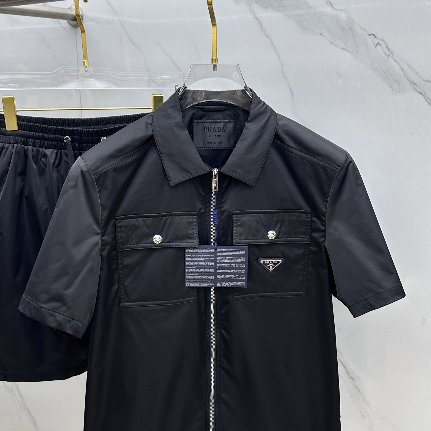 Prada men's logo re-nylon Bermuda shorts set. Custom high-density nylon, lightweight, soft, smooth. Elastic drawstring, mesh lining, meticulous craftsmanship. Full labels. Sizes M-3XL.