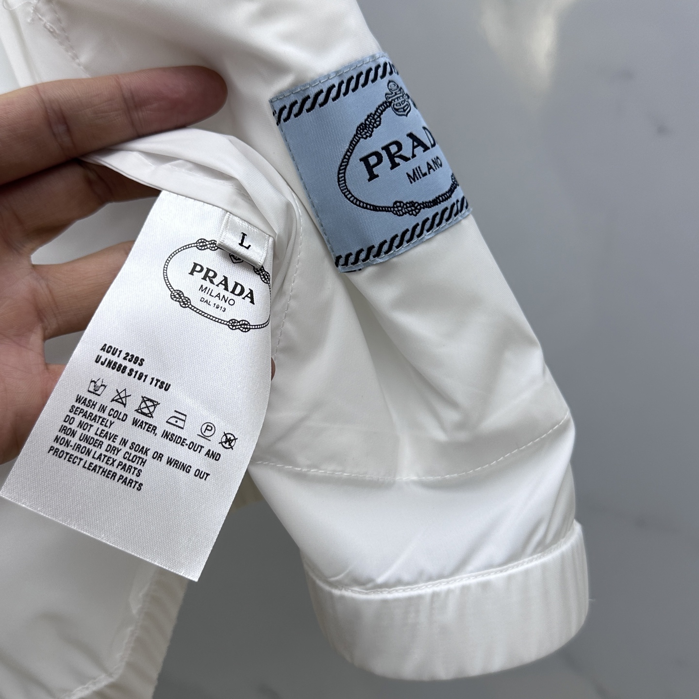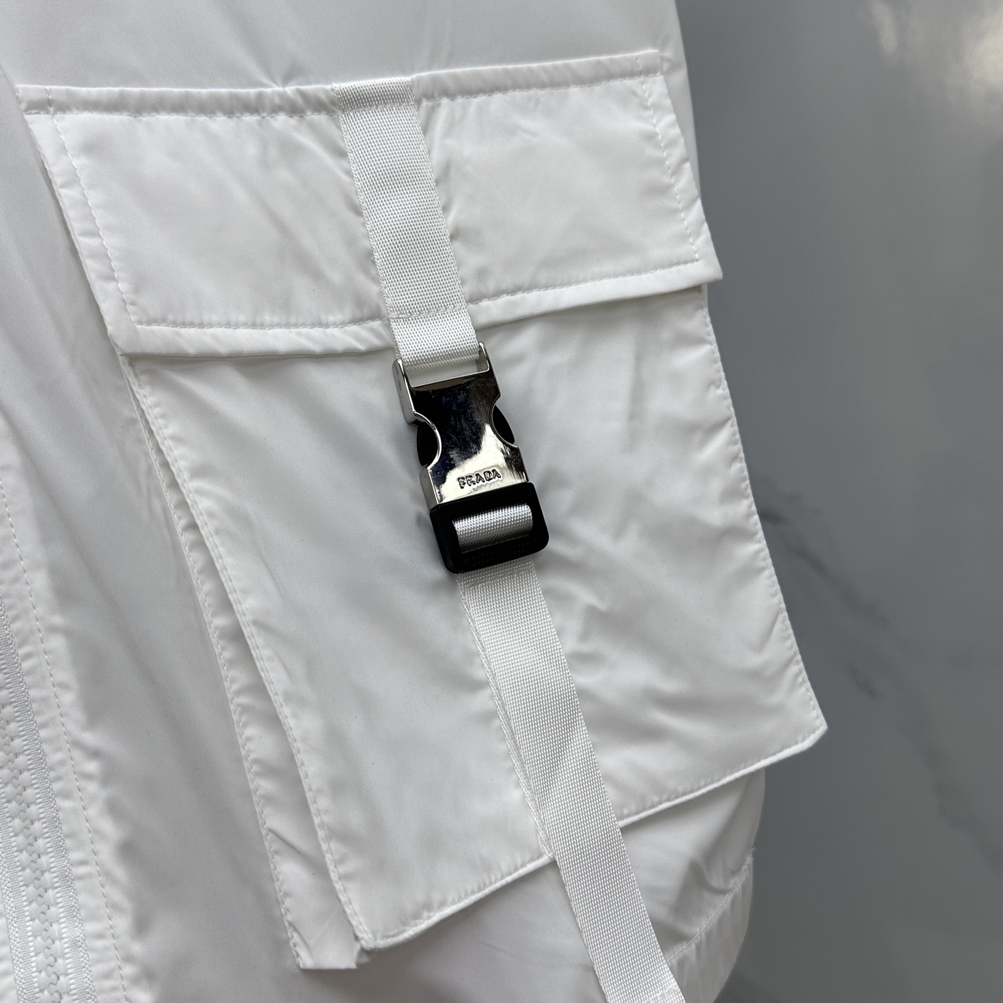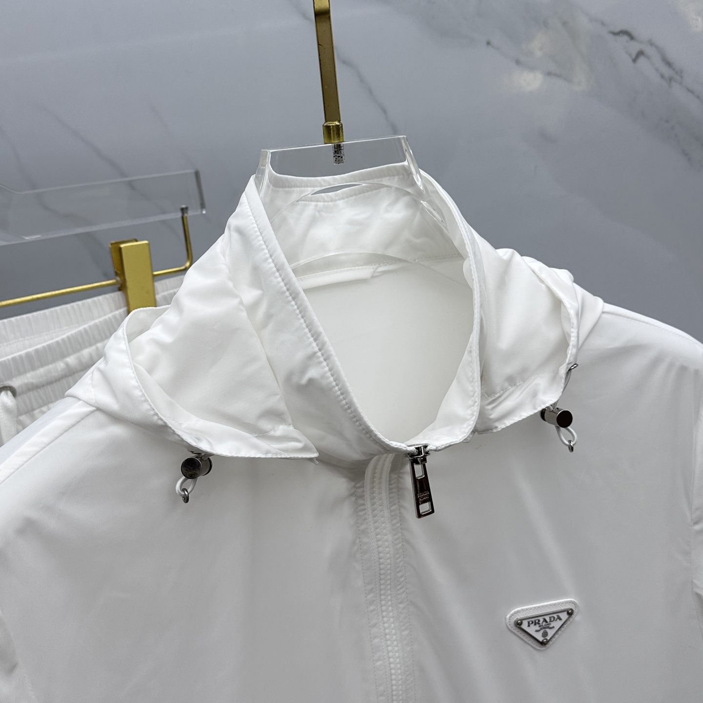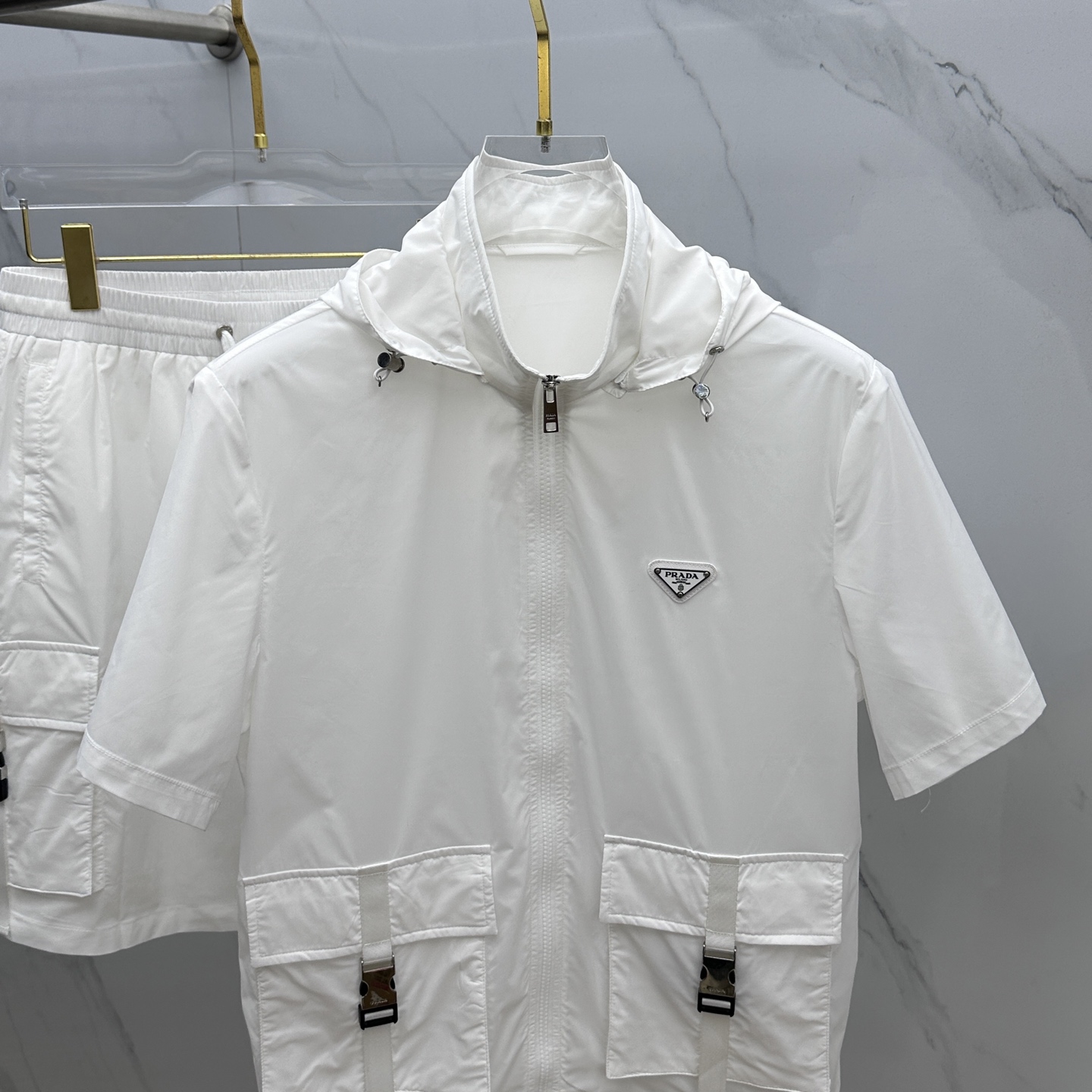 Prada men's Bermuda shorts set with logo. Features large pockets, high-density nylon, lightweight soft texture, drawstring waist, mesh lining, detachable hood. Full labels, sizes M-3XL.