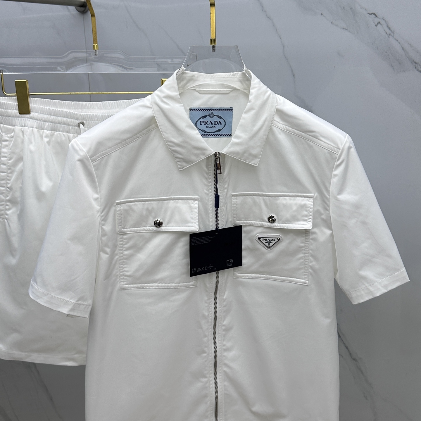 Prada men's logo re-nylon Bermuda shorts set. Custom high-density nylon, lightweight, soft, smooth. Elastic drawstring, mesh lining, meticulous craftsmanship. Full labels. Sizes M-3XL.