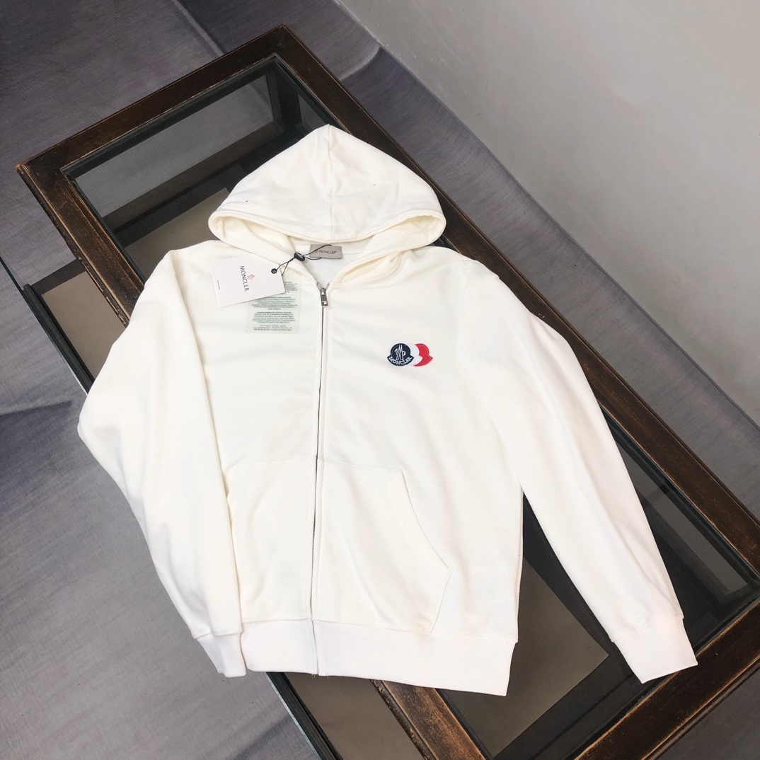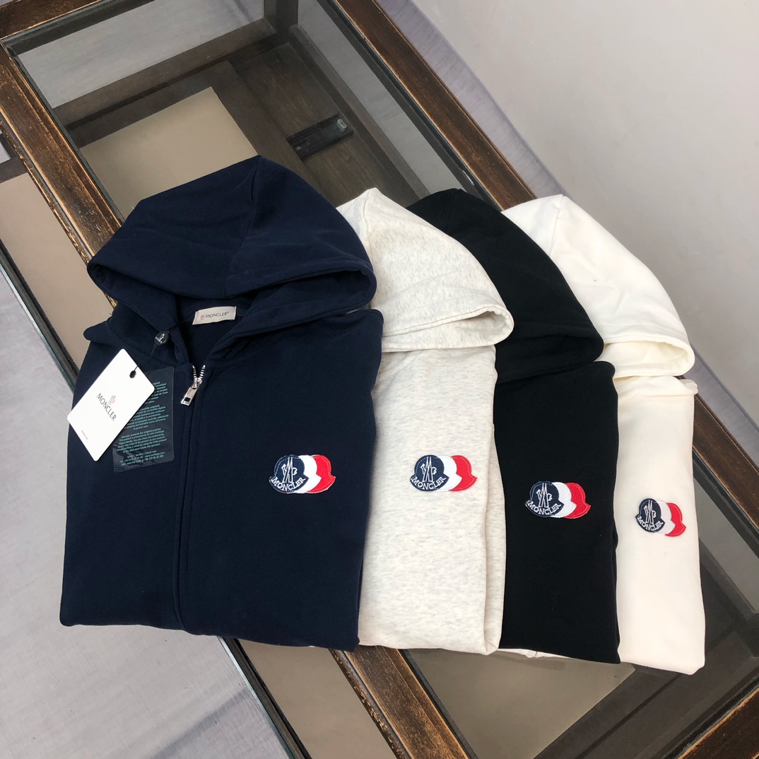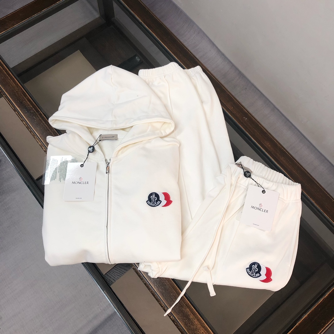Moncler 2025 early autumn new couple's hooded zip-up sweatshirt and straight-leg pants set. Custom 420g cotton, tailored fit, available in black, white, navy, gray. Sizes S to XXL.